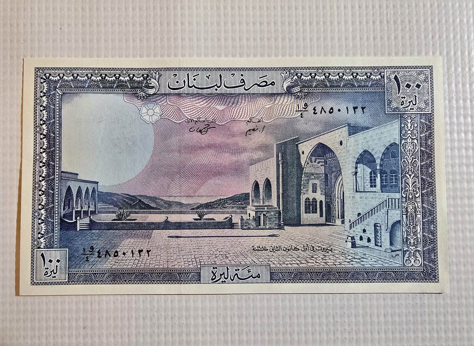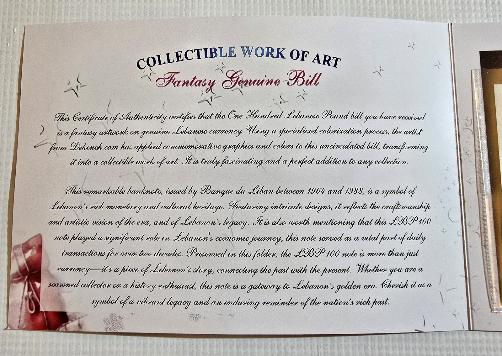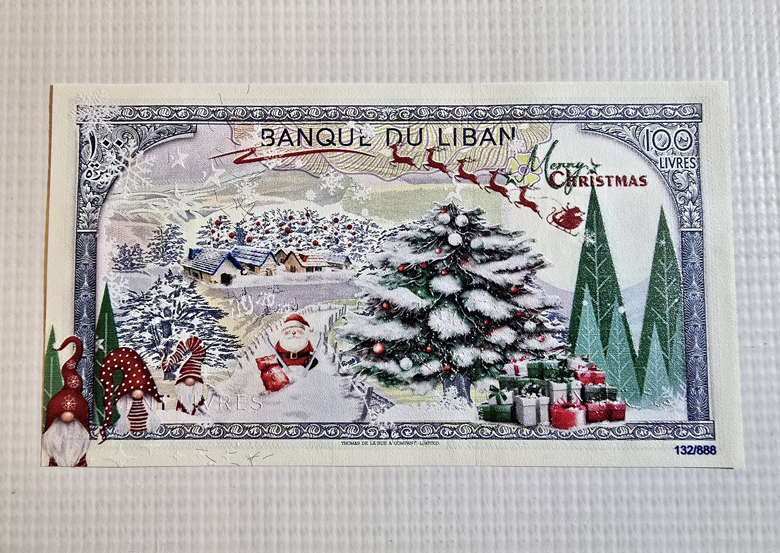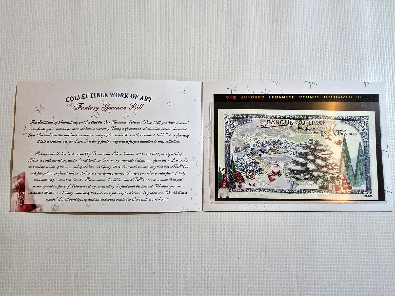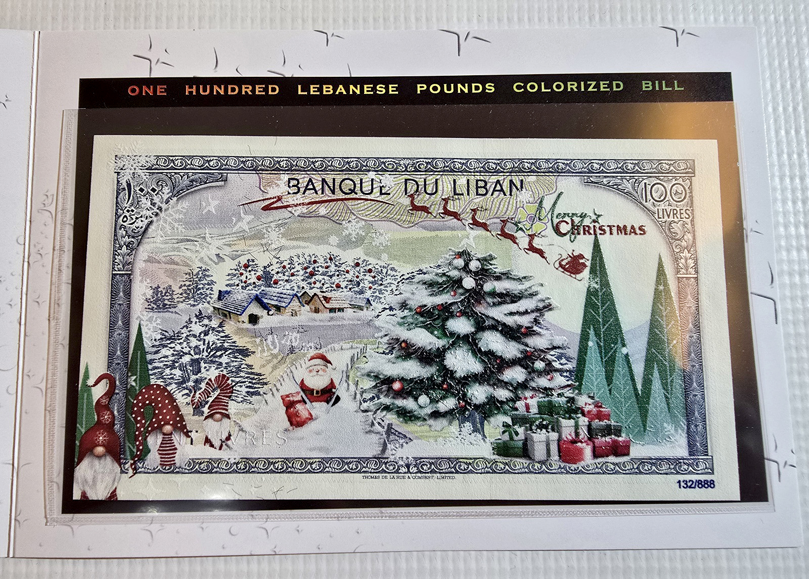 إصدار تذكاري قديم ونادر من مصرف لبنان لحساب شركة خاصة بمناسبة عيد الميلاد من فئة المائة ليرة موضوعة داخل كارت مطبوع بتصميم أنيق ومميز للغاية