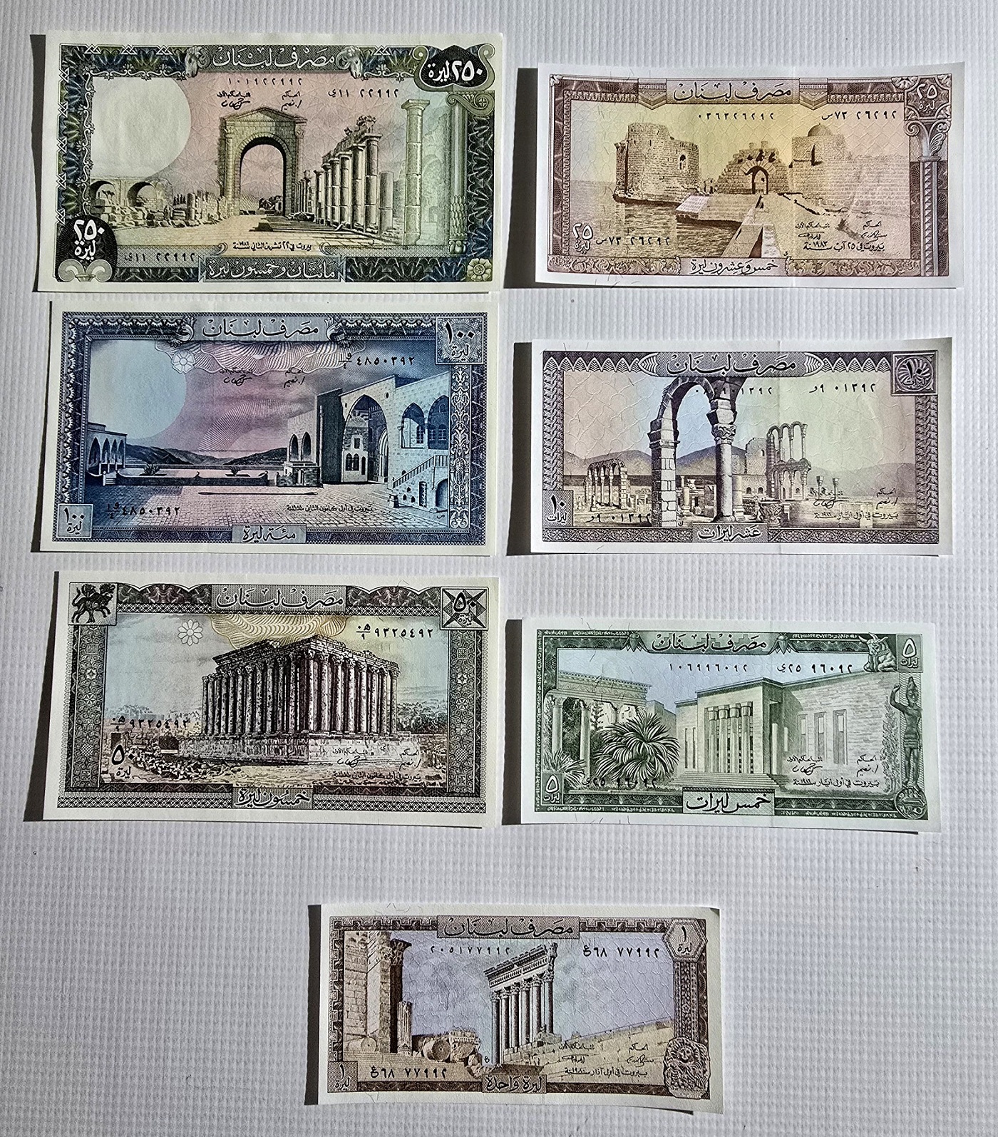 سبع عملات نقدية لبنانية قديمة من فئة ليرة واحدة إلى فئة مئتان وخمسون ليرة لبنانية