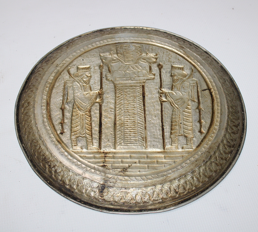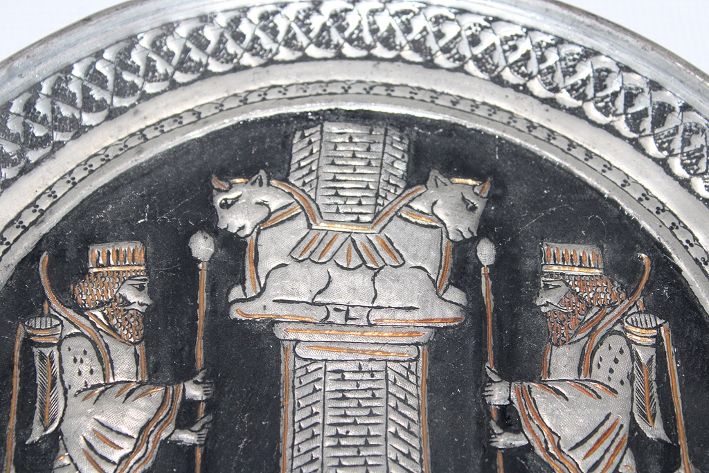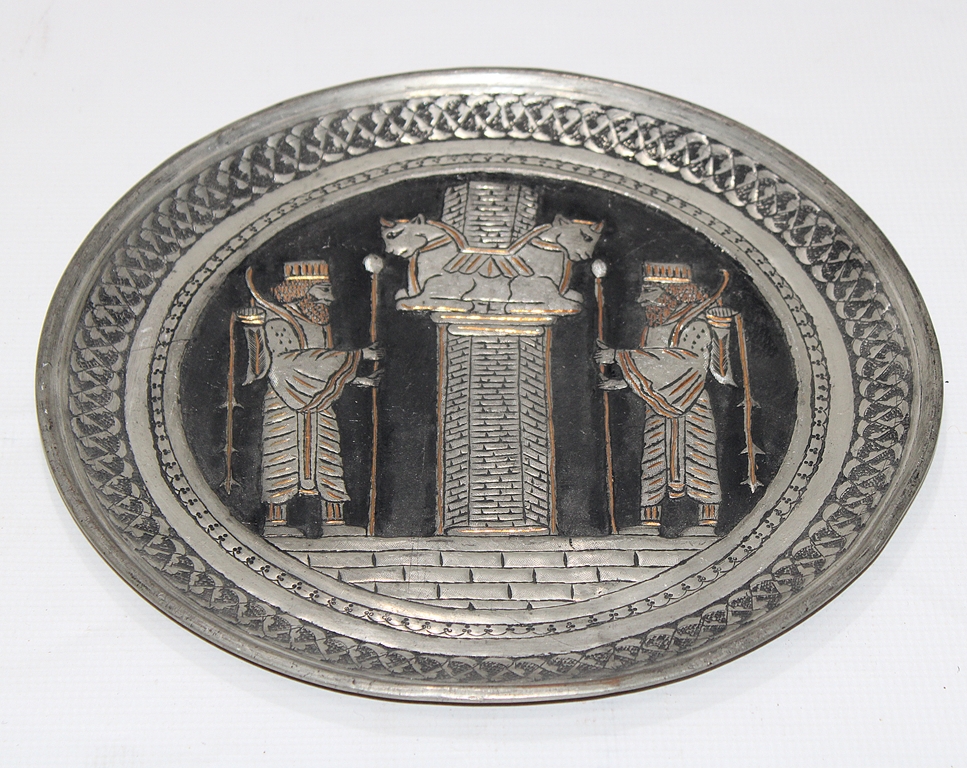 صحن نحاس عليه نقوش ورسوم بالفضة طرق يدوي بتصميم مميز جدا