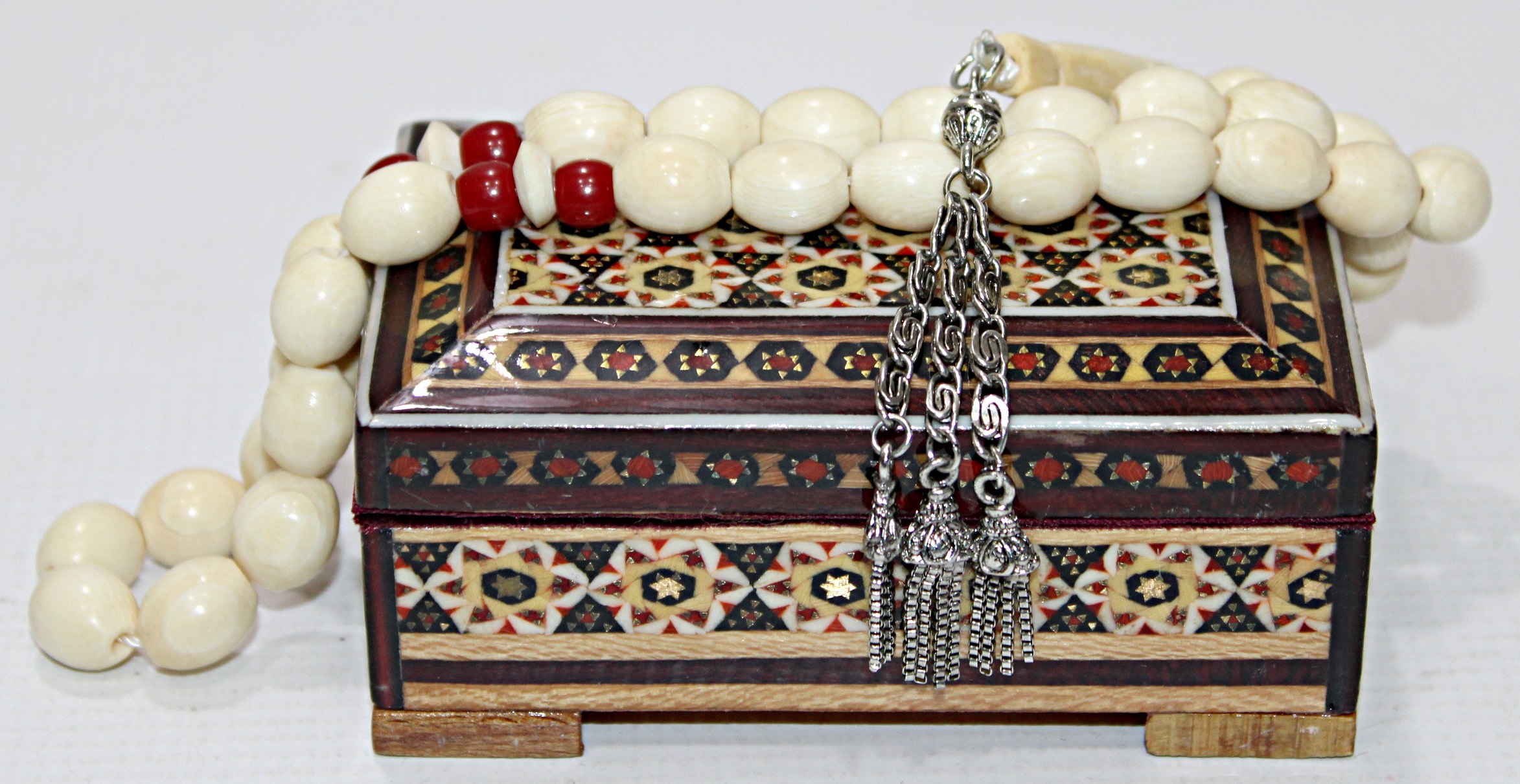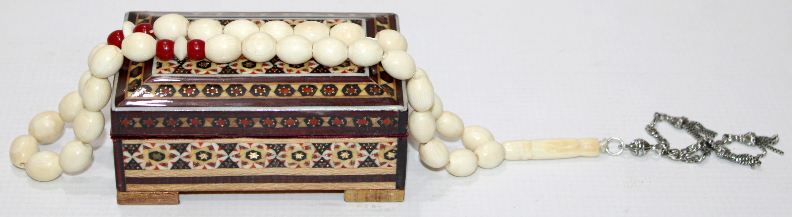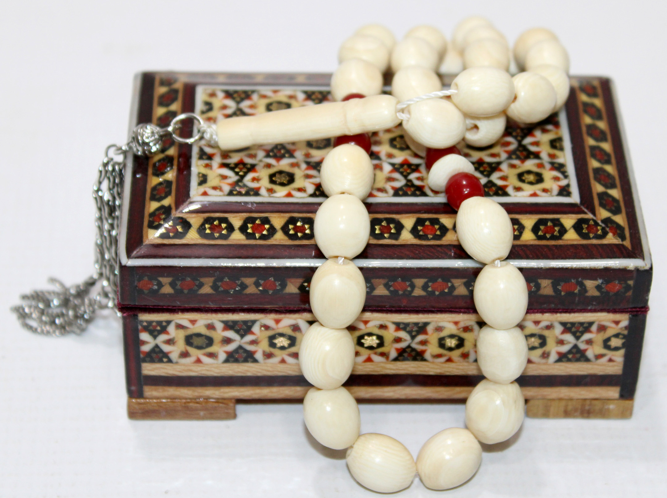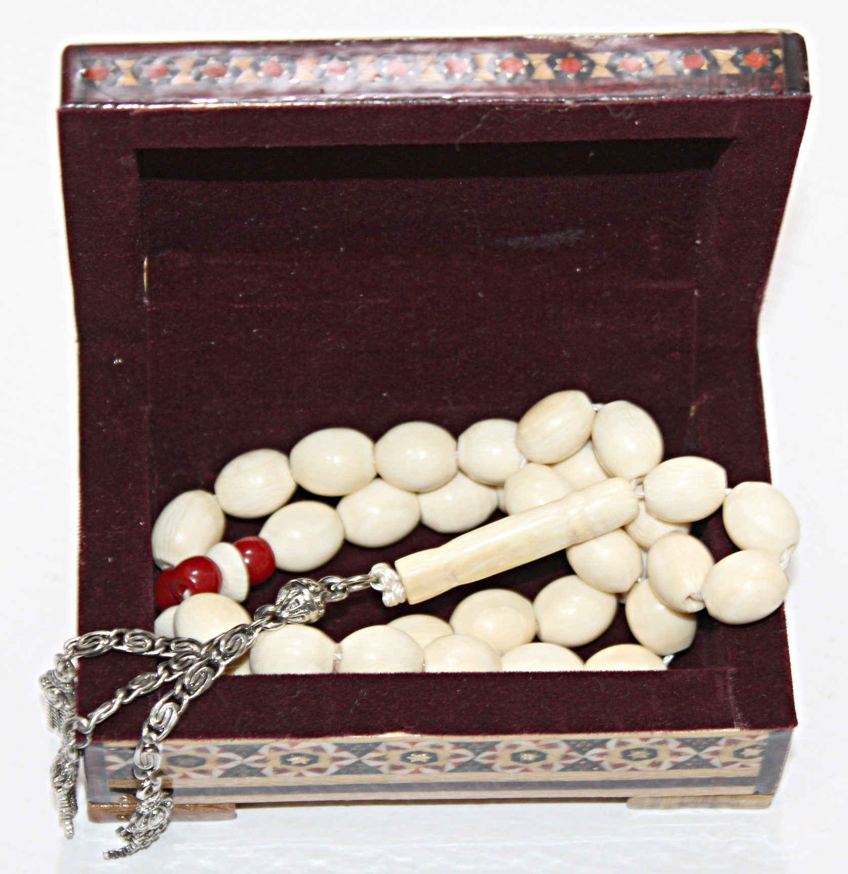 مسبحة حجرها عاج 100% أفريقي وشواهدها مرجان والشرابة آنتمون معها صندوق اصفهاني ملبس بتصميم انيق ومميز