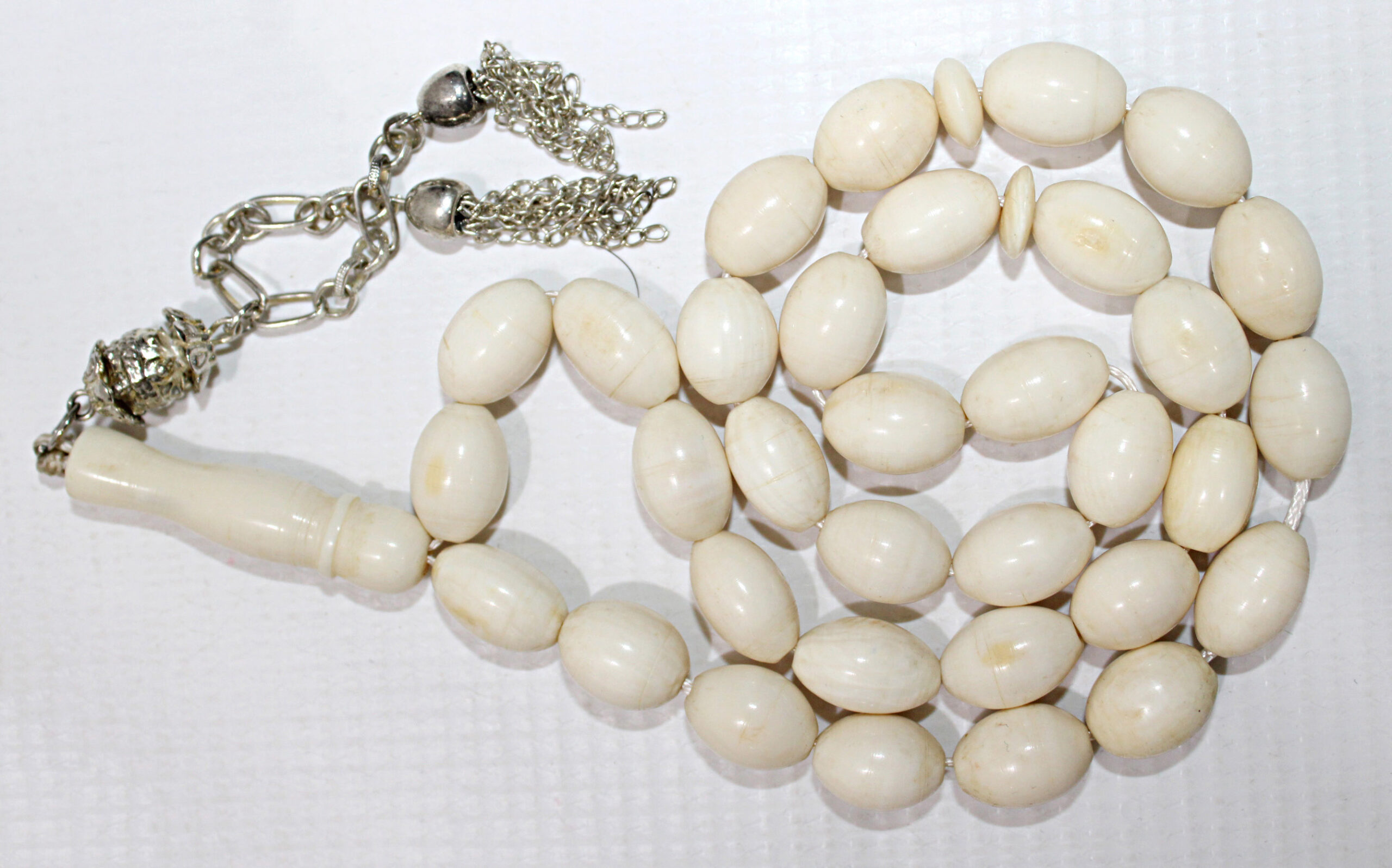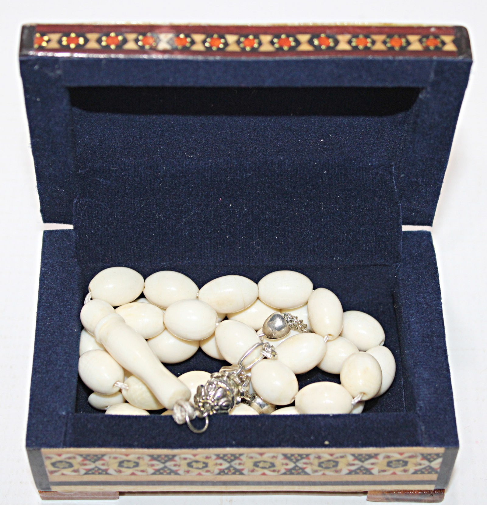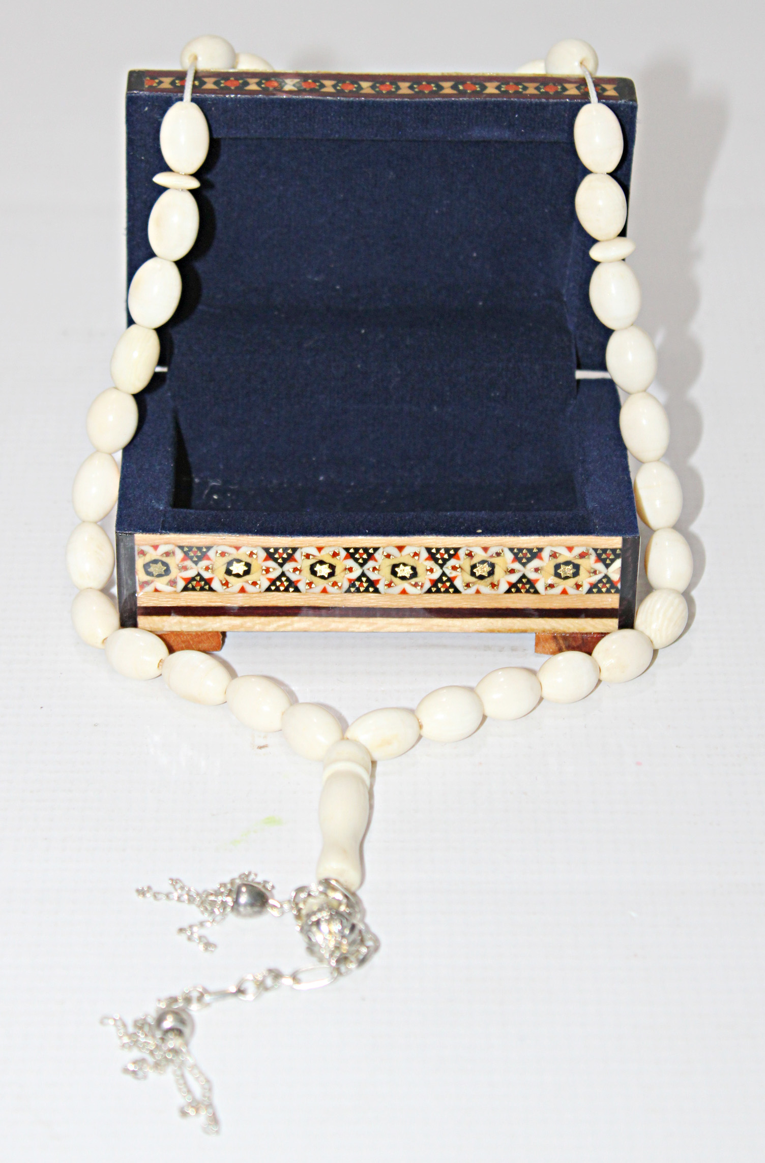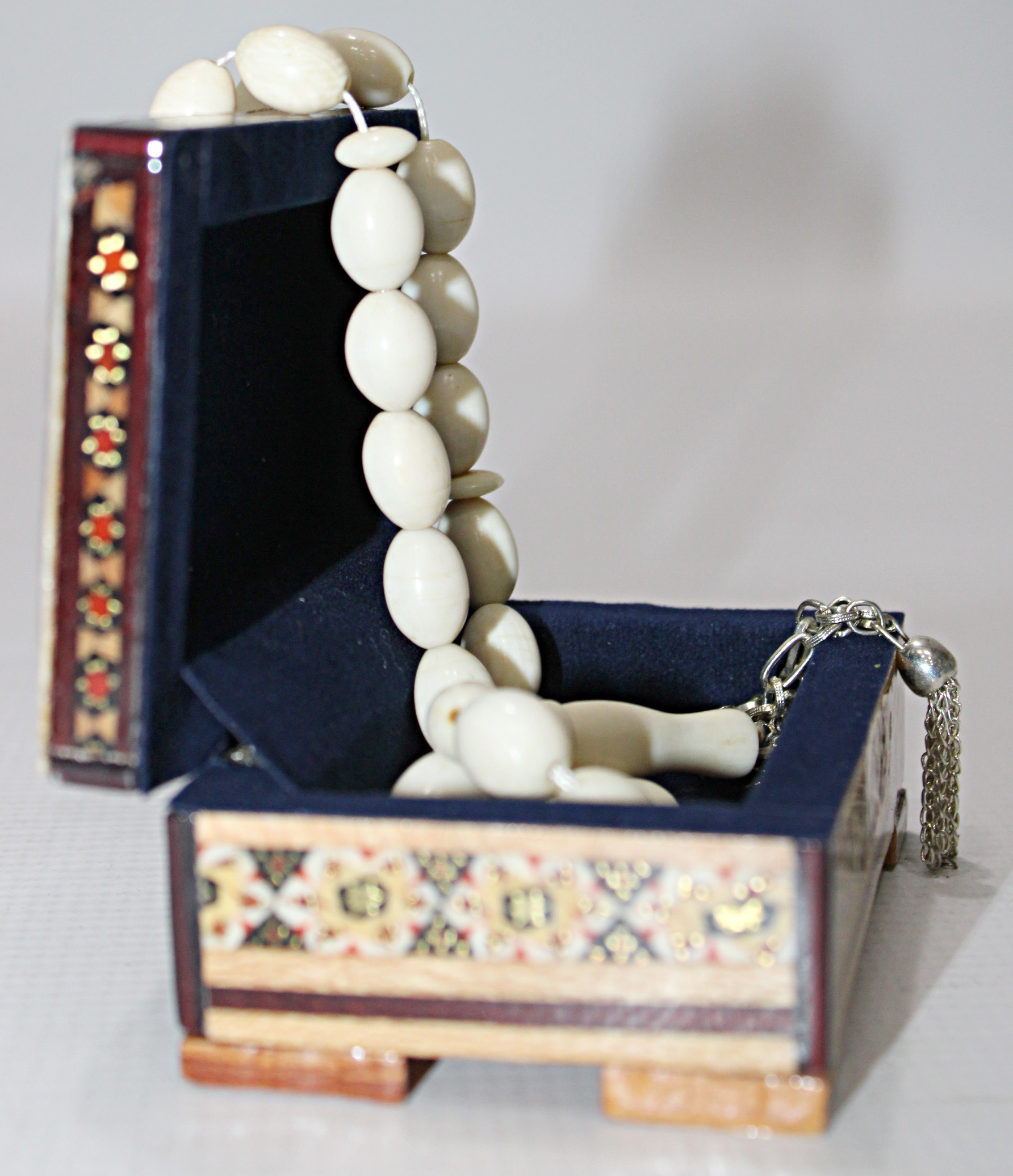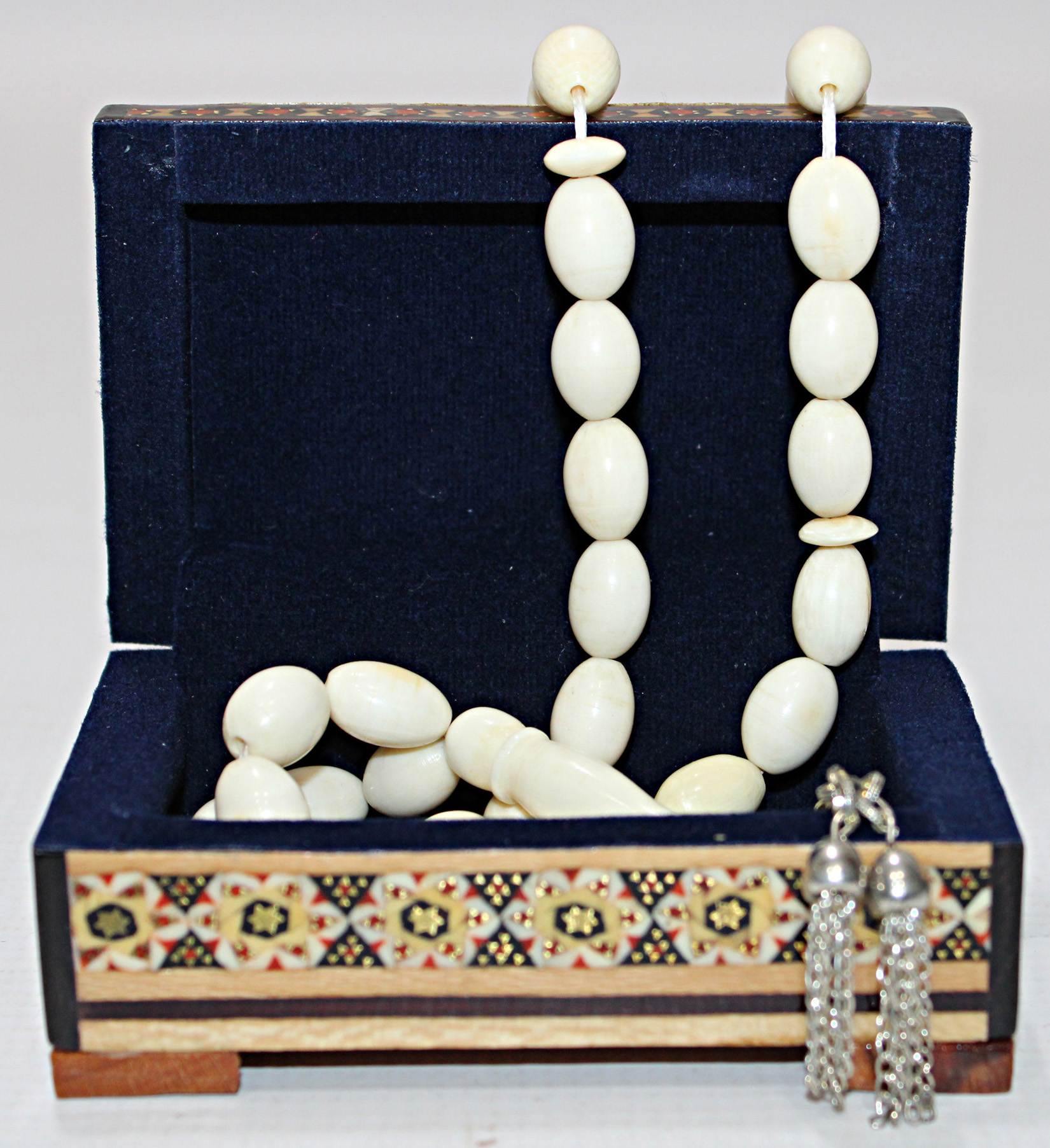 مسبحة حجرها عاج 100% أفريقي وشواهدها عاج والشرابة آنتمون معها صندوق اصفهاني ملبس بتصميم انيق ومميز