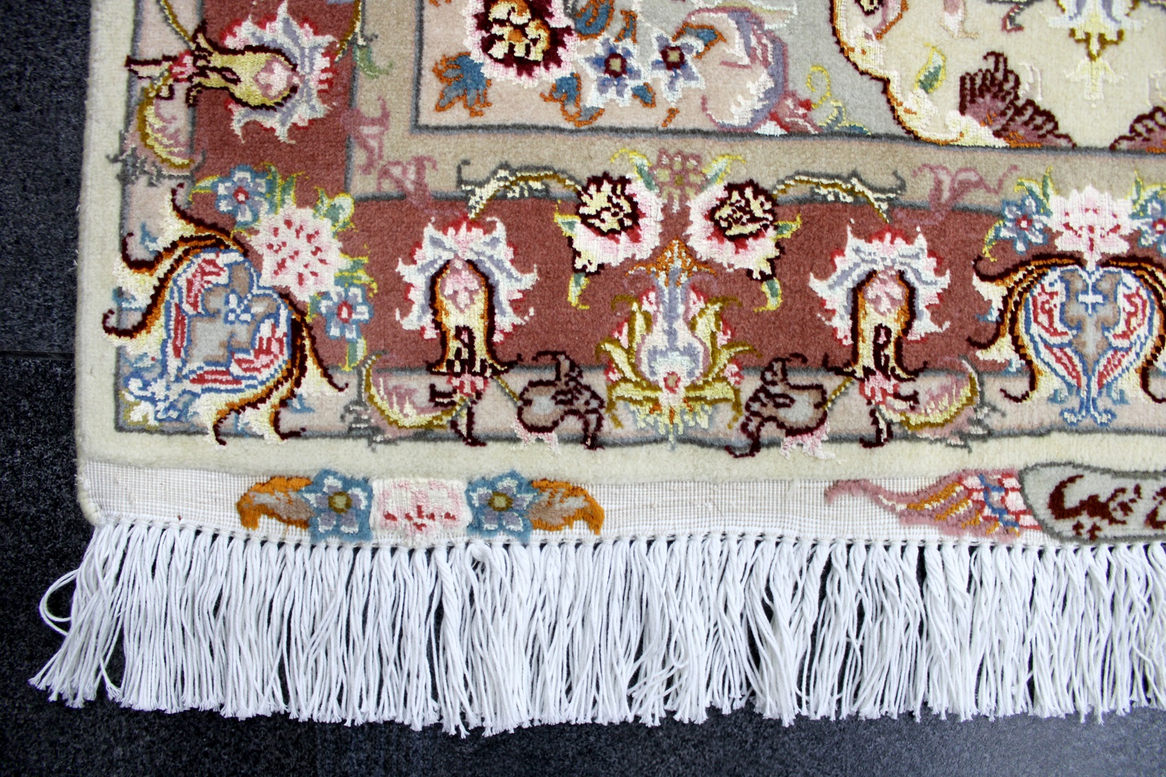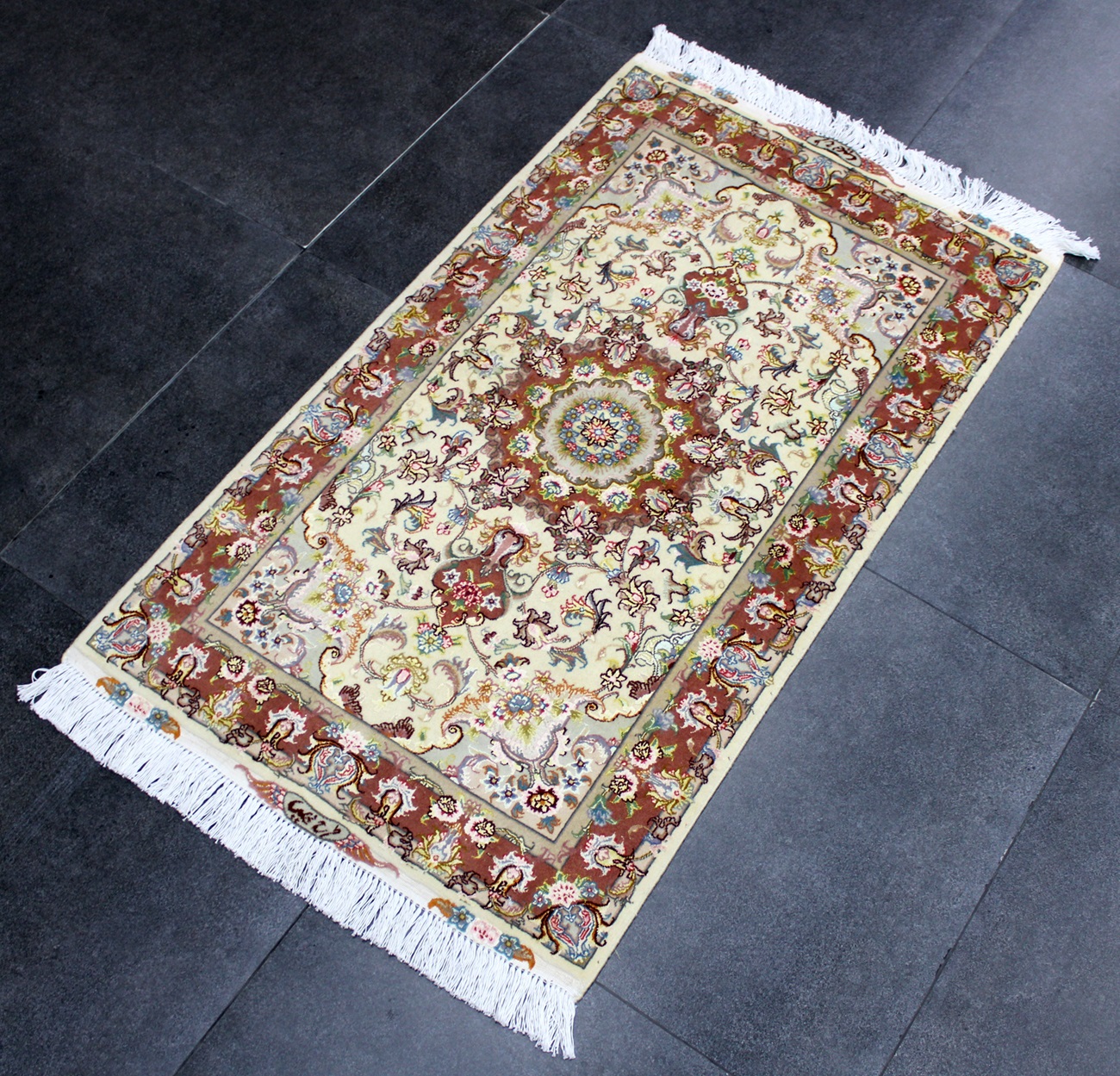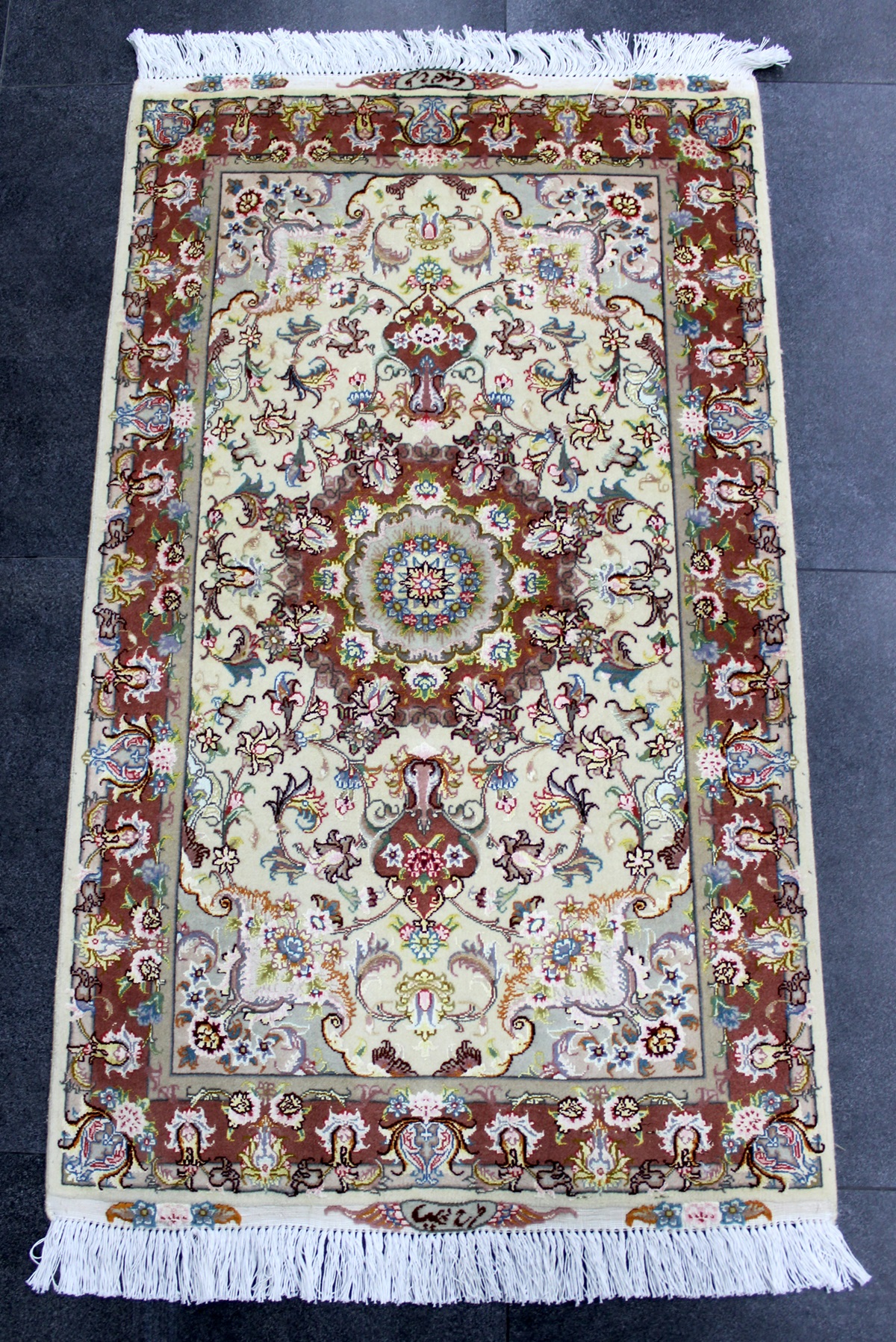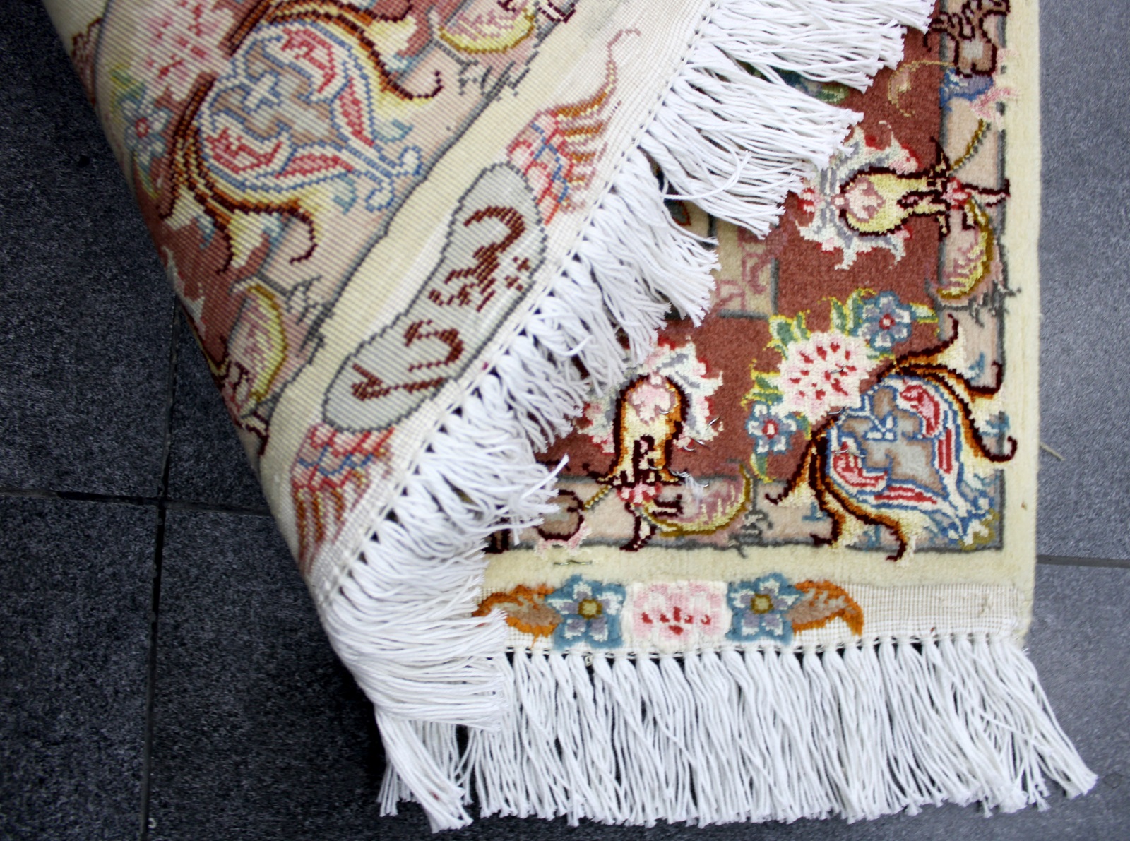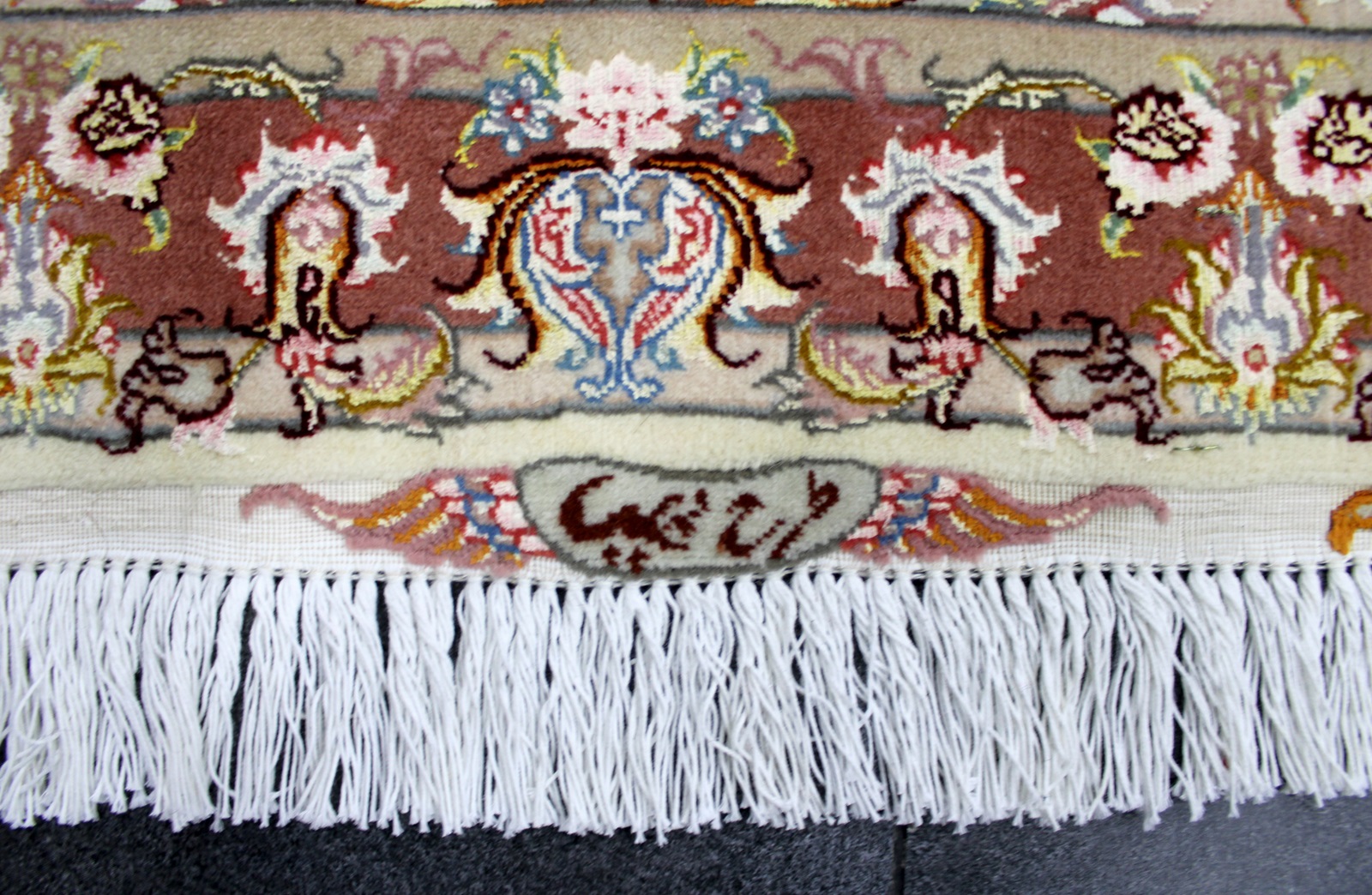 سجادة تبريز جوهر ممضية من الجهتين صوف كُرك وحرير وفيها 4 ألوان حرير وفيها 50 قطبة بالـ7سم شغل يدوي ايراني العجمي