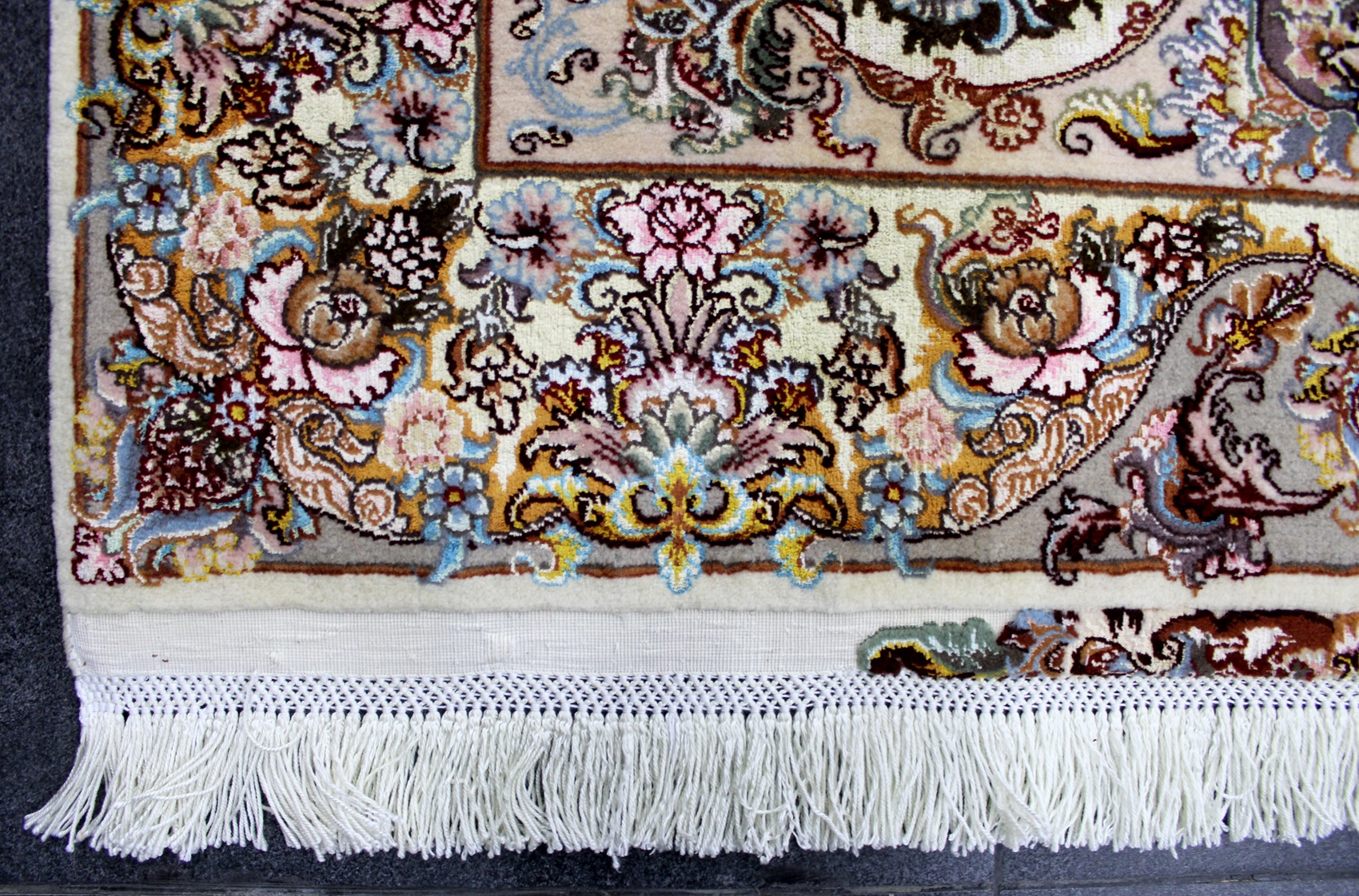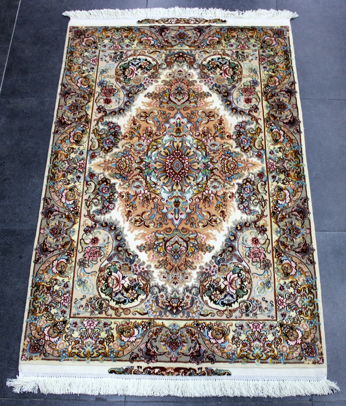 سجادة تبريز جوهر ممضية (طرح خطيبي) عمرها فوق 5 سنين صوف كُرك وكفين حرير (85% من السجادة حرير) فيها 50 قطبة بالـ7سم شغل يدوي ايراني العجمي