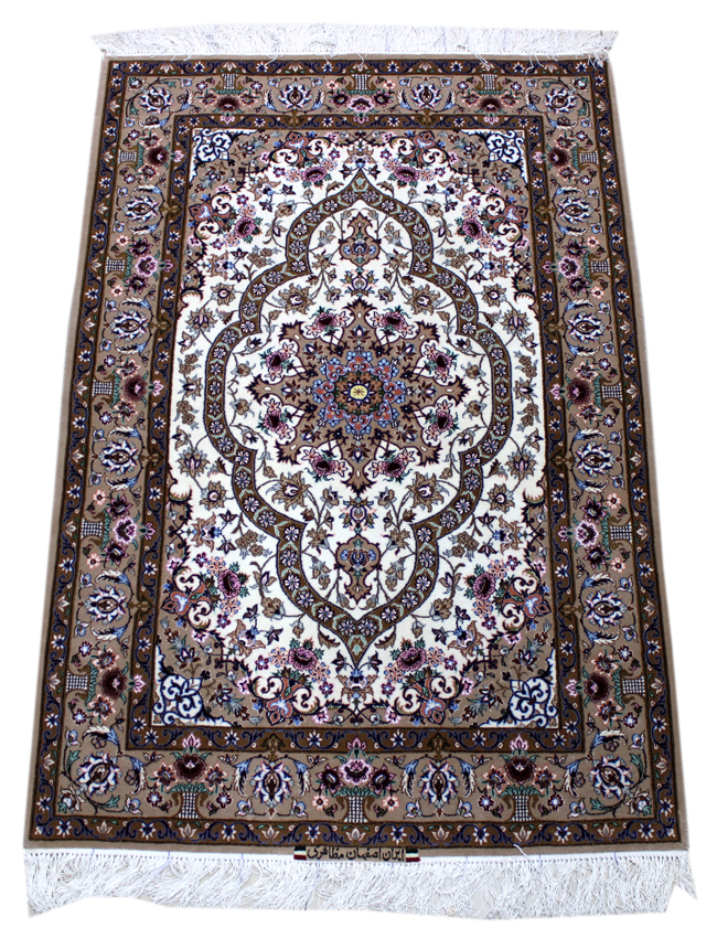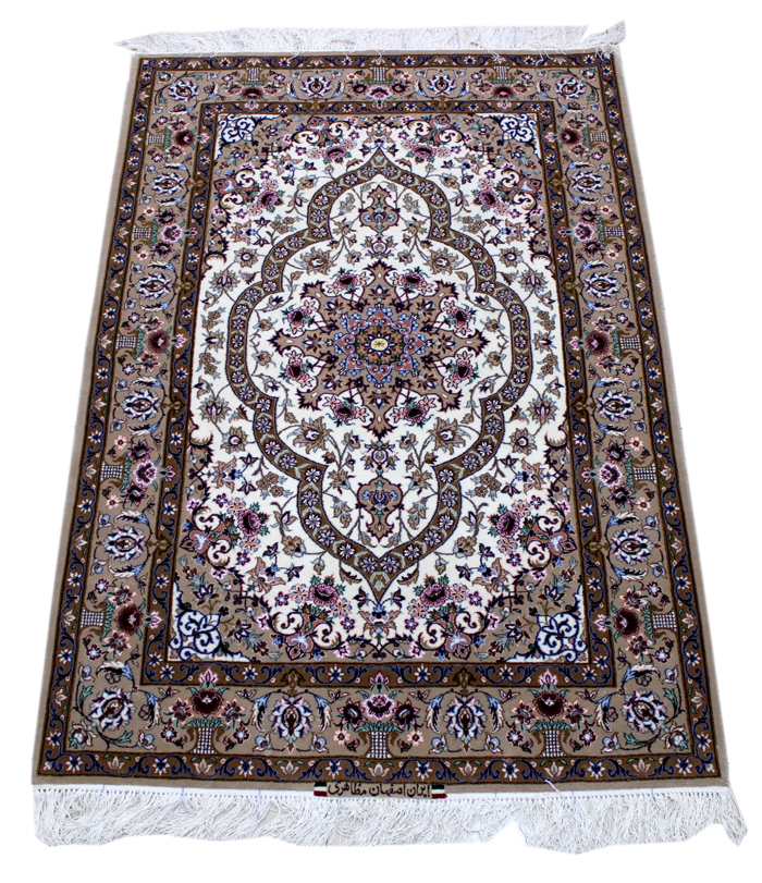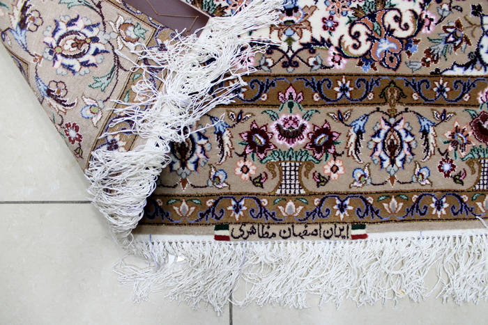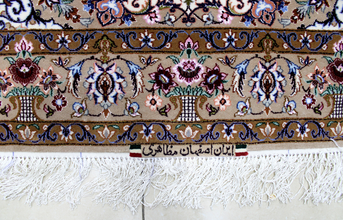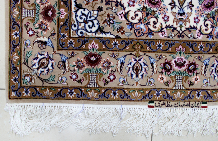 سجادة اصفهان ممضية مظاهري صوف كُرك وحرير وفيها 60 قطبة بالـ7سم شغل يدوي ايراني العجمي