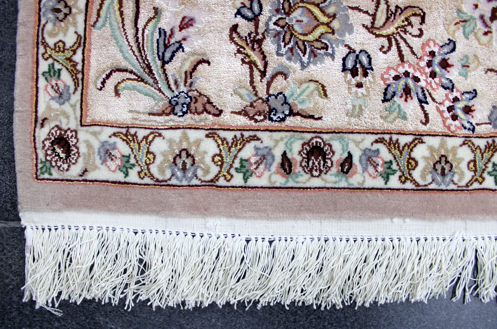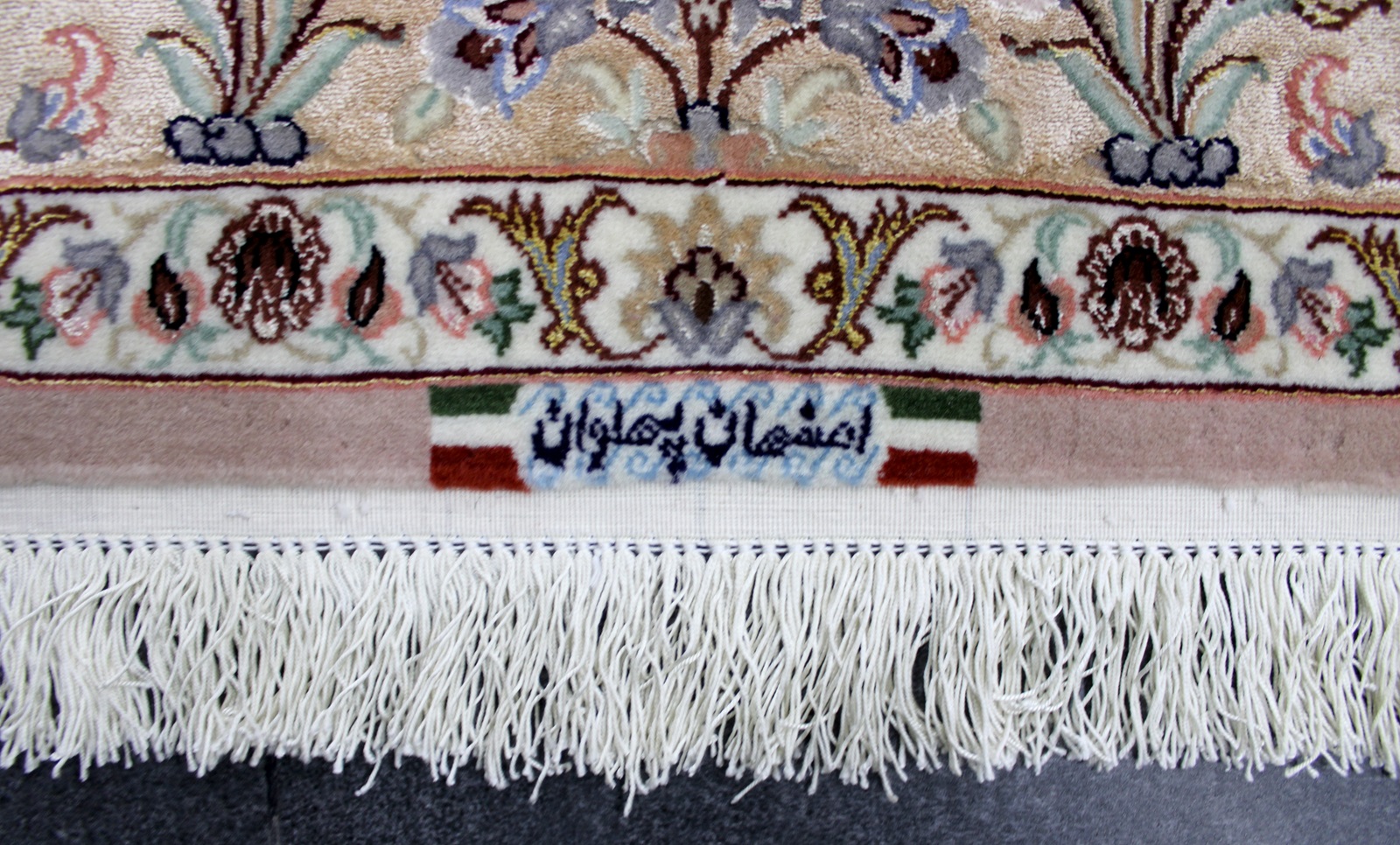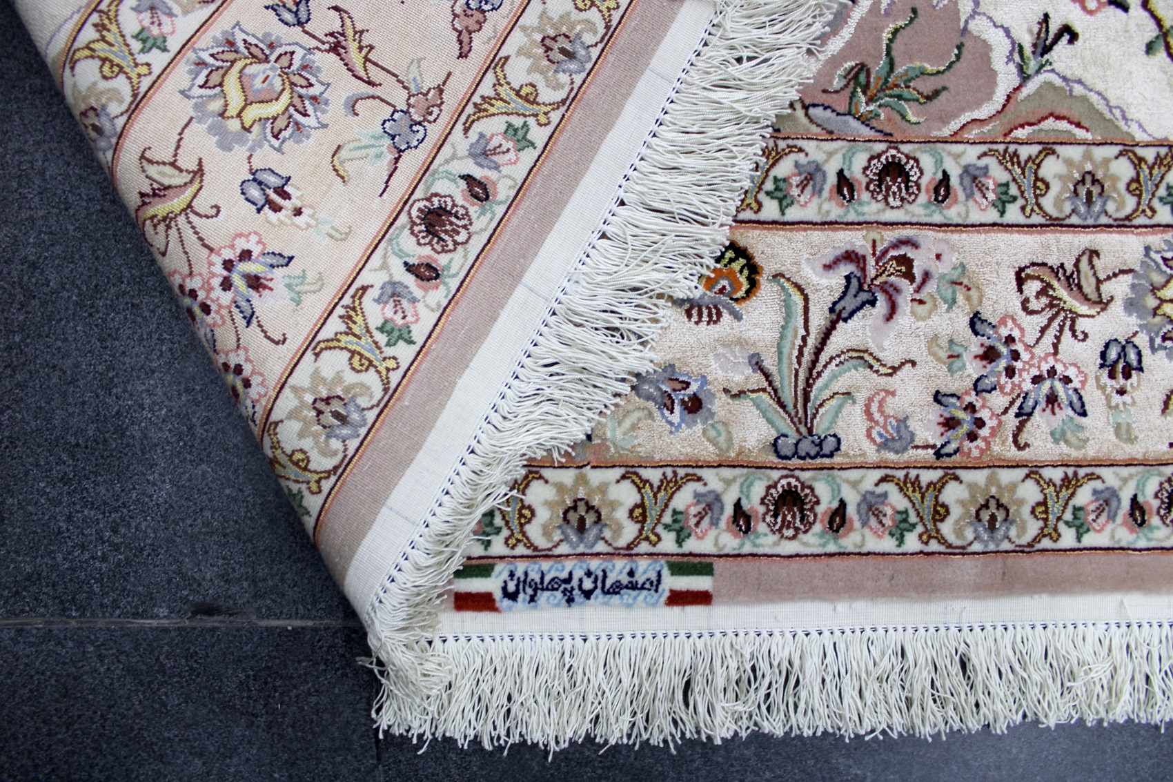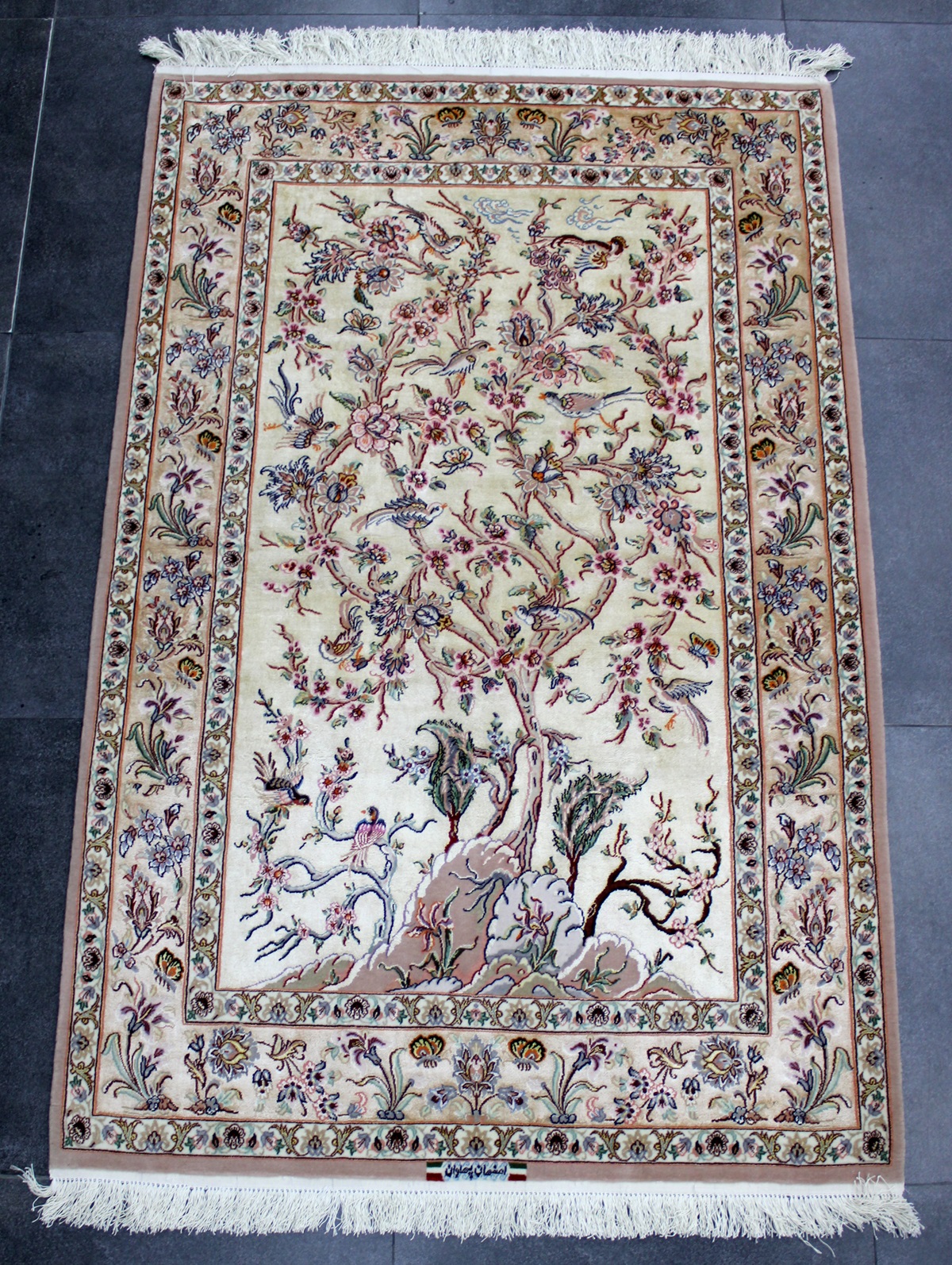 سجادة أصفهان ممضية (بهلوان) نقشة شجرة الحياة صوف كُرك وكفين حرير (90% من السجادة حرير) فيها 60 قطبة بالـ7سم شغل يدوي ايراني العجمي