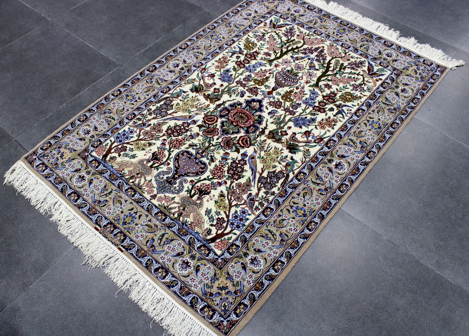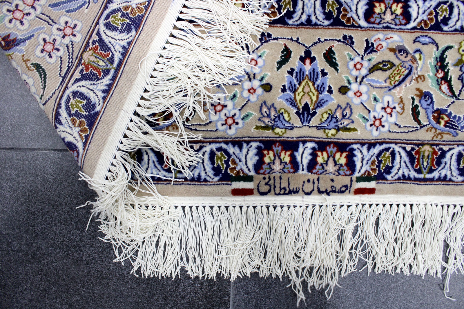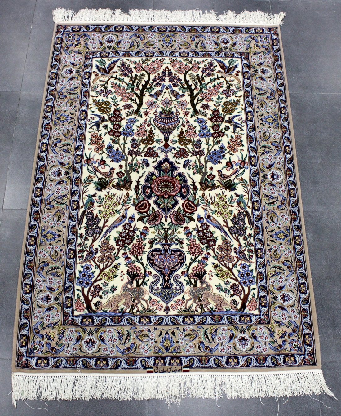 سجادة أصفهان نقشة شجرة الحياة ممضية سلطاني صوف كُرك وحرير وفيها 60 قطبة بالـ7سم شغل يدوي ايراني العجمي