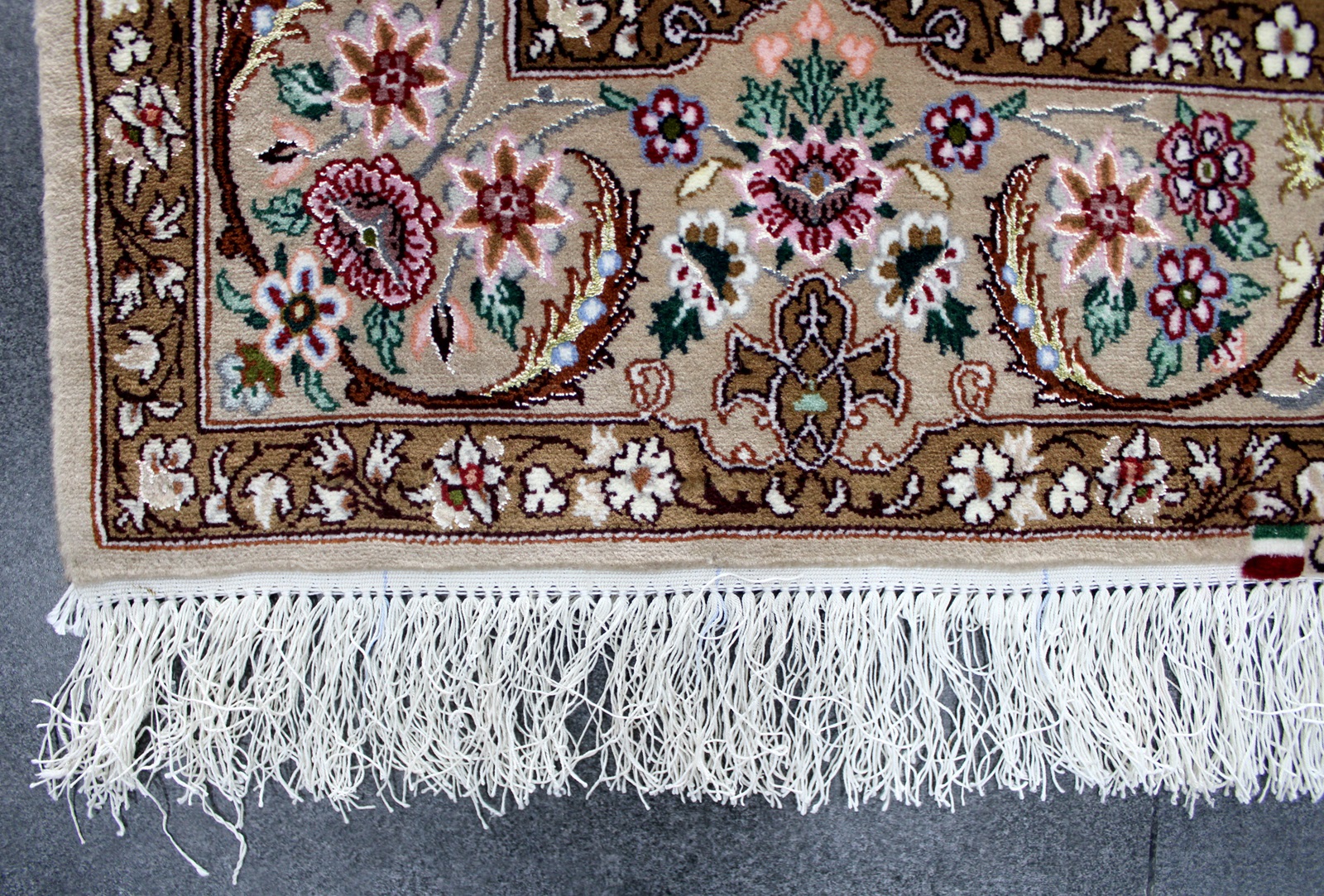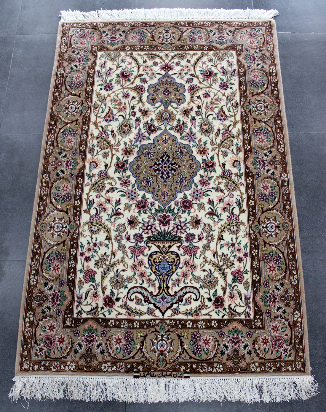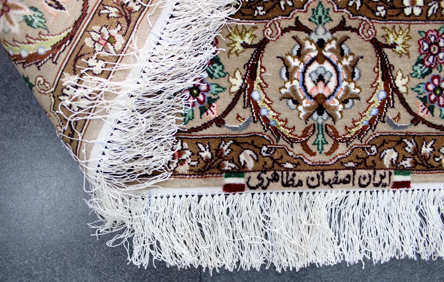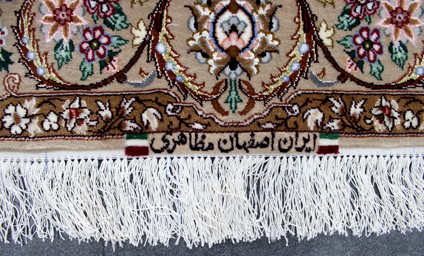 سجادة أصفهان تابلو ممضية (أصفهان مظاهري) صوف كُرك ولونين حرير فيها 60 قطبة بالـ7سم شغل يدوي ايراني العجمي
