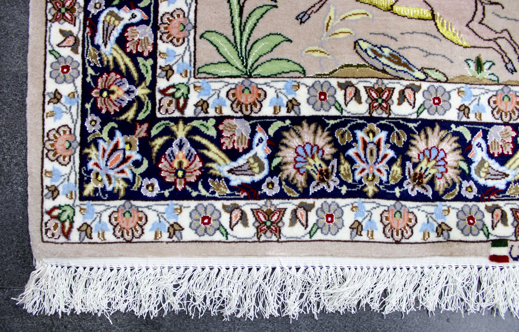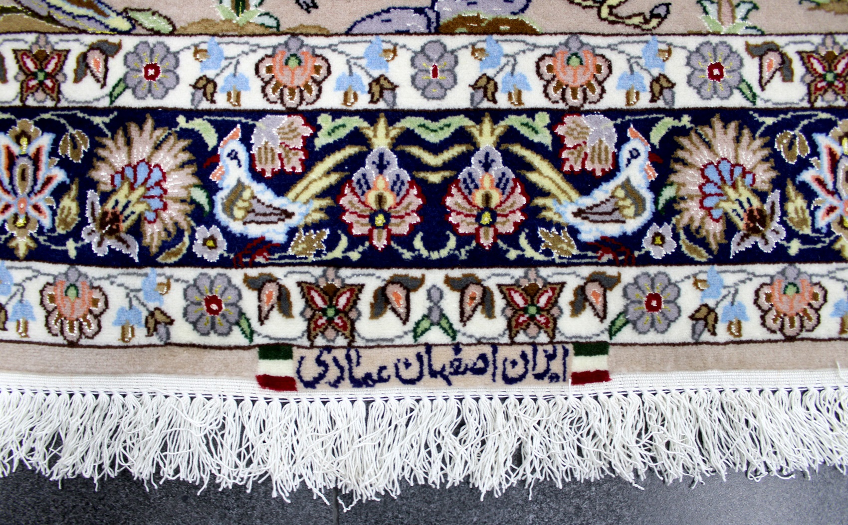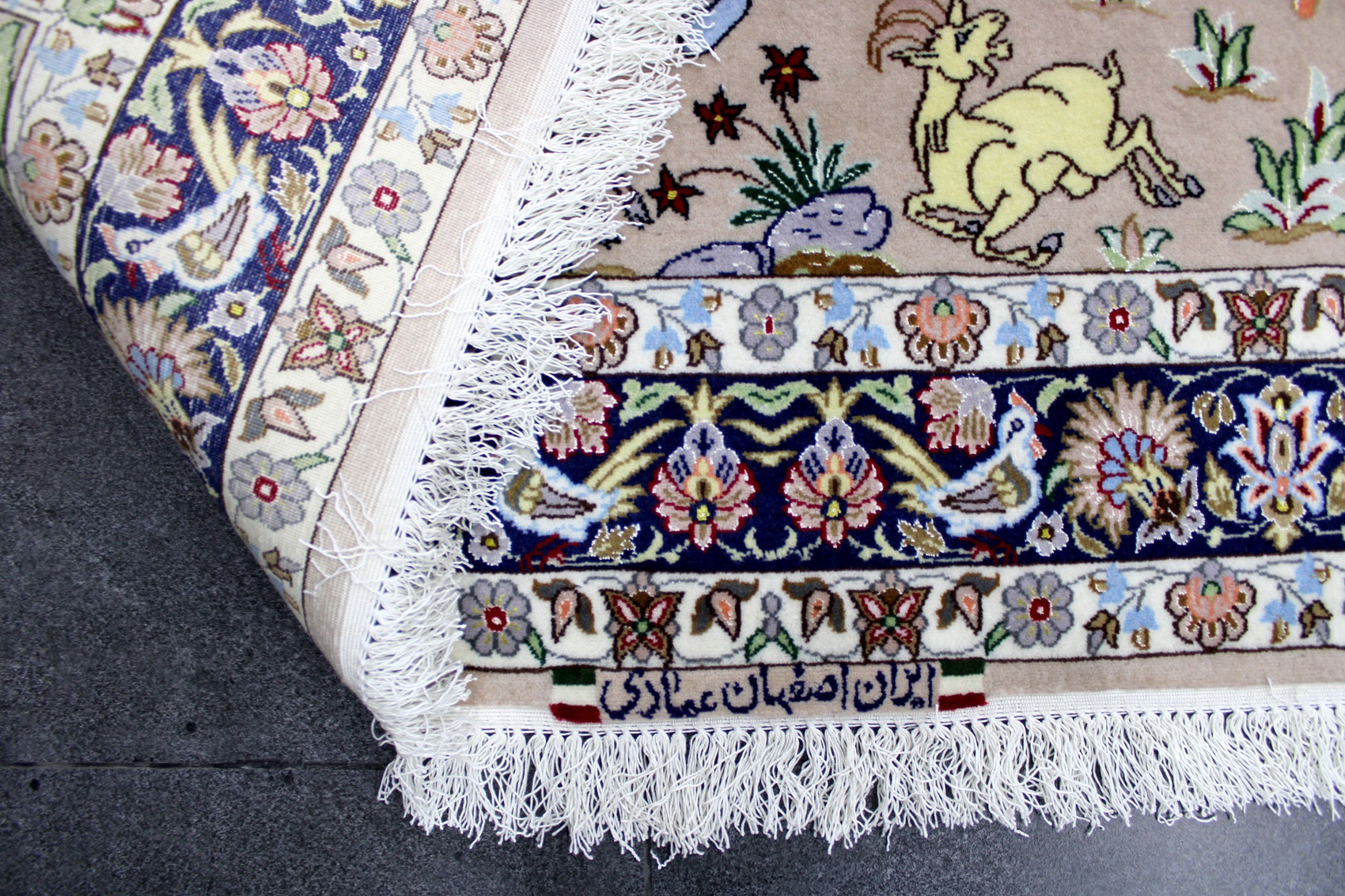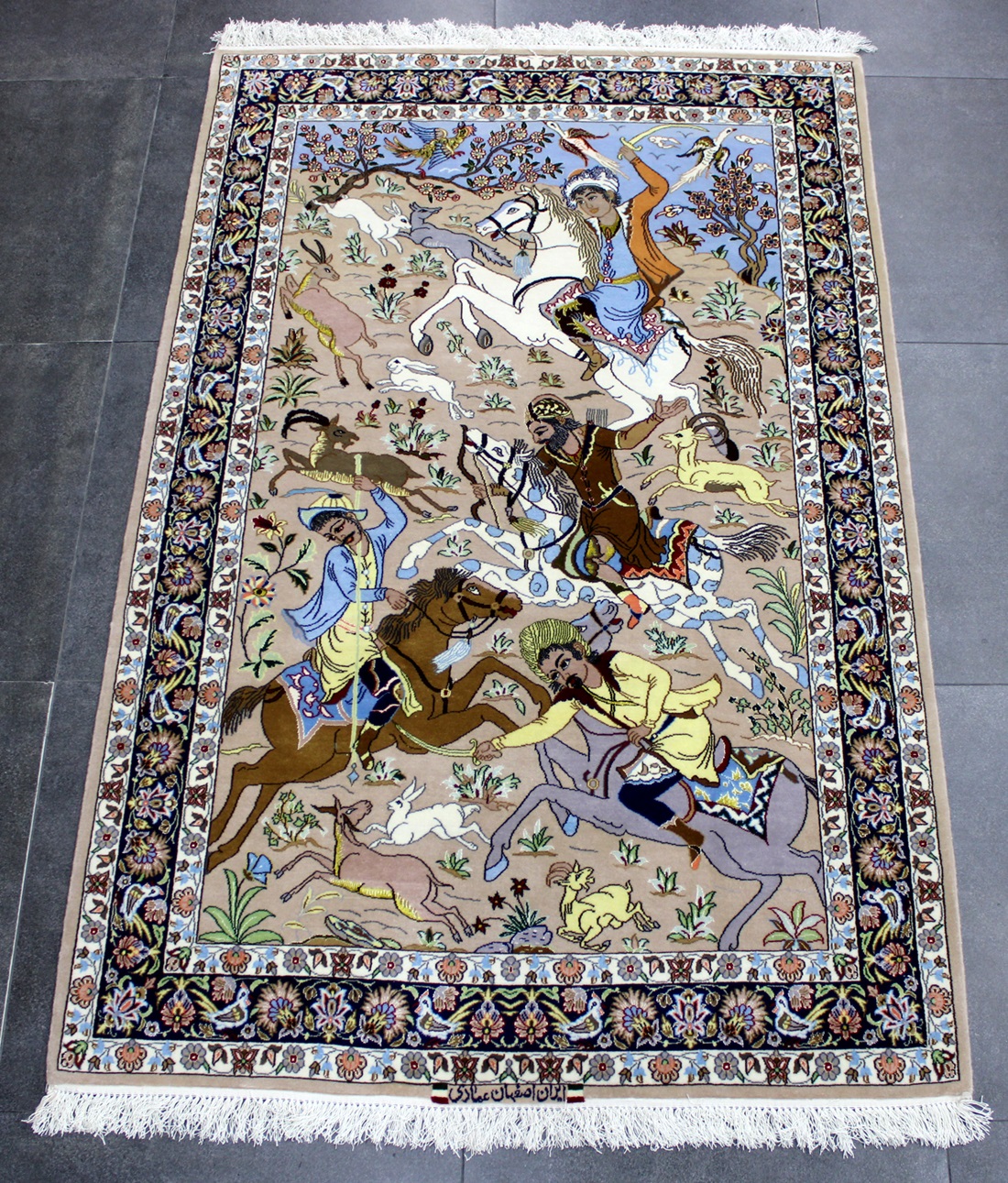 سجادة أصفهان ممضية (عمادي) نقشة رحلة صيد صوف كُرك ولونين حرير فيها 60 قطبة بالـ7سم شغل يدوي ايراني العجمي