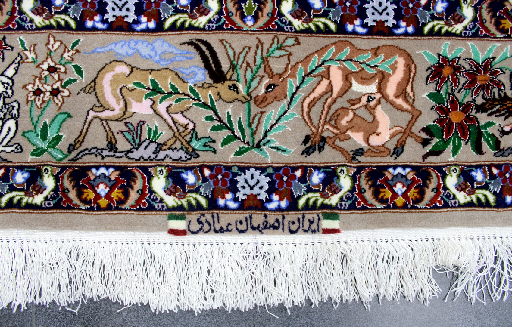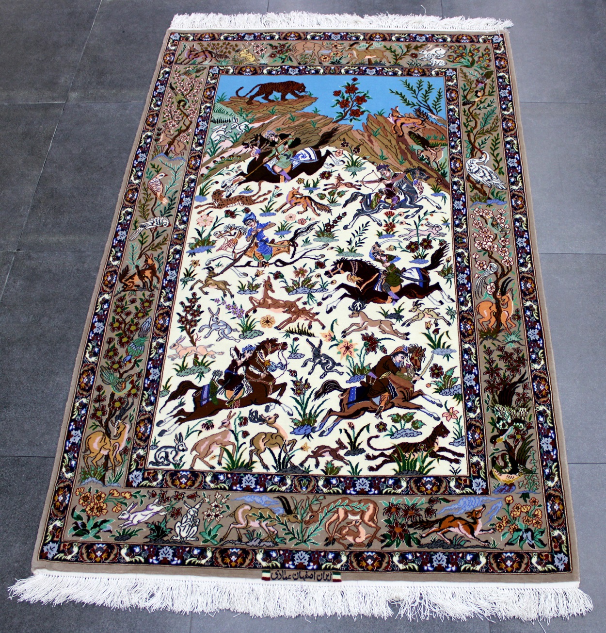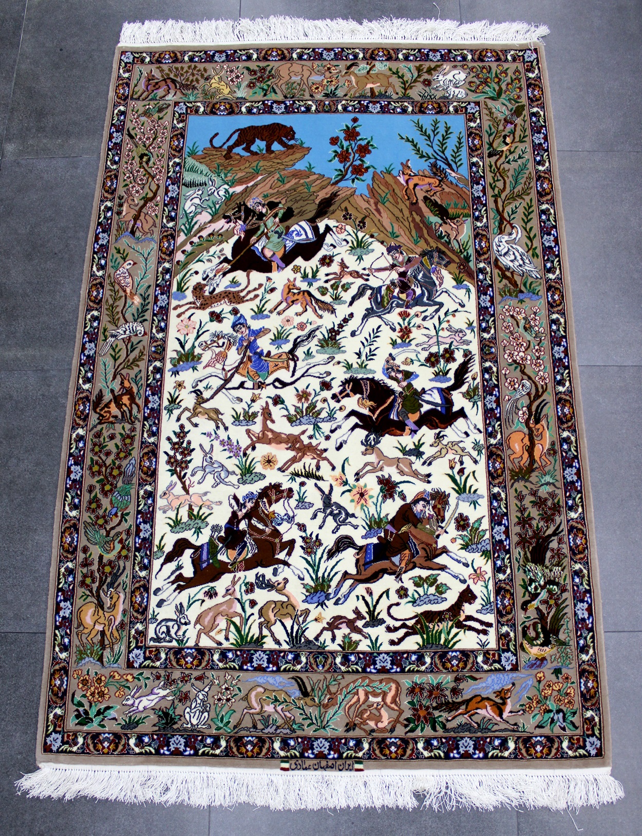 سجادة أصفهان ممضية (عمادي) نقشة رحلة صيد صوف كُرك وحرير وفيها 3 ألوان حرير ومد حرير وفيها 60 قطبة بالـ7سم شغل يدوي ايراني العجمي