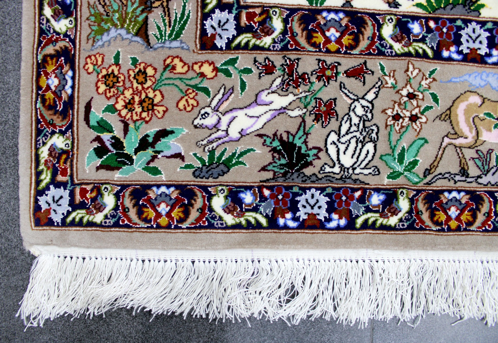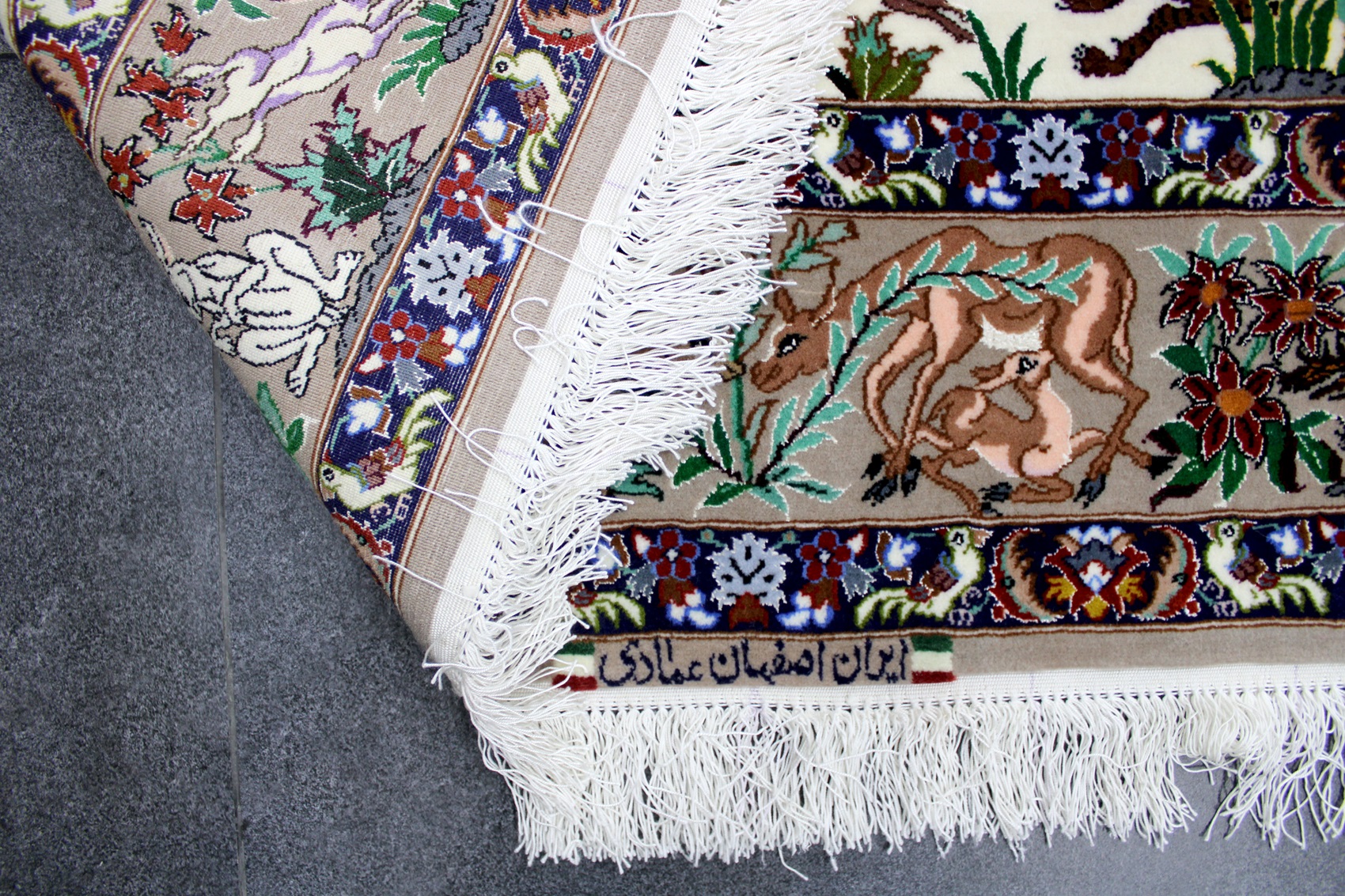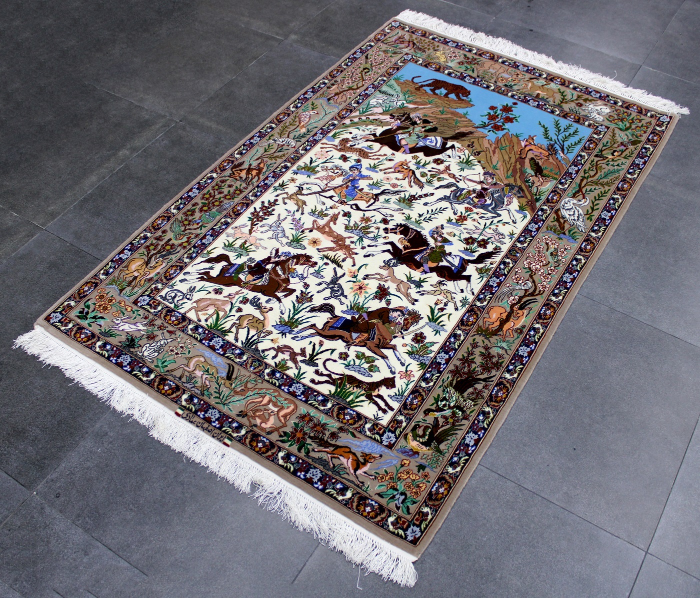 سجادة أصفهان ممضية (عمادي) نقشة رحلة صيد صوف كُرك وحرير وفيها 3 ألوان حرير ومد حرير وفيها 60 قطبة بالـ7سم شغل يدوي ايراني العجمي
