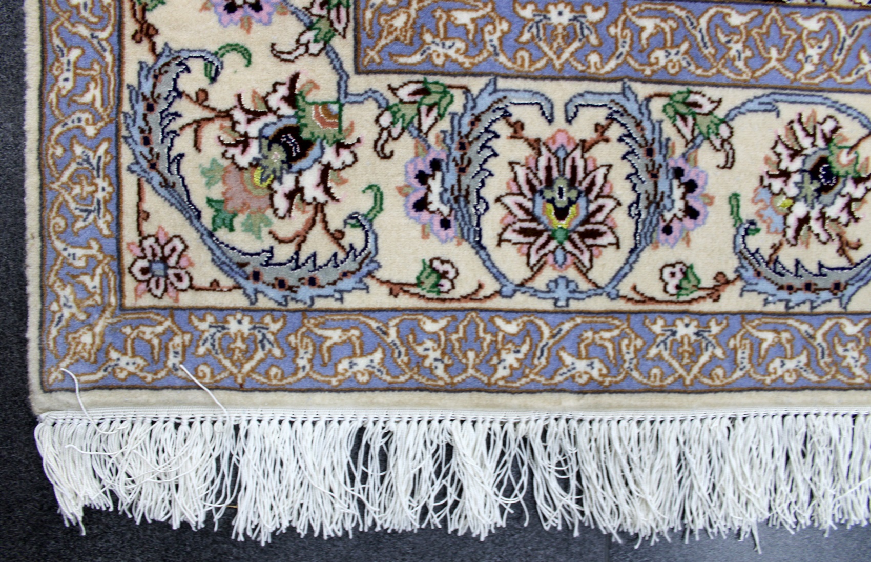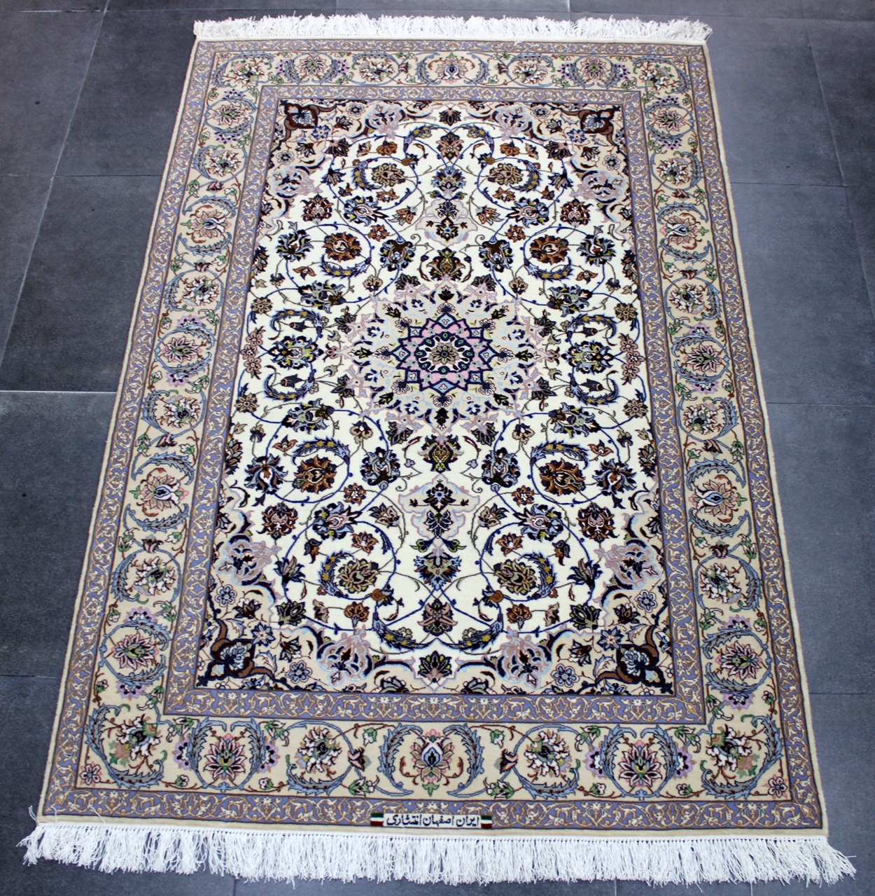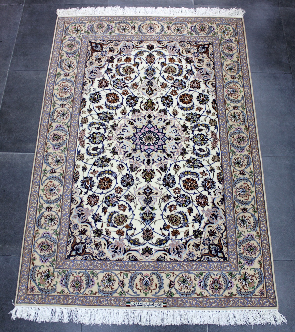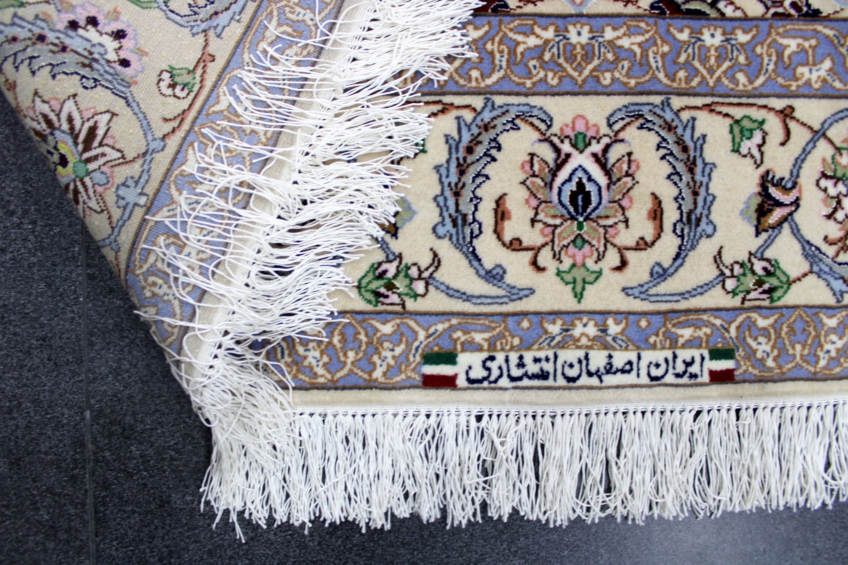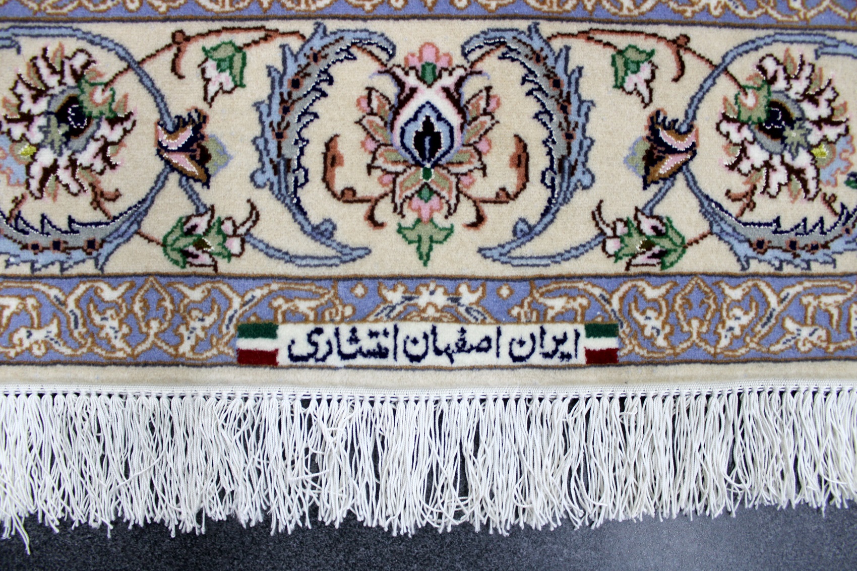 سجادة أصفهان ممضية (انتشاري) صوف كُرك وحرير وفيها لونين حرير وفيها 60 قطبة بالـ7سم شغل يدوي ايراني العجمي