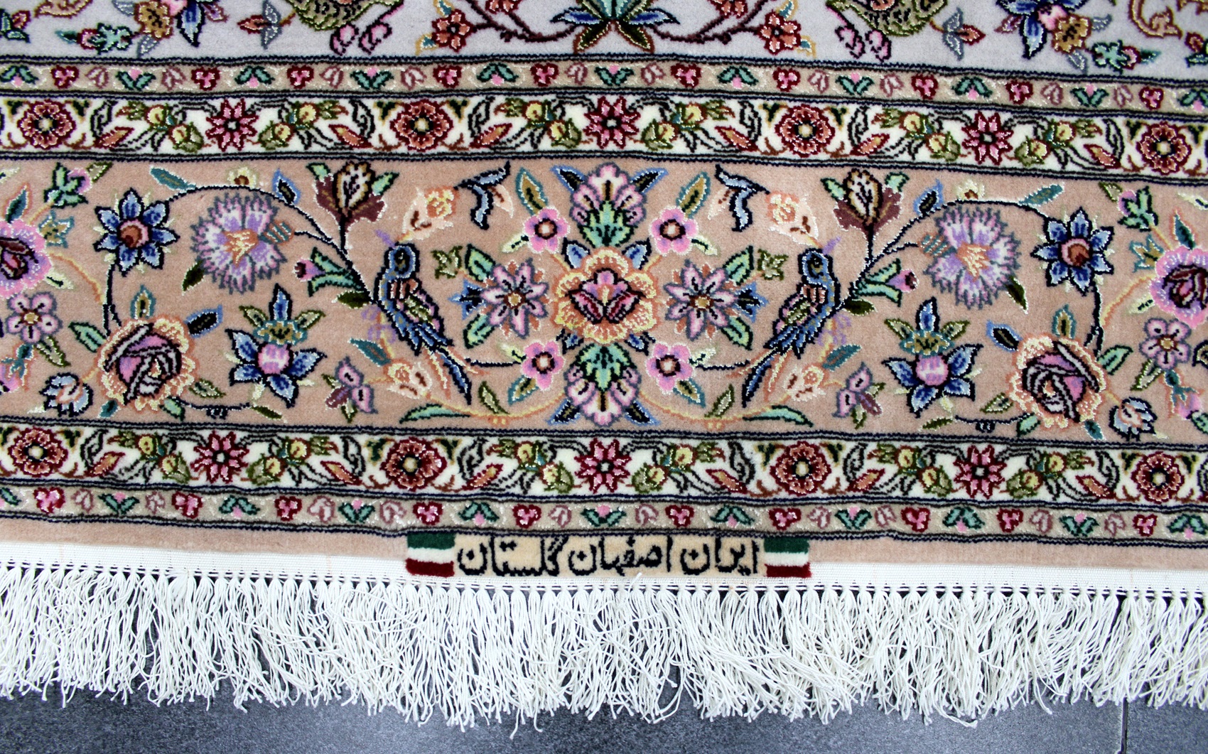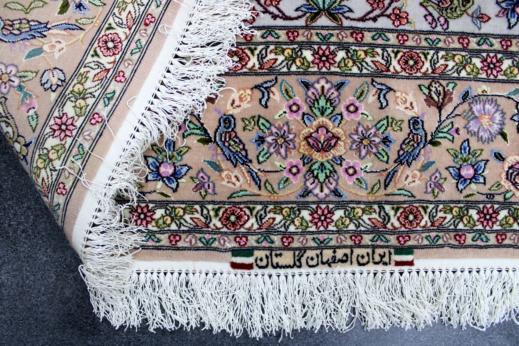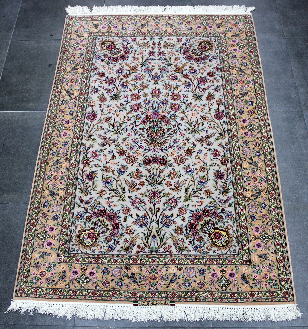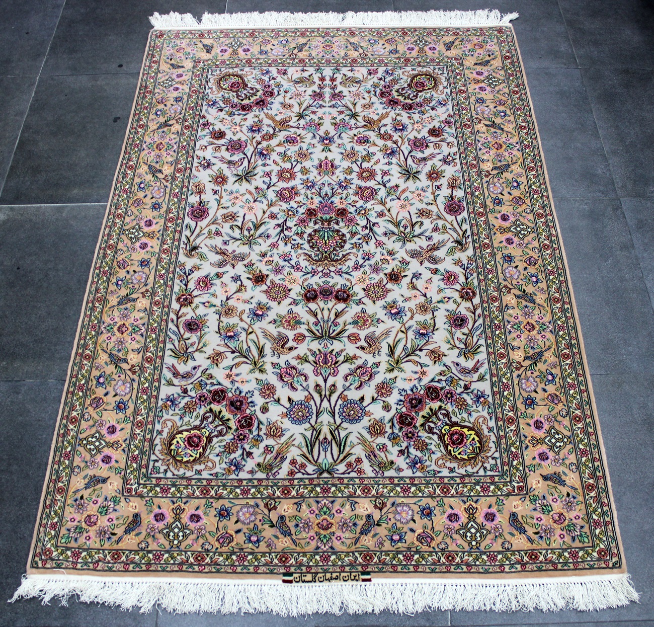 سجادة أصفهان ممضية (كلستان) صوف كُرك وحرير وفيها لونين حرير وفيها 60 قطبة بالـ7سم شغل يدوي ايراني العجمي