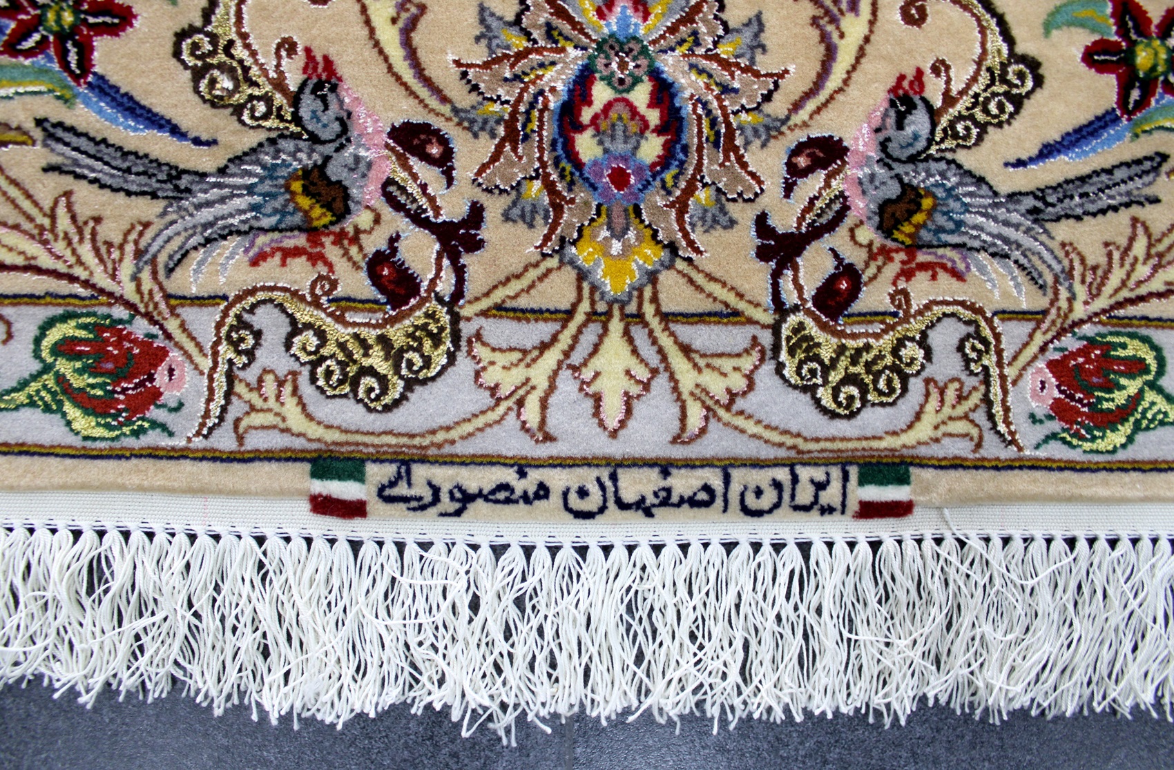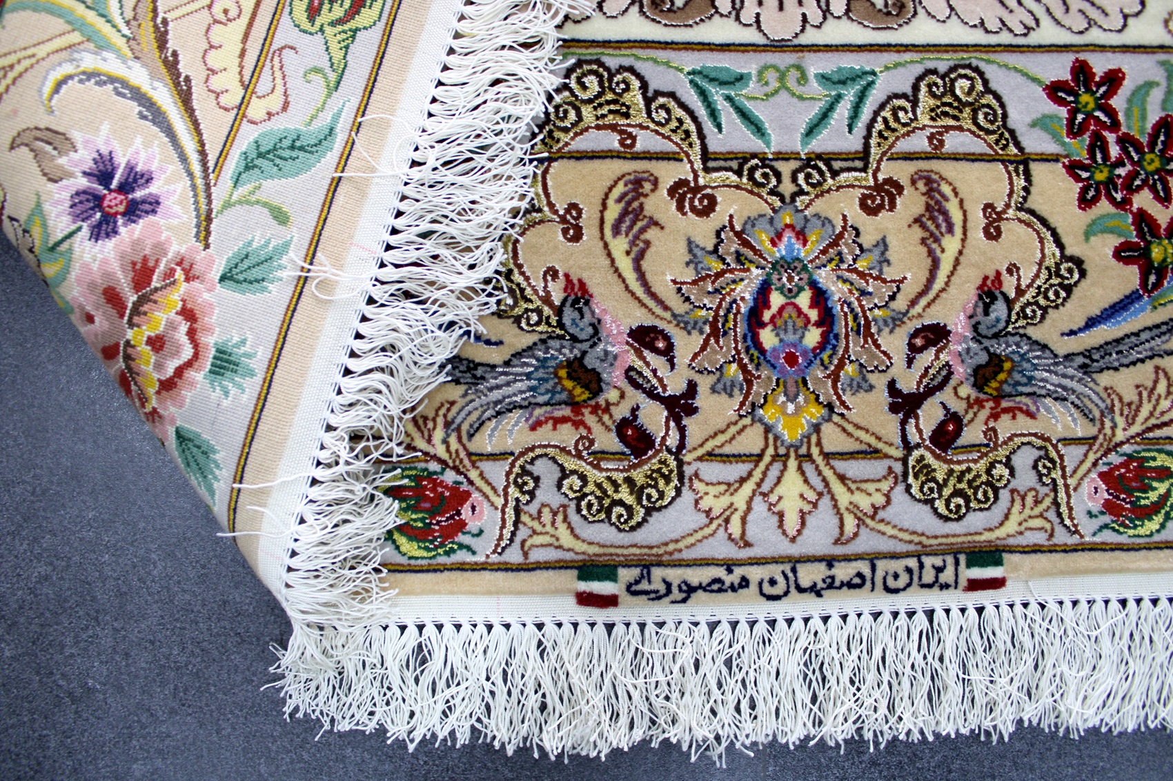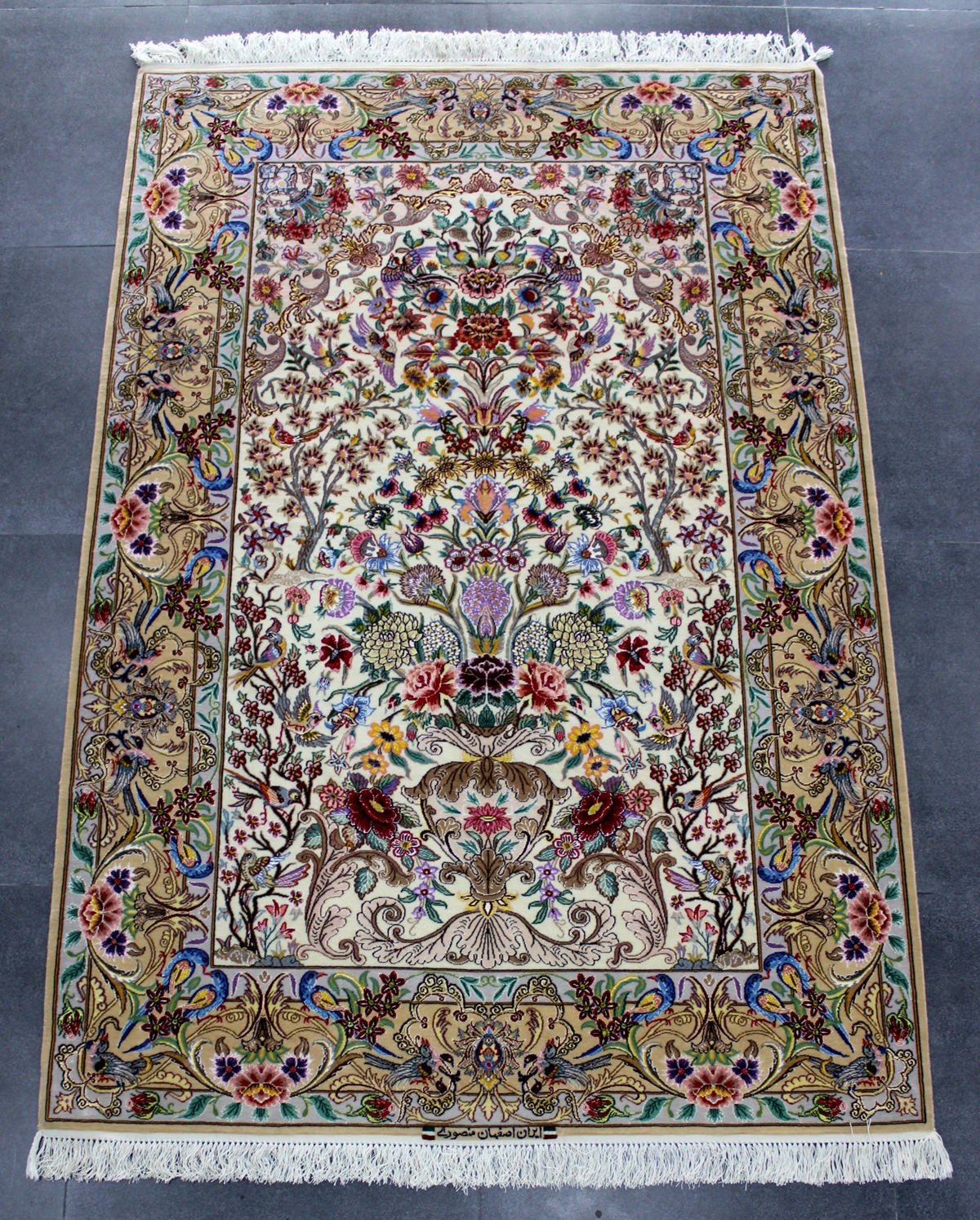 سجادة أصفهان ممضية منصوري نقشة شجرة الحياة صوف كُرك و4 ألوان حرير وفيها 60 قطبة بالـ7سم شغل يدوي ايراني العجمي