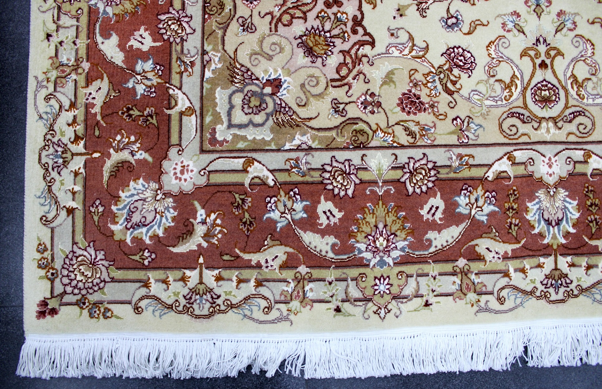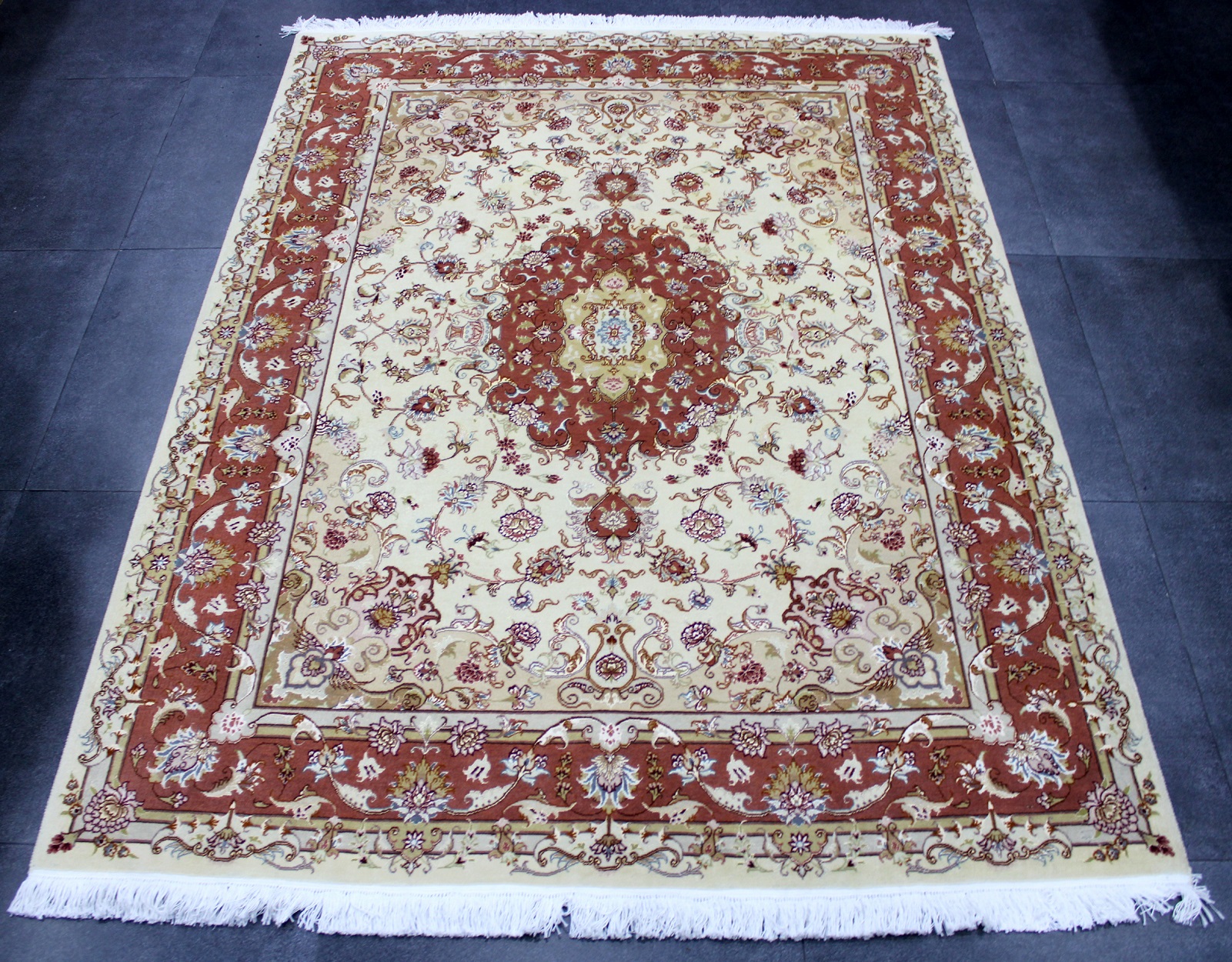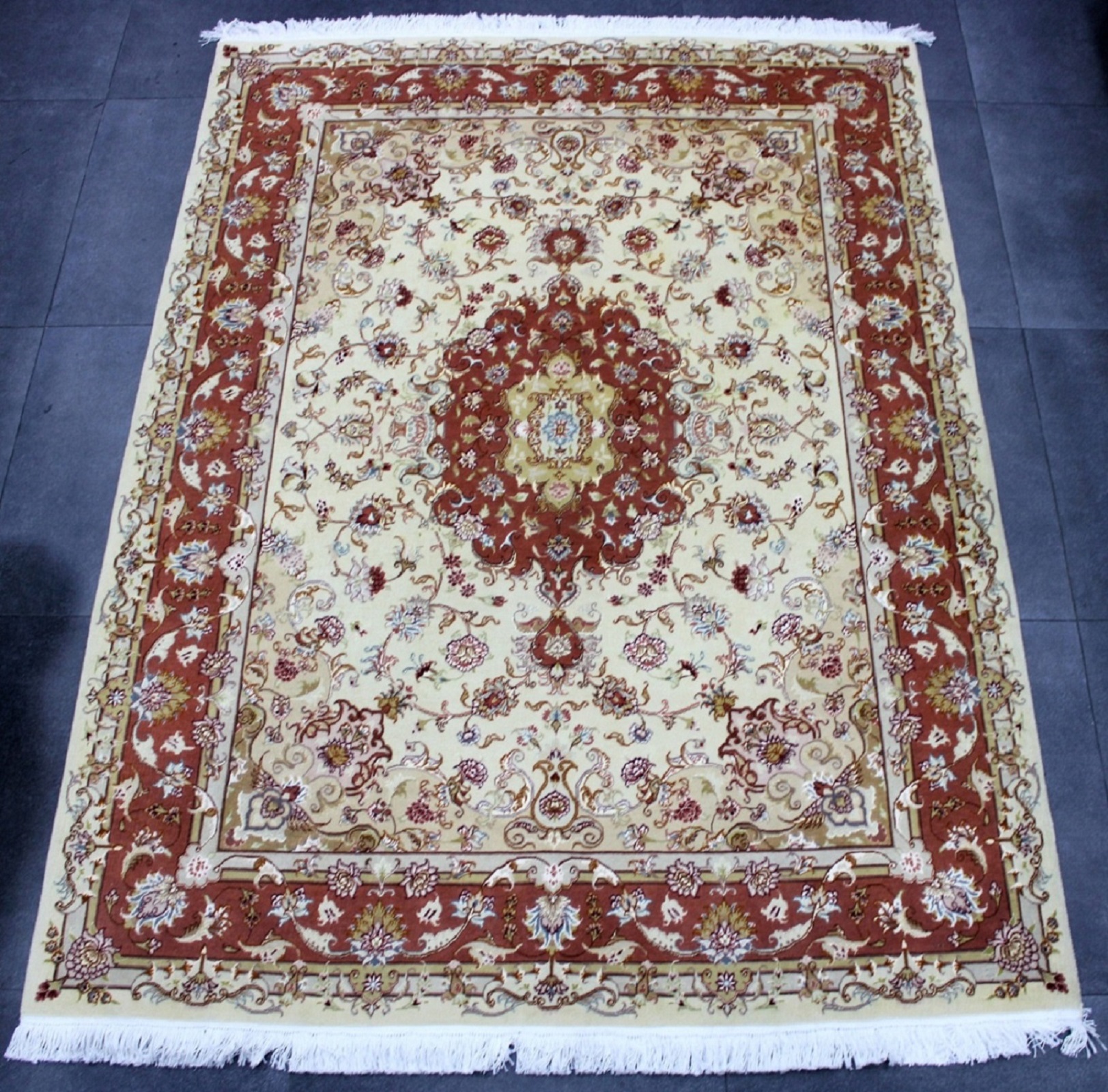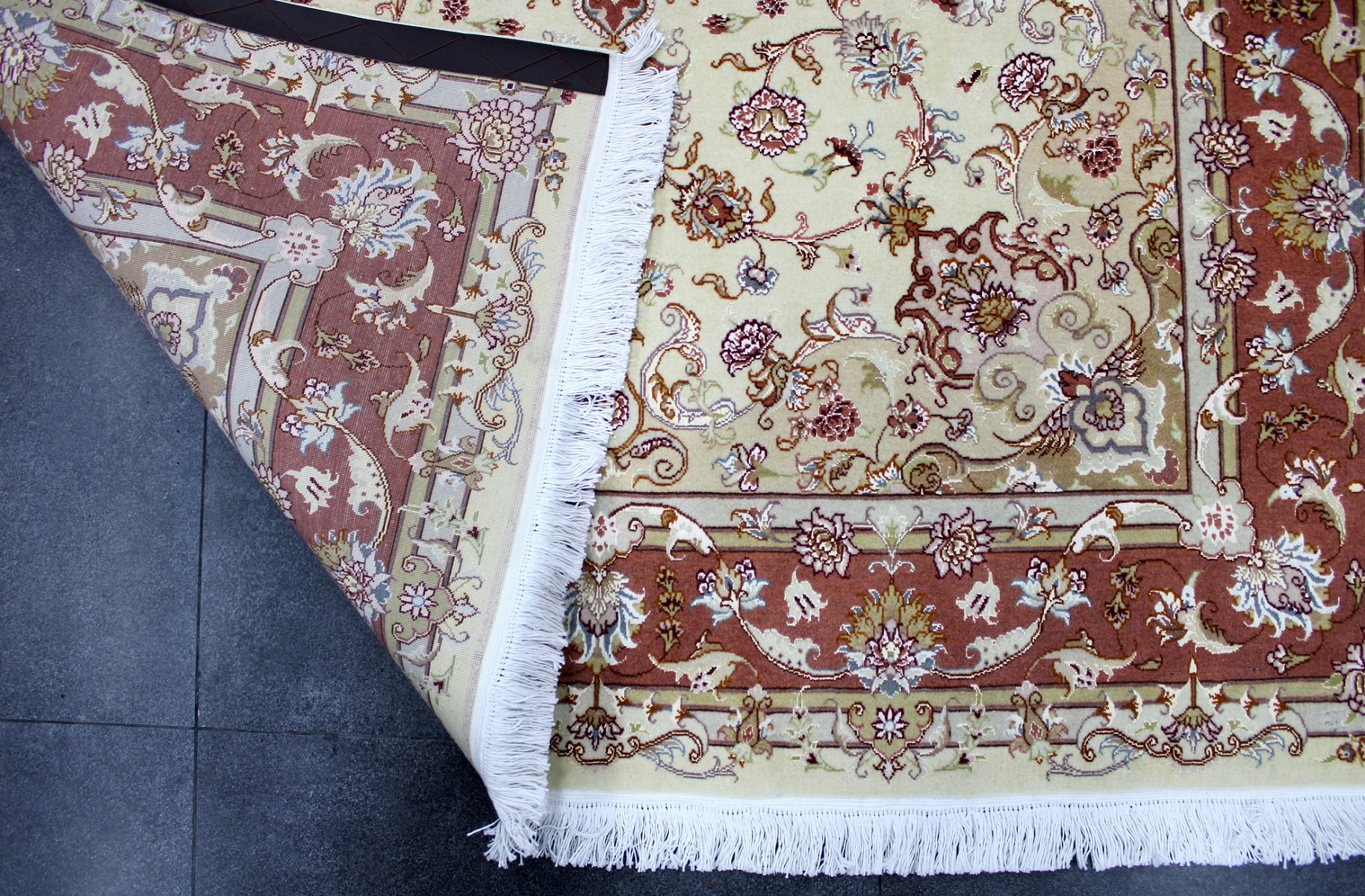 سجادة تبريز جوهر عمرها فوق 5 سنين صوف كُرك مع حرير فيها 50 قطبة بالـ7سم شغل يدوي ايراني العجمي