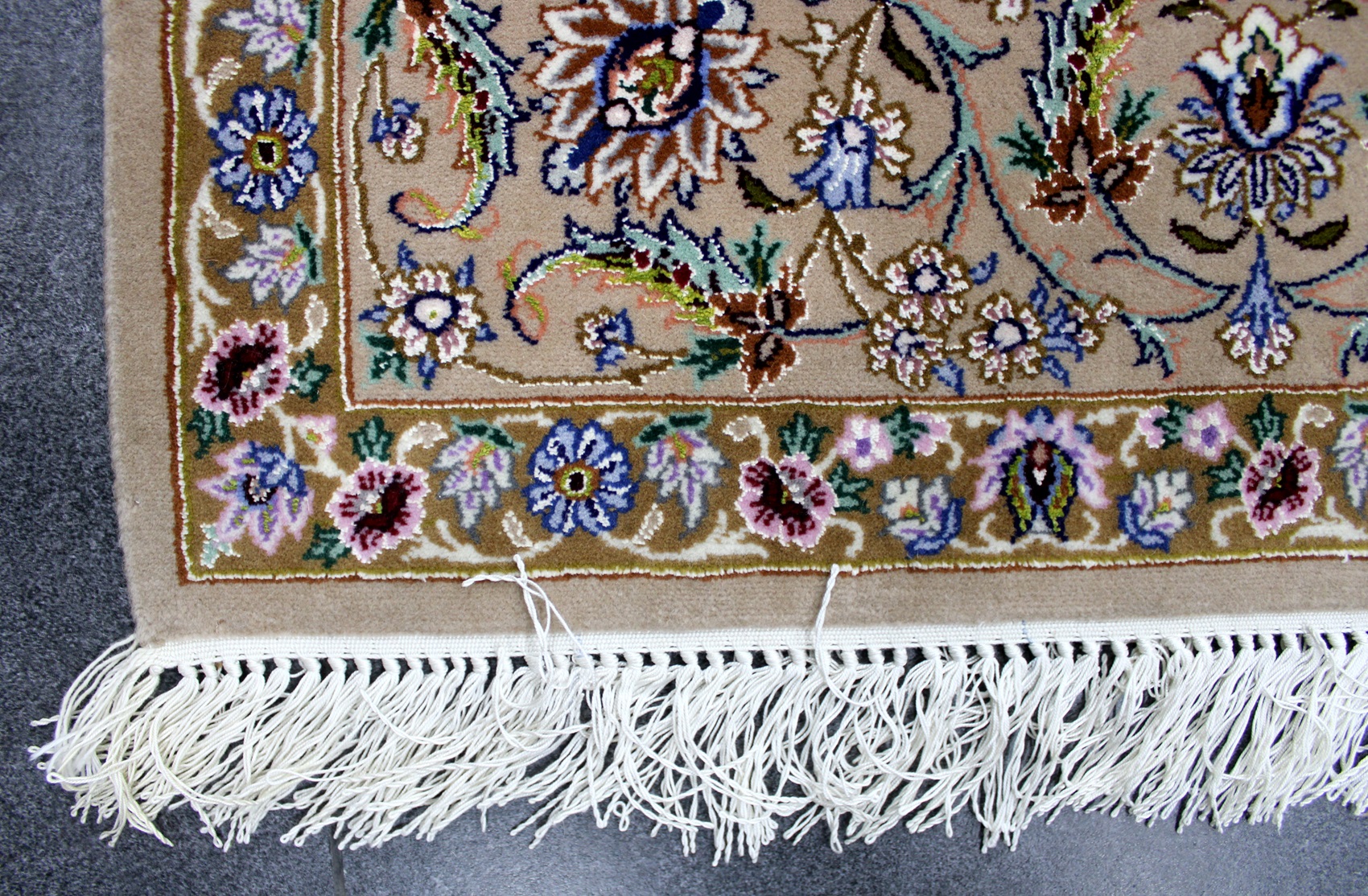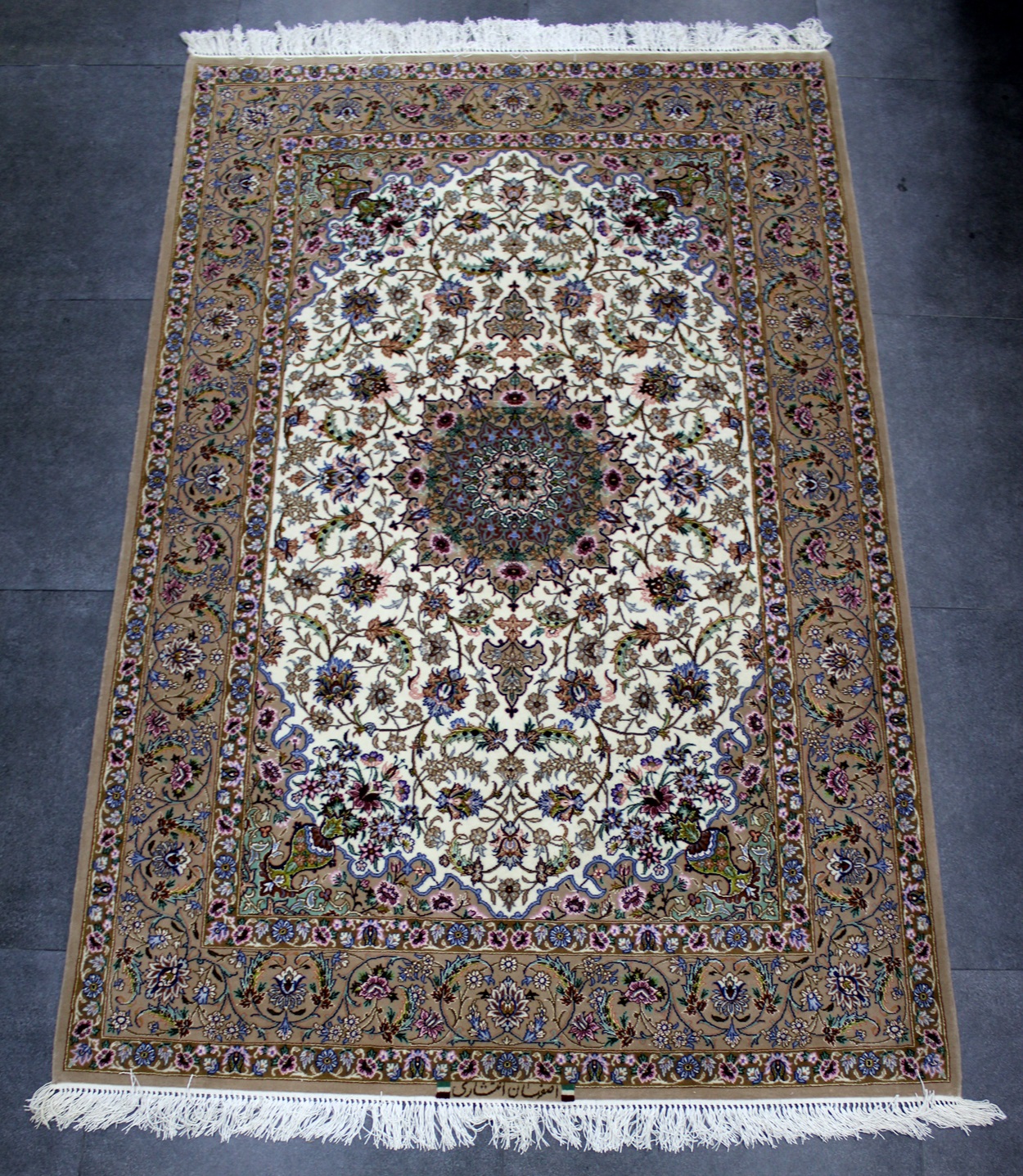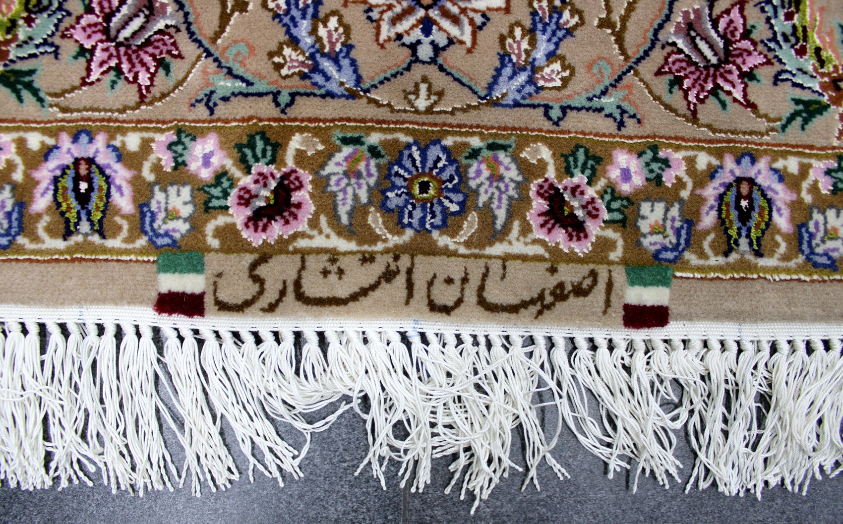 سجادة أصفهان ممضية (إنتشاري) صوف كُرك وحرير وفيها لونين حرير وفيها 60 قطبة بالـ7سم شغل يدوي ايراني العجمي