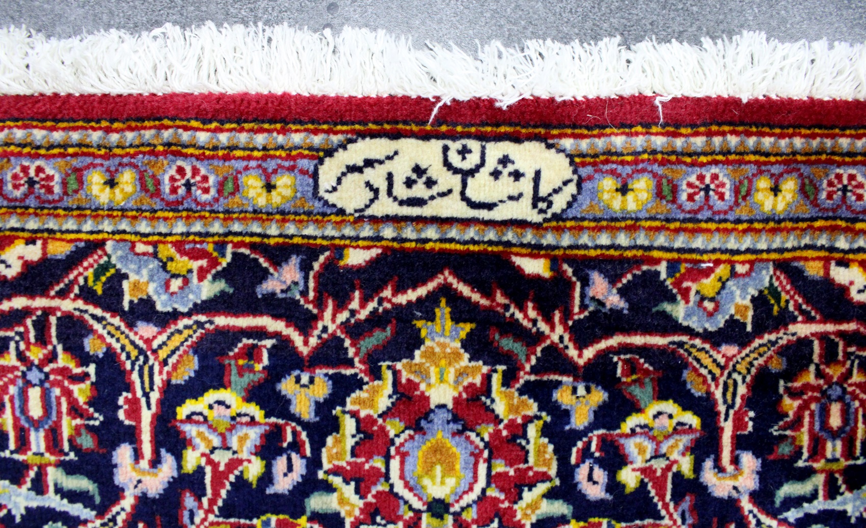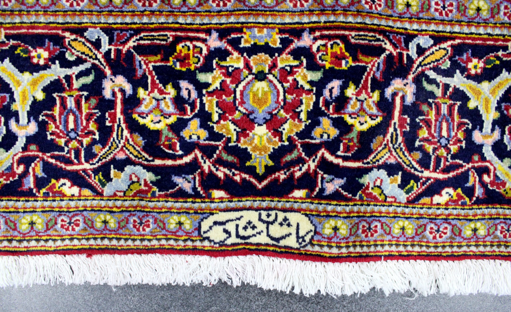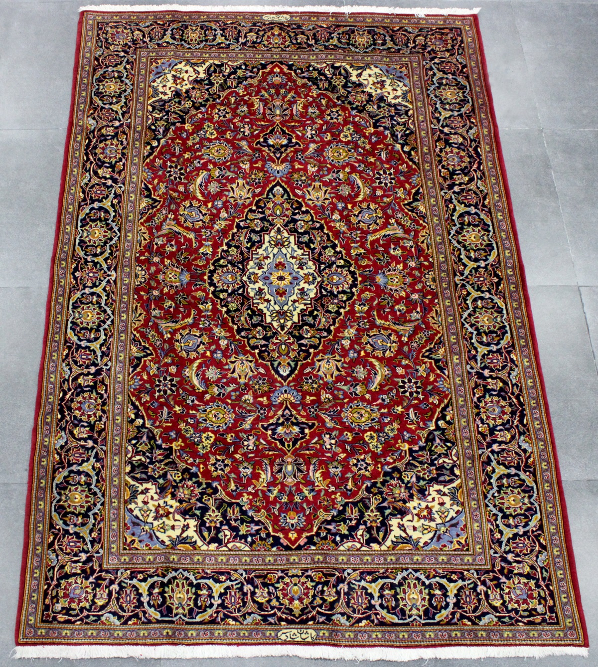 سجادة كاشان ممضية شادسر من الجهتين عمرها فوق 10 سنين صوف كُرك وفيها 40 قطبة بالـ7سم شغل يدوي ايراني العجمي