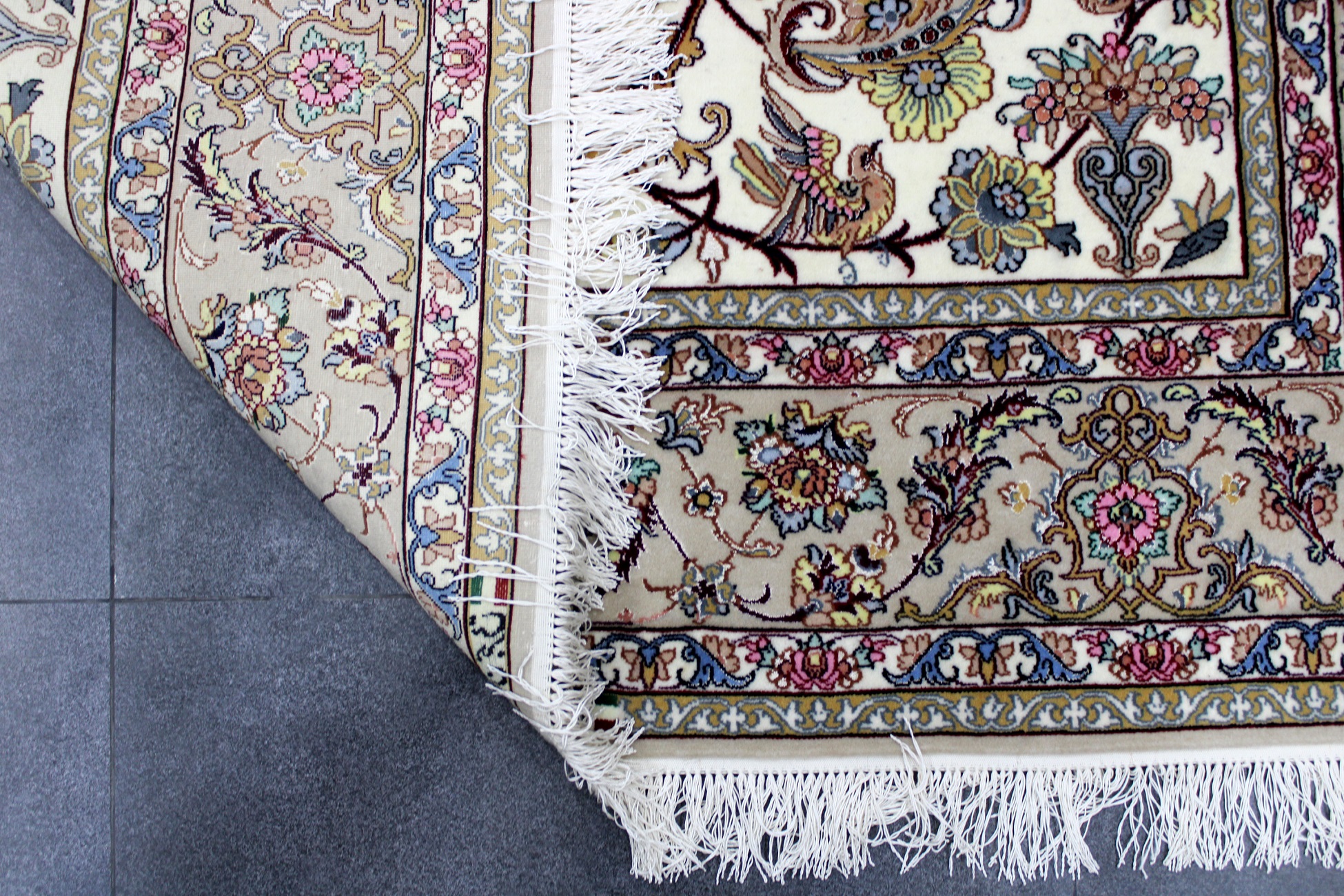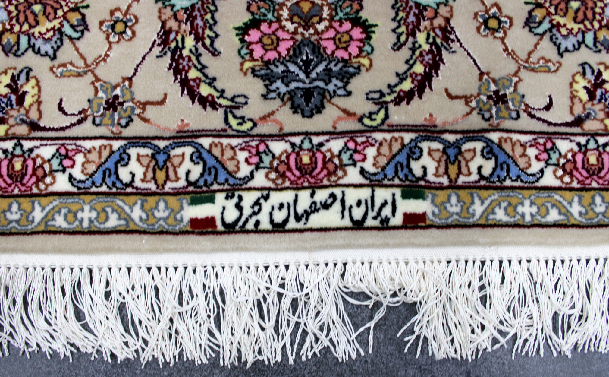 سجادة أصفهان ممضية هجرتي صوف كُرك وحرير فيها 60 قطبة بالـ7سم شغل يدوي ايراني العجمي