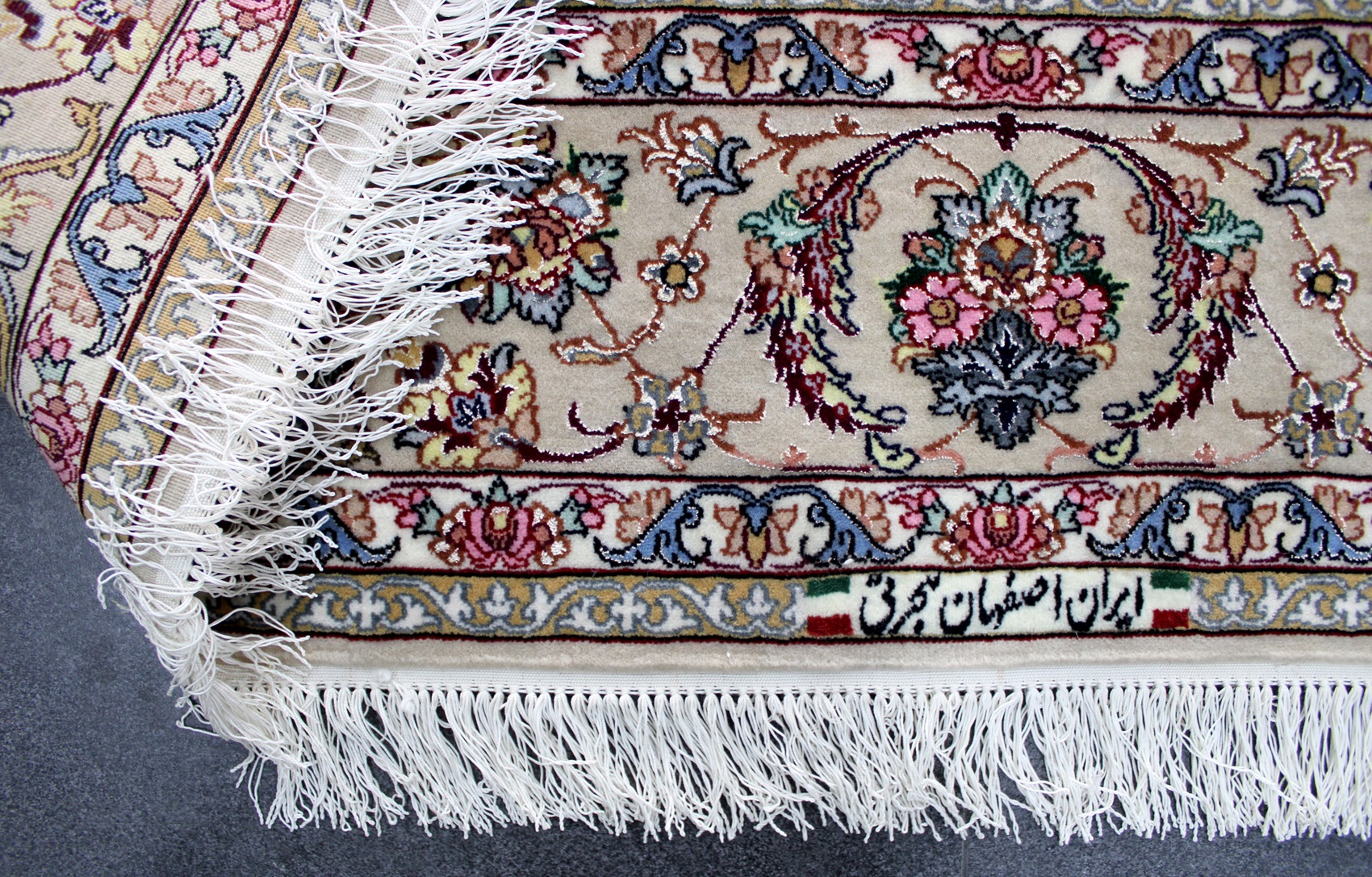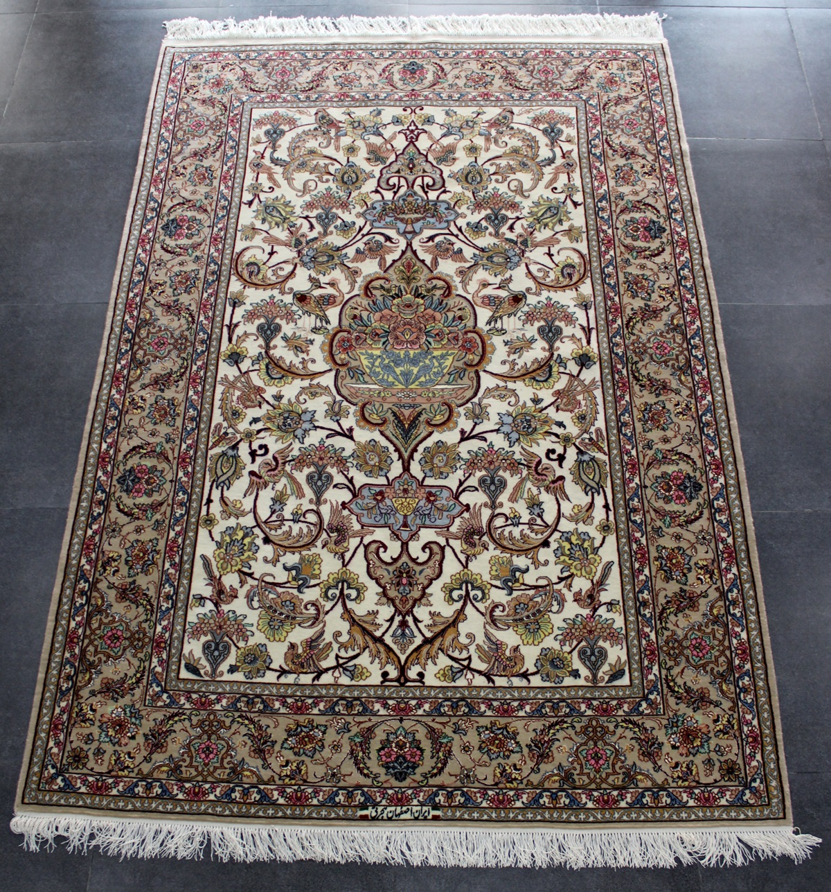 سجادة أصفهان تابلو ممضية (هجرتي) صوف كُرك وحرير فيها 60 قطبة بالـ7سم شغل يدوي ايراني العجمي