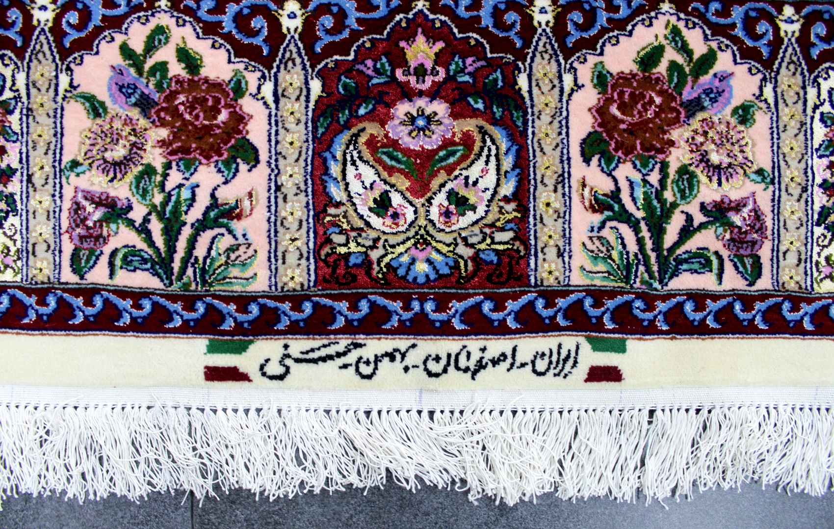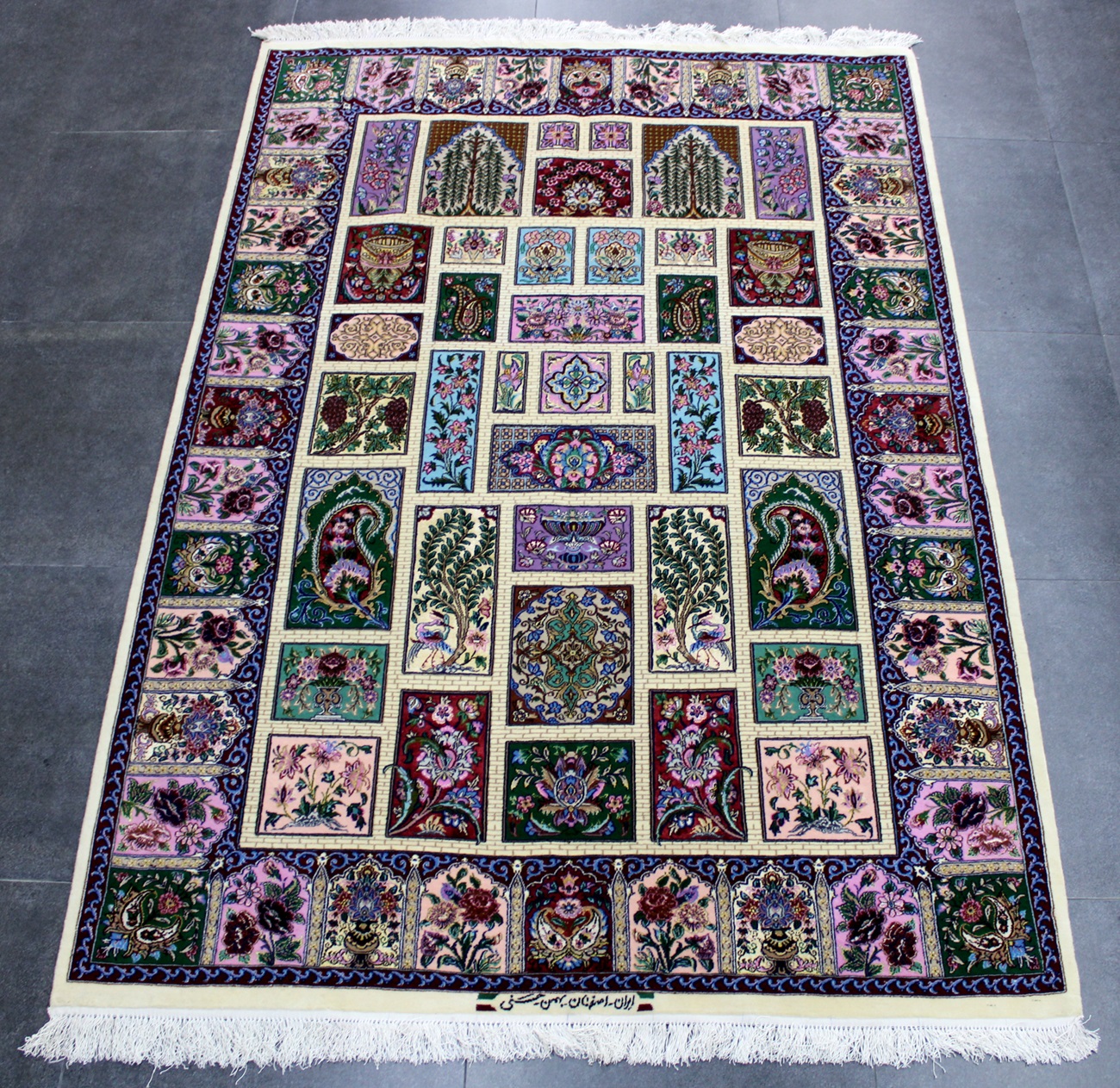 سجادة أصفهان ممضية (بهمن حسني) نقشة ثُريا صوف كُرك وكف حرير (60% من السجادة حرير) و3 ألوان حرير وفيها 60 قطبة بالـ7سم شغل يدوي ايراني العجمي