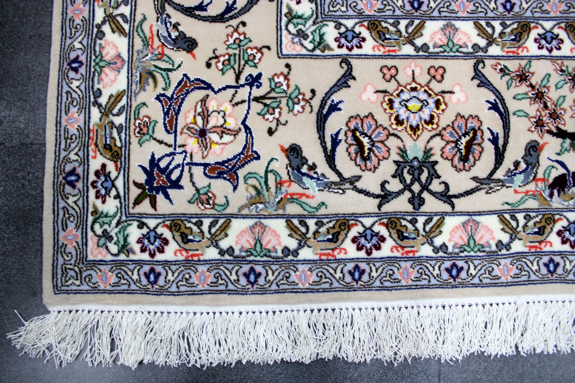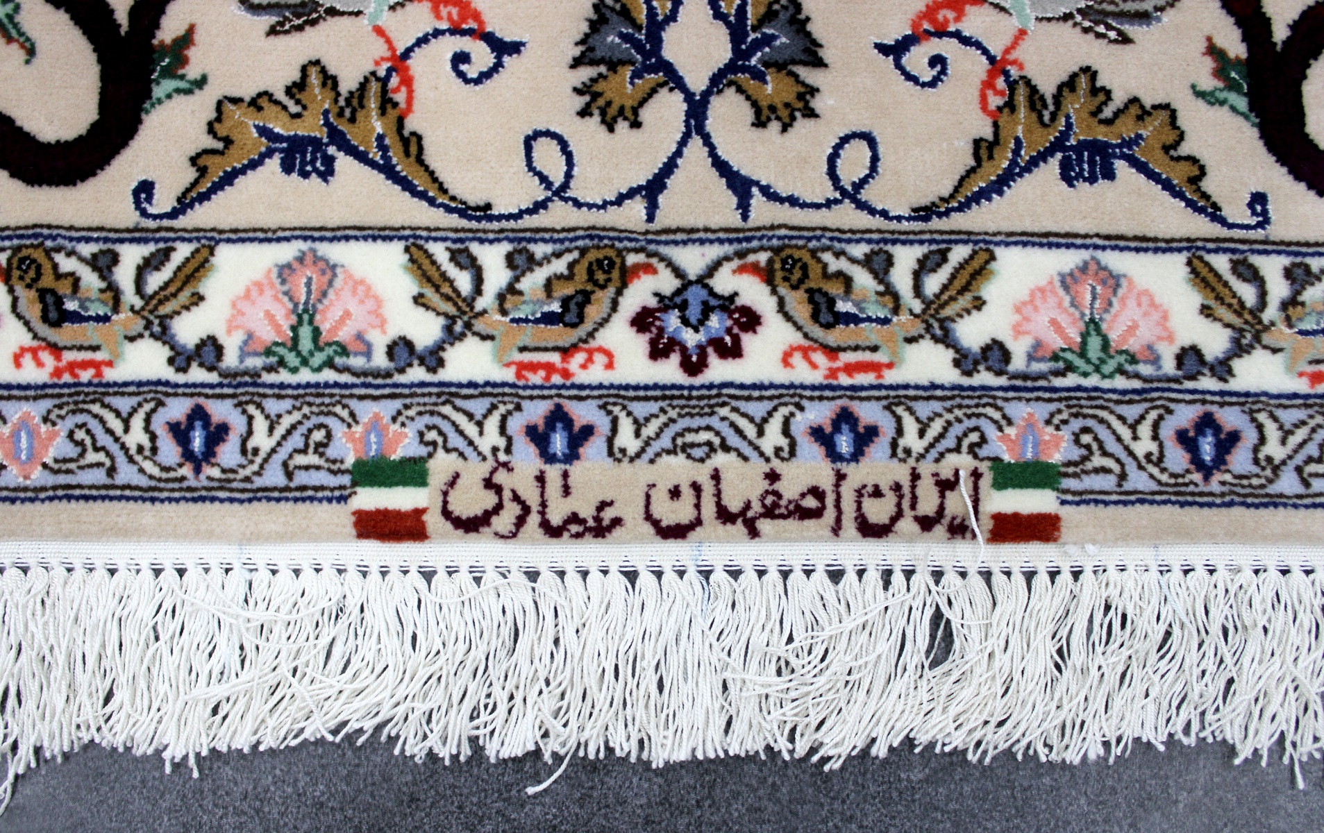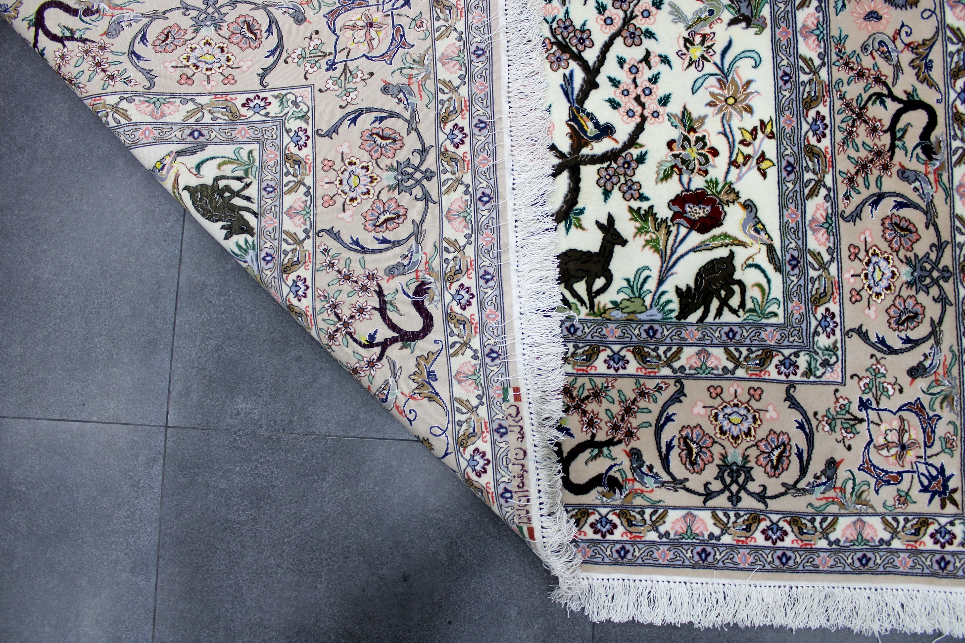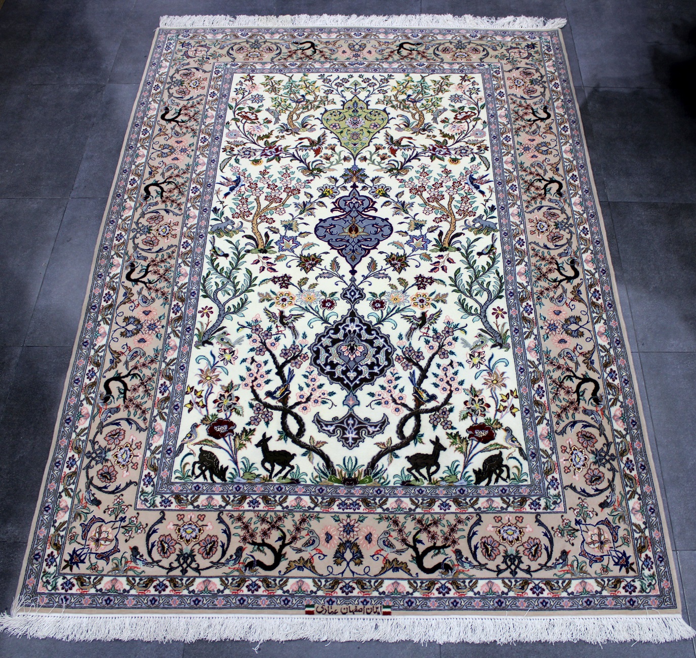 سجادة أصفهان ممضية عمادي نقشة شجرة الحياة صوف كُرك ولونين حرير فيها 60 قطبة بالـ7سم شغل يدوي ايراني العجمي
