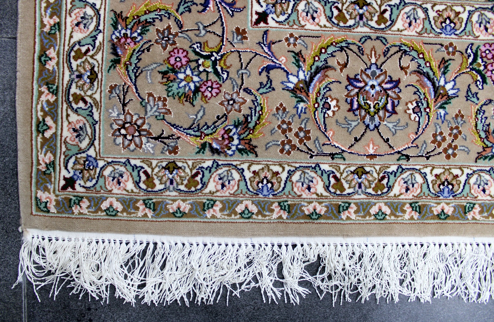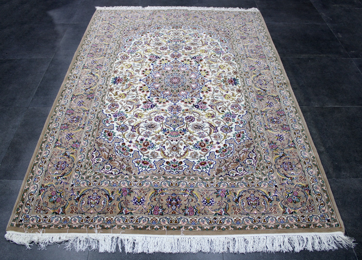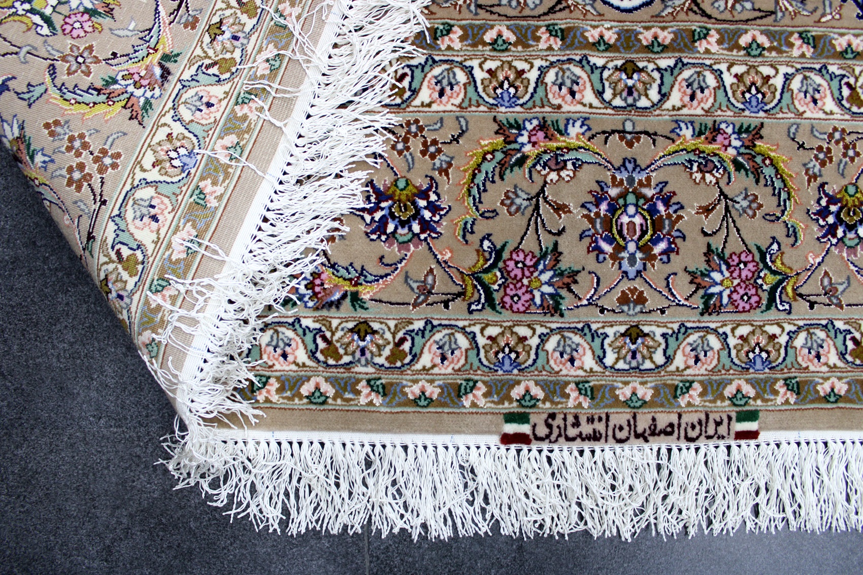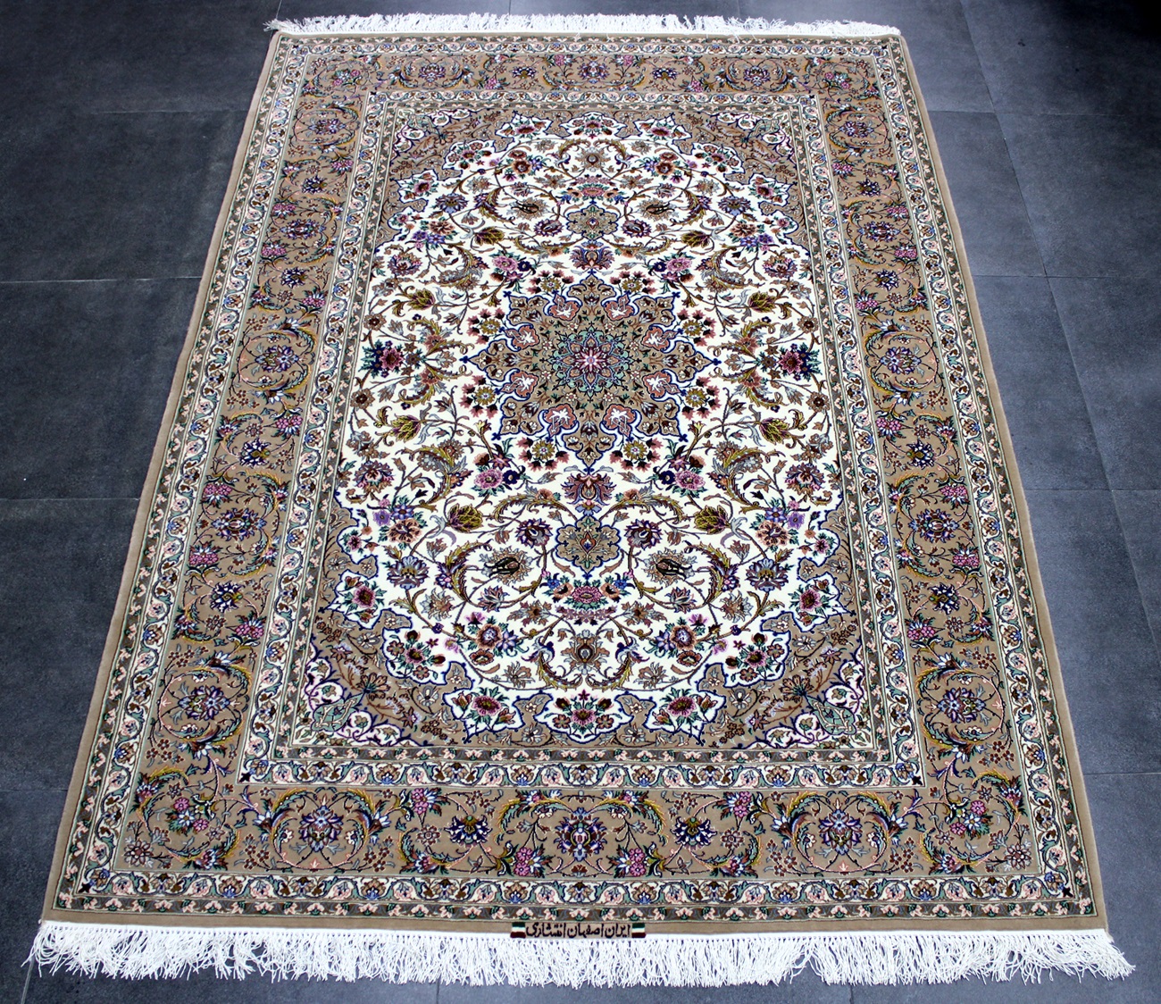 سجادة أصفهان ممضية (انتشاري) صوف كُرك ولونين حرير ومد حرير وفيها 60 قطبة بالـ7سم شغل يدوي ايراني العجمي