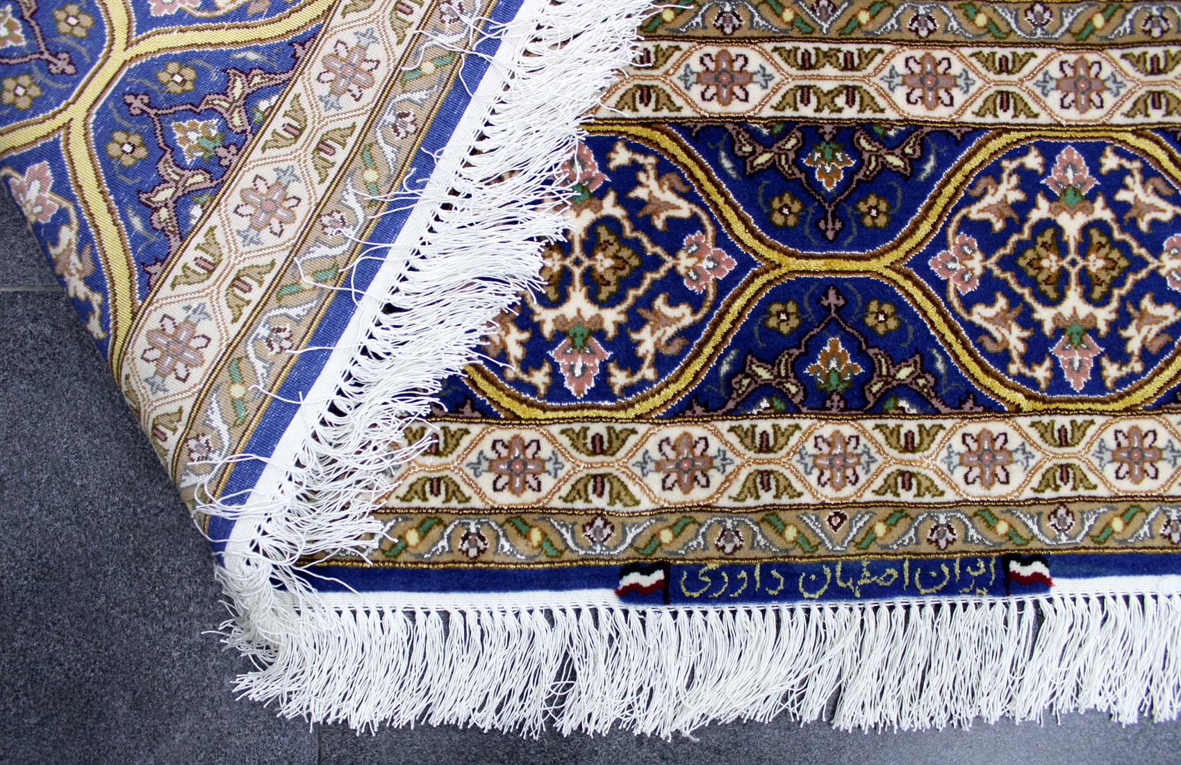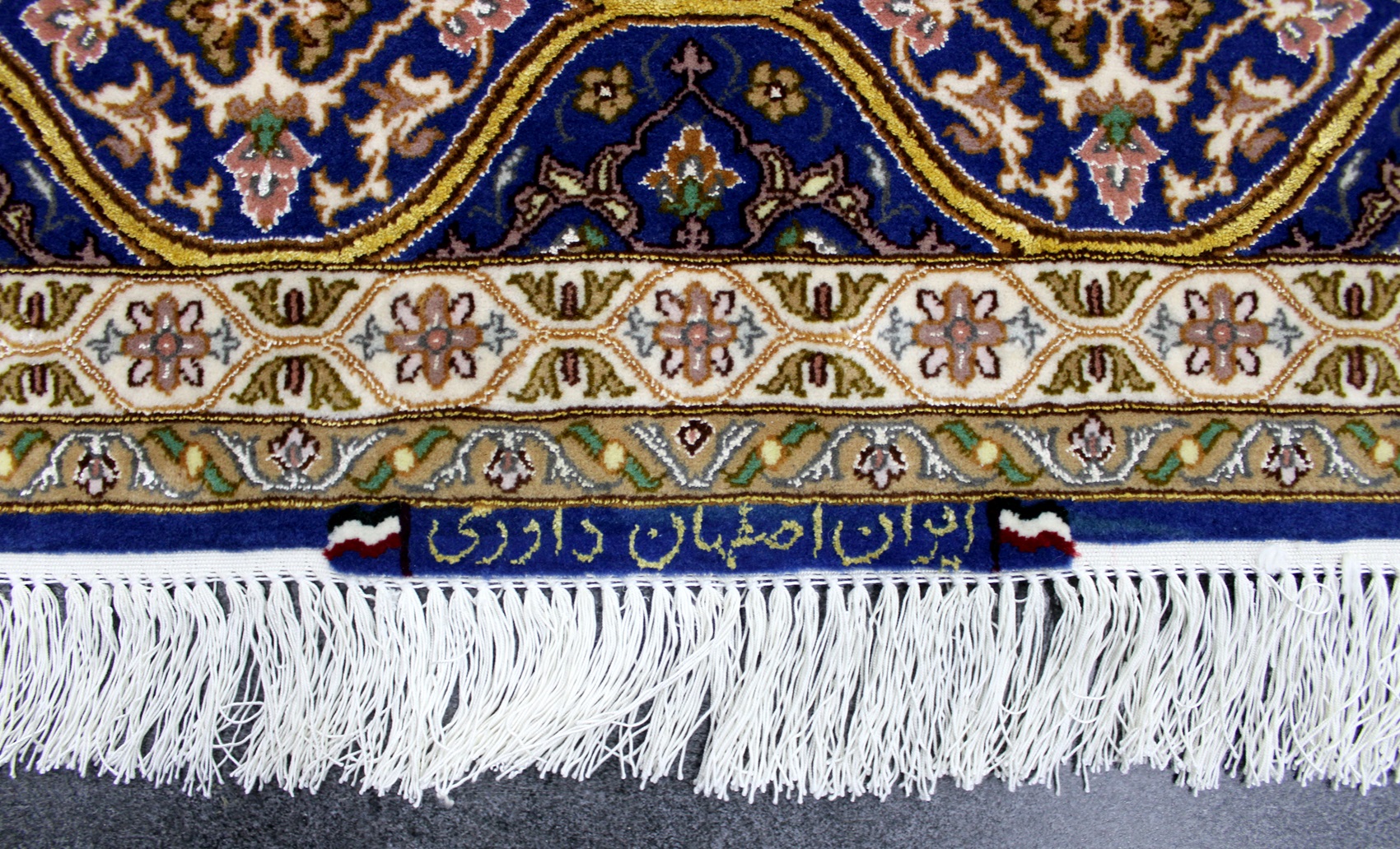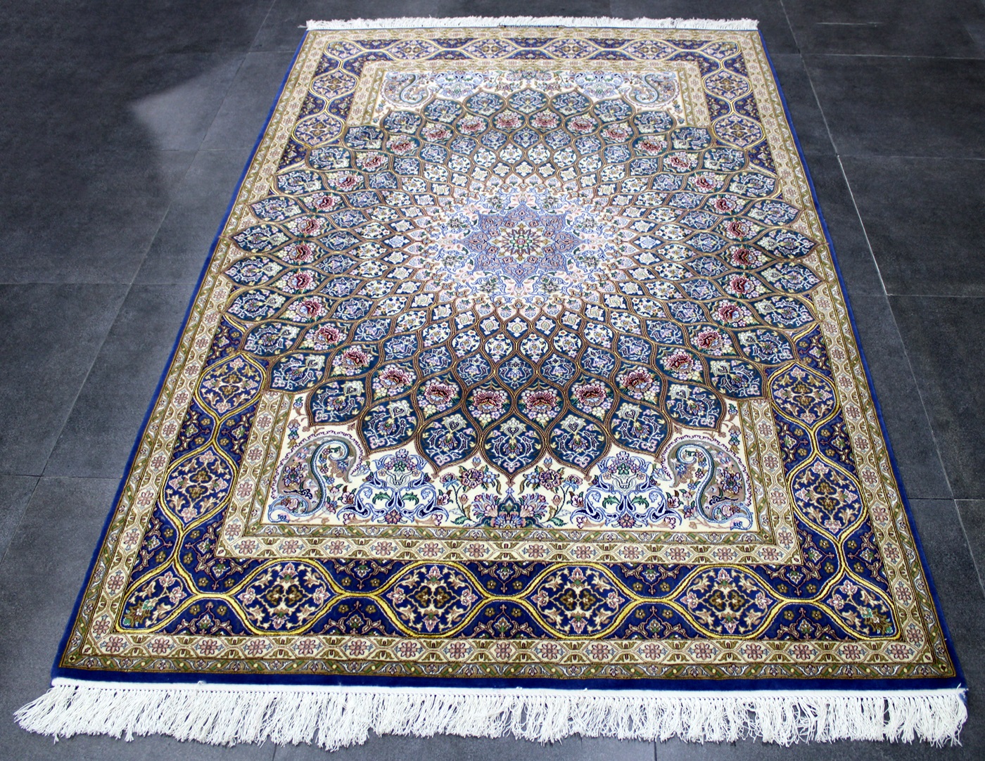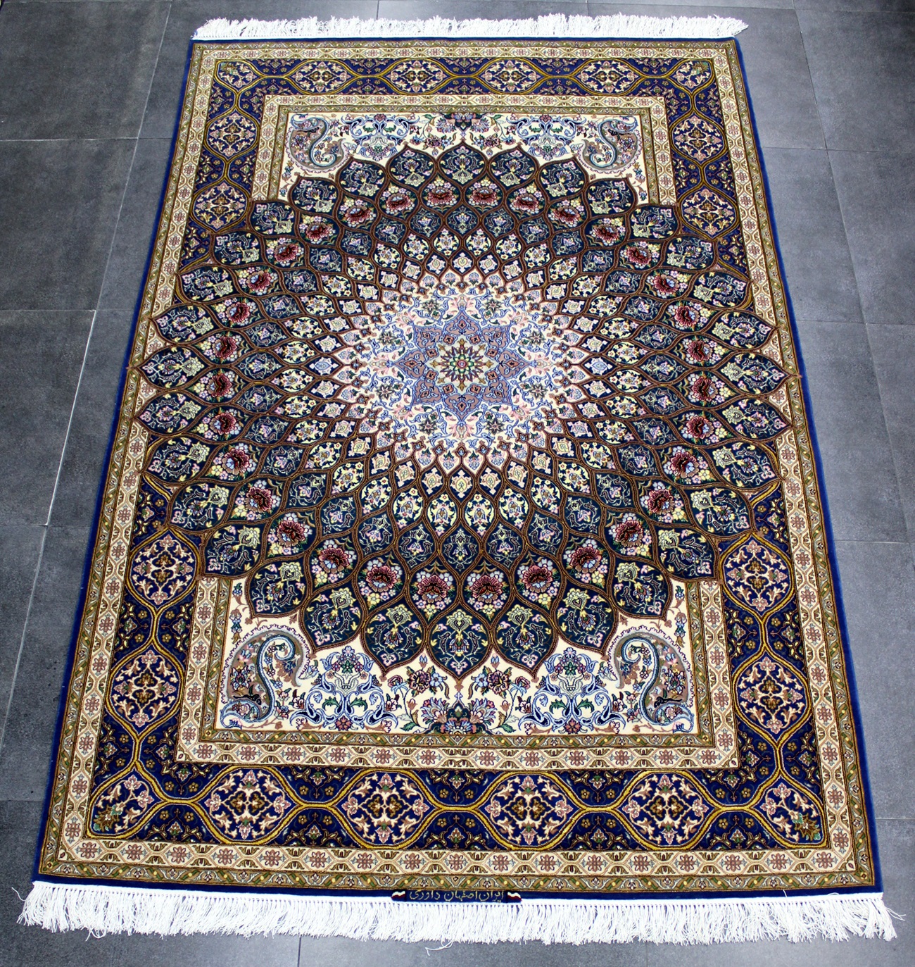 سجادة أصفهان ممضية (داوري) نقشة كنبد صوف كُرك ولونين حرير وفيها 60 قطبة بالـ7سم شغل يدوي ايراني العجمي