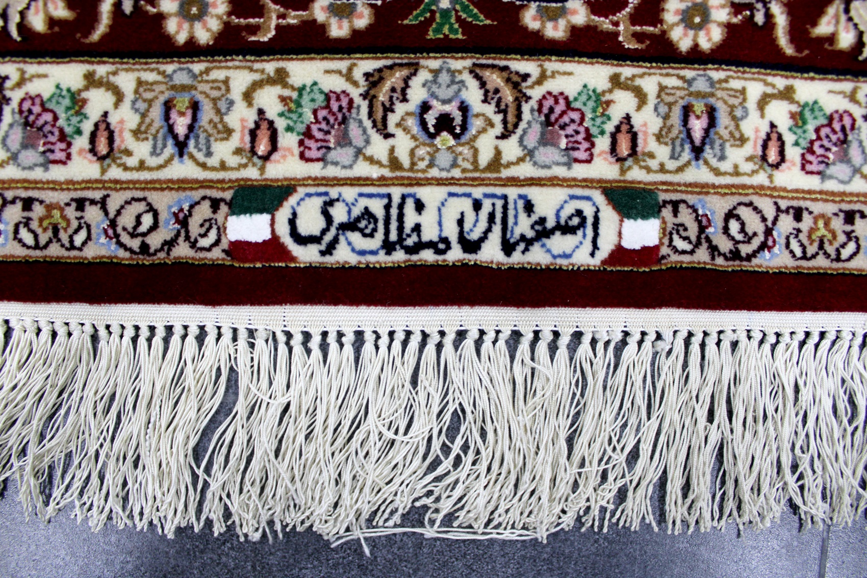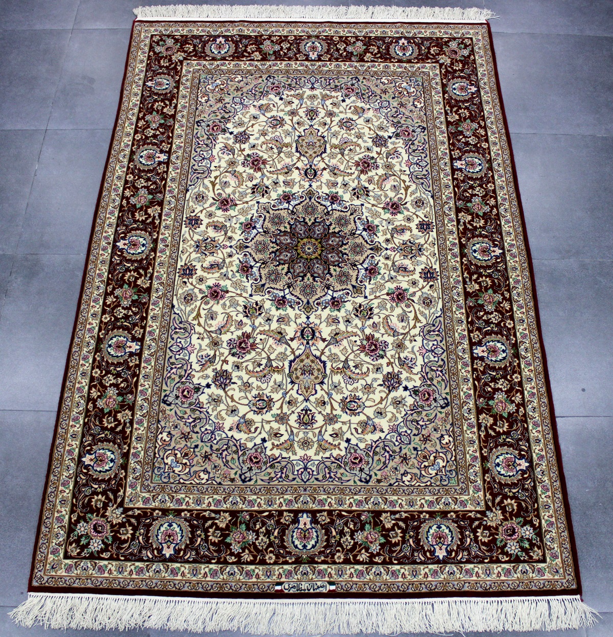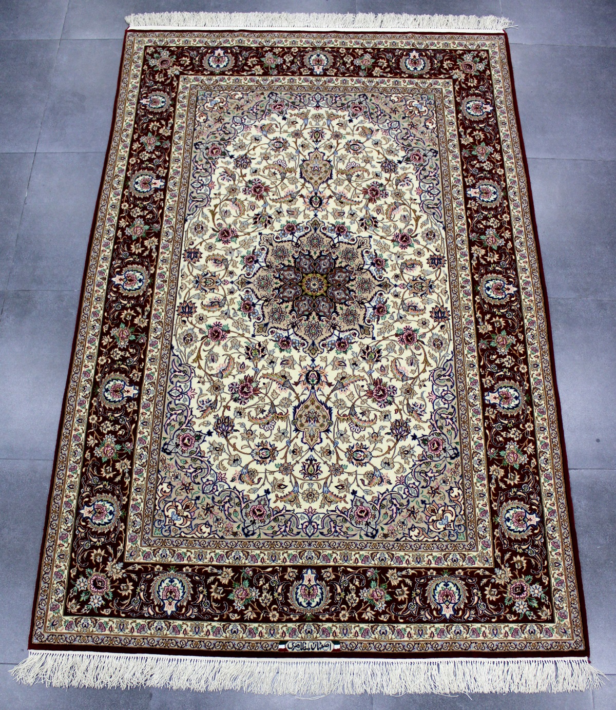سجادة أصفهان ممضية مظاهري صوف كُرك ولونين حرير وفيها 60 قطبة بالـ7سم شغل يدوي ايراني العجمي