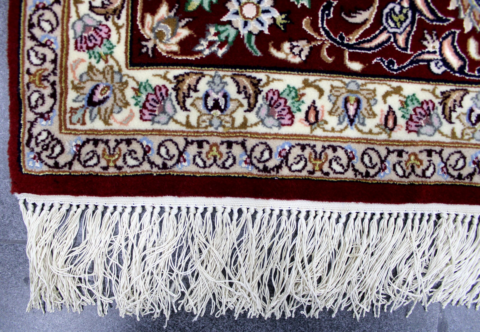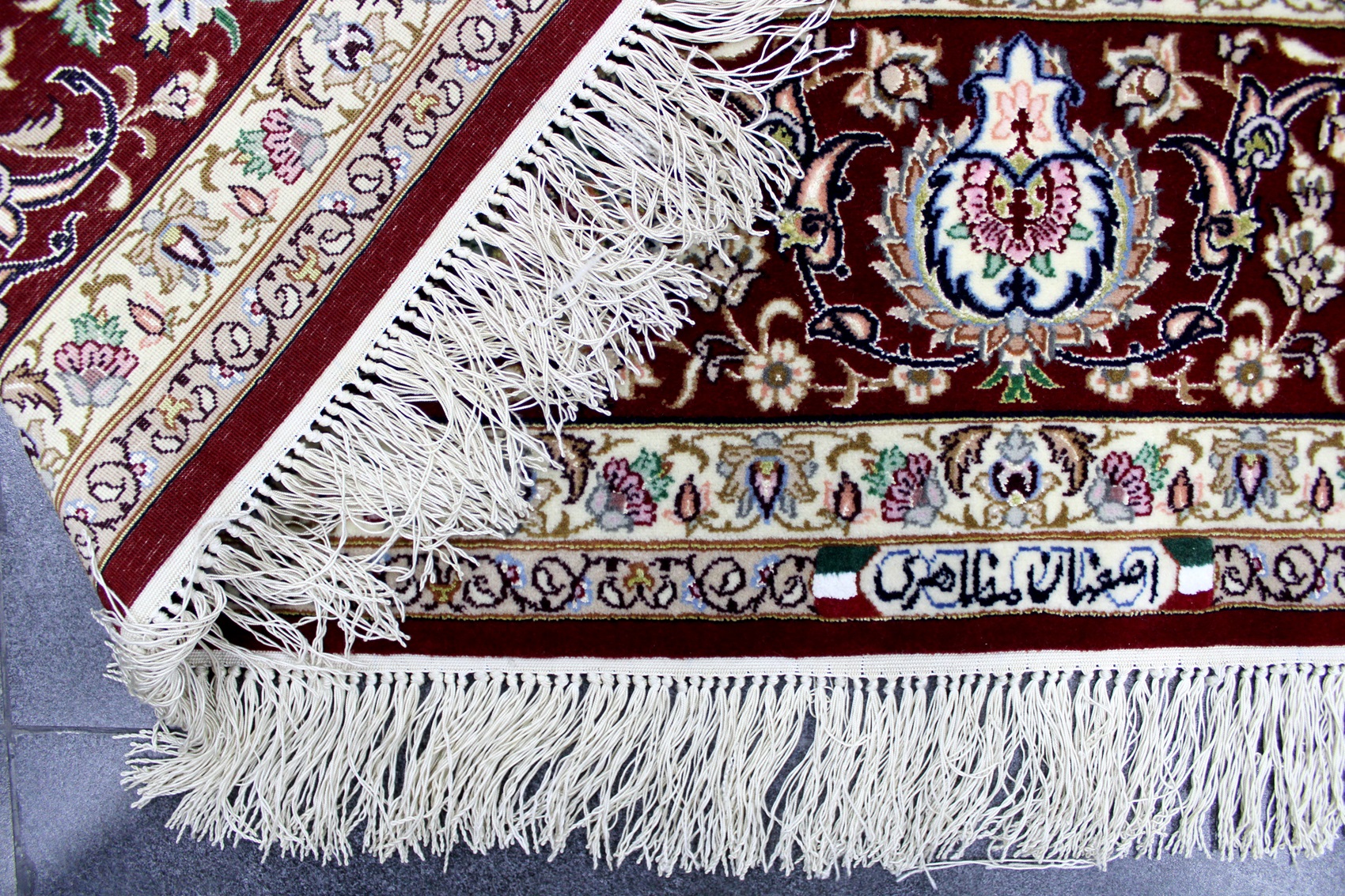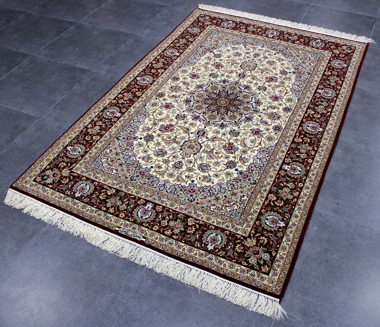 سجادة أصفهان ممضية مظاهري صوف كُرك ولونين حرير وفيها 60 قطبة بالـ7سم شغل يدوي ايراني العجمي
