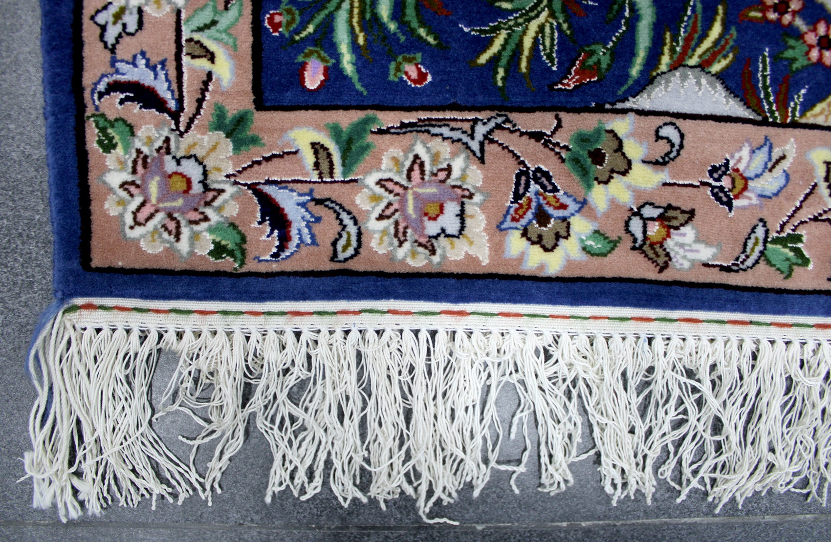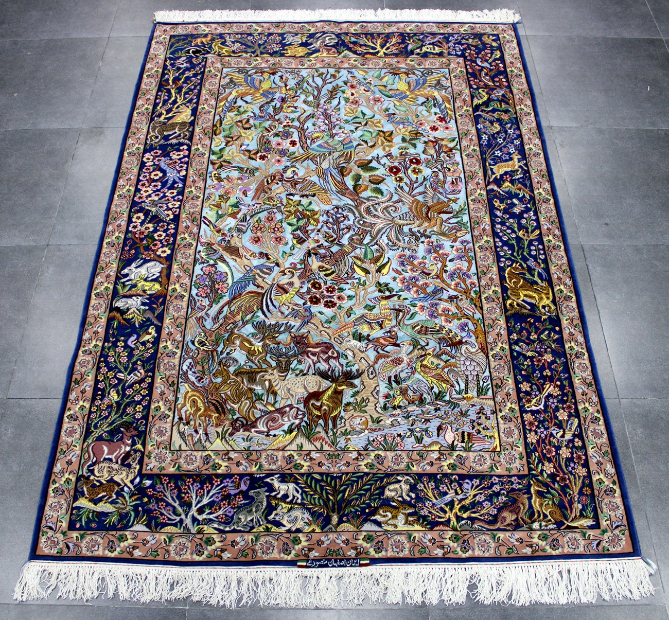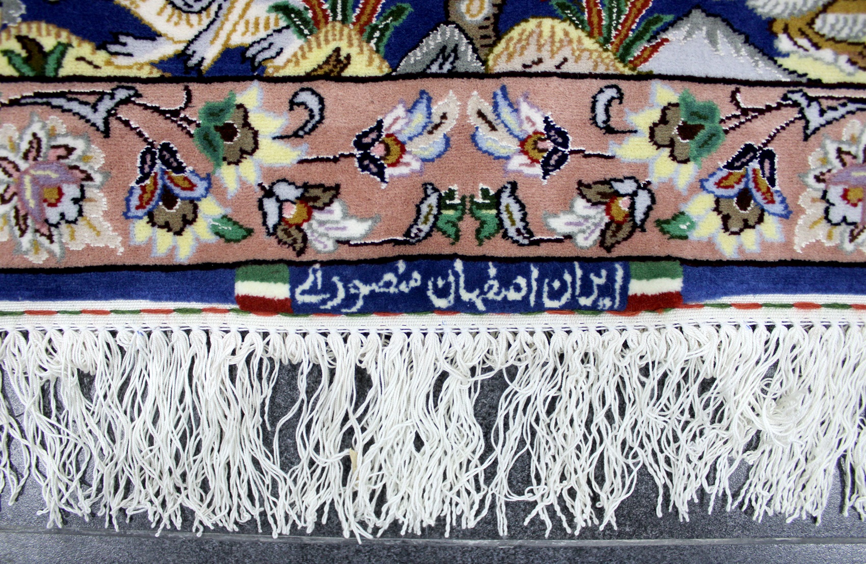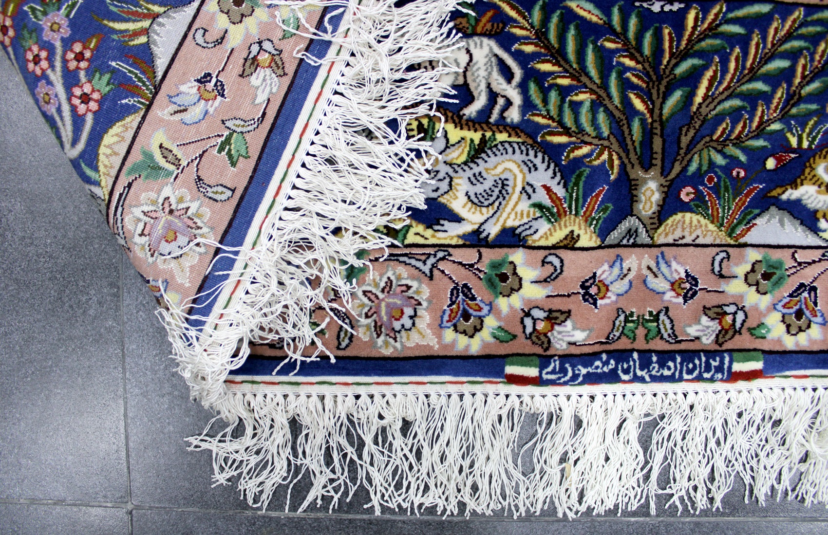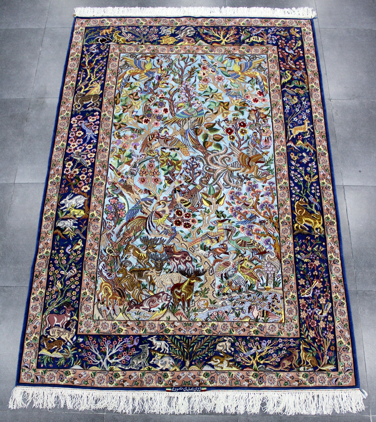 سجادة أصفهان تابلو ممضية (أصفهان منصوري) صوف كُرك وكف حرير (80% من السجادة حرير) فيها 60 قطبة بالـ7سم شغل يدوي ايراني العجمي