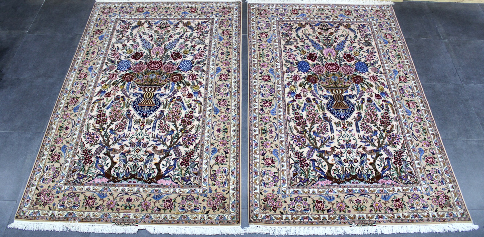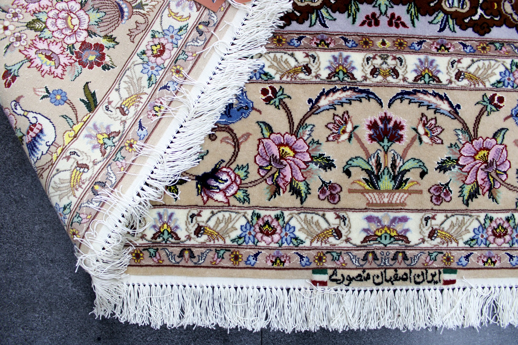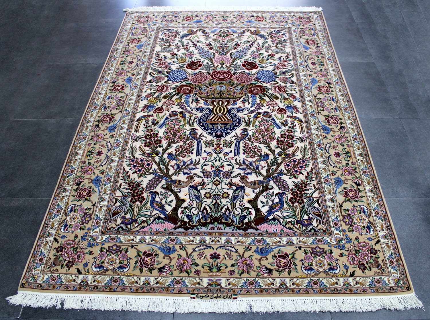سجادة أصفهان ممضية (منصوري) نقشة شجرة الحياة صوف كُرك وكف حرير (80% من السجادة حرير) وفيها 60 قطبة بالـ7سم شغل يدوي ايراني العجمي