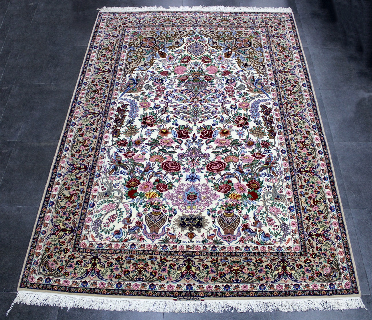 سجادة أصفهان ممضية (منصوري) صوف كُرك ولونين حرير فيها 60 قطبة بالـ7سم شغل يدوي ايراني العجمي