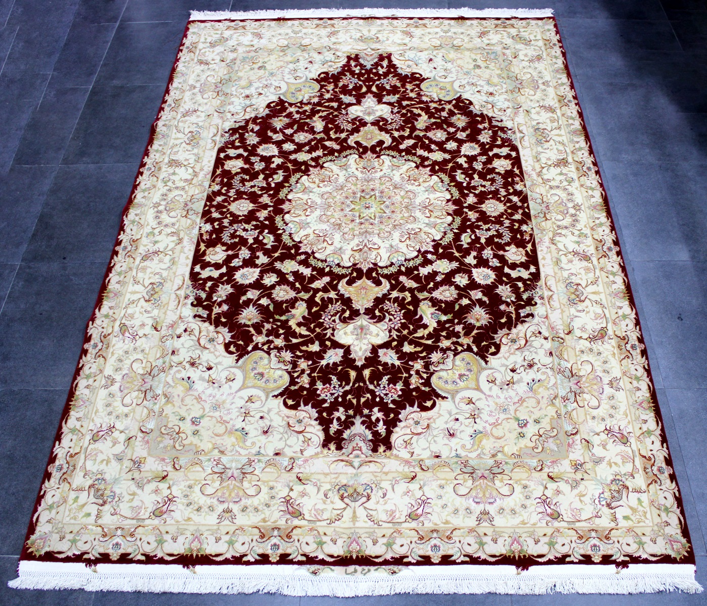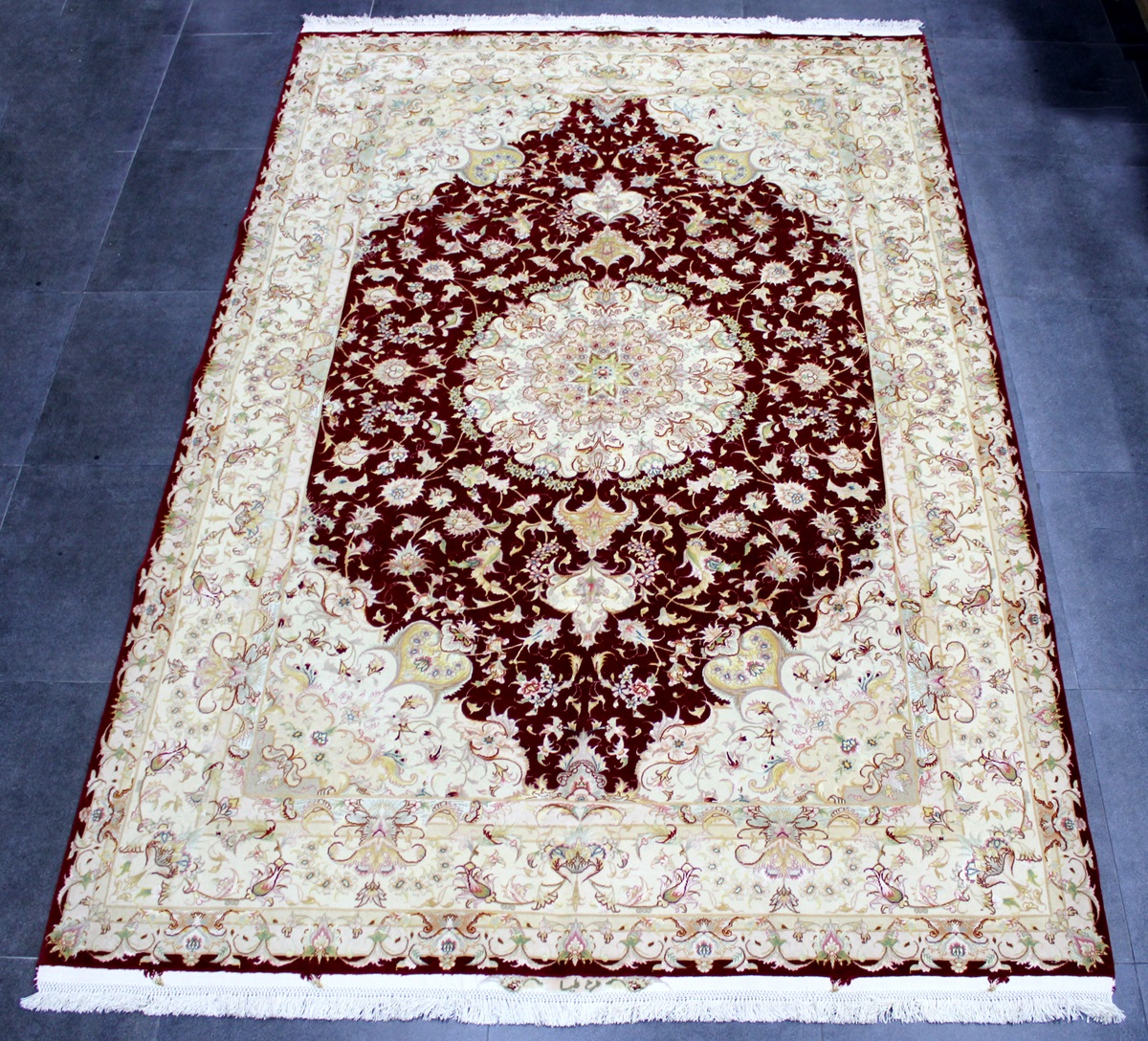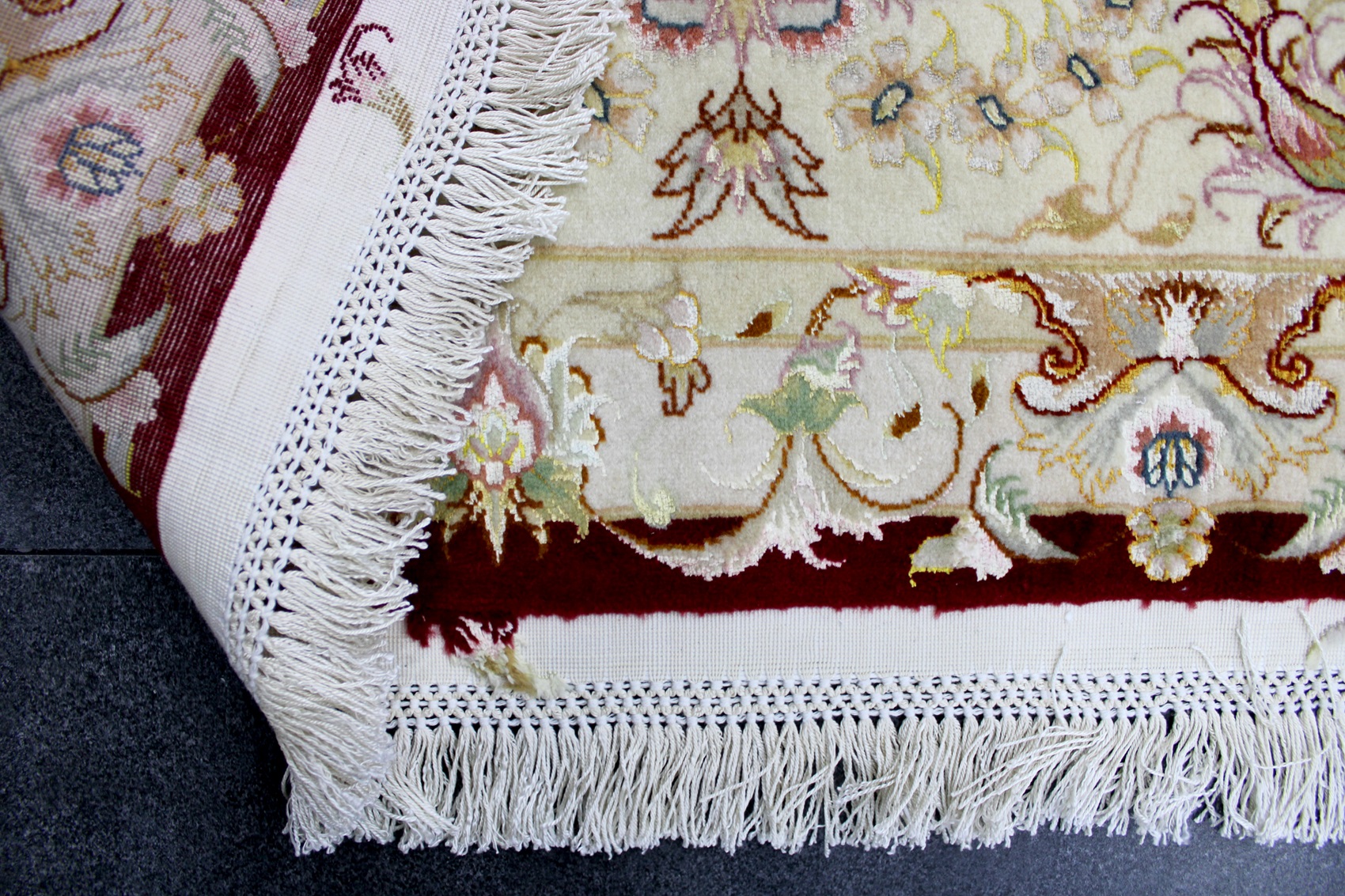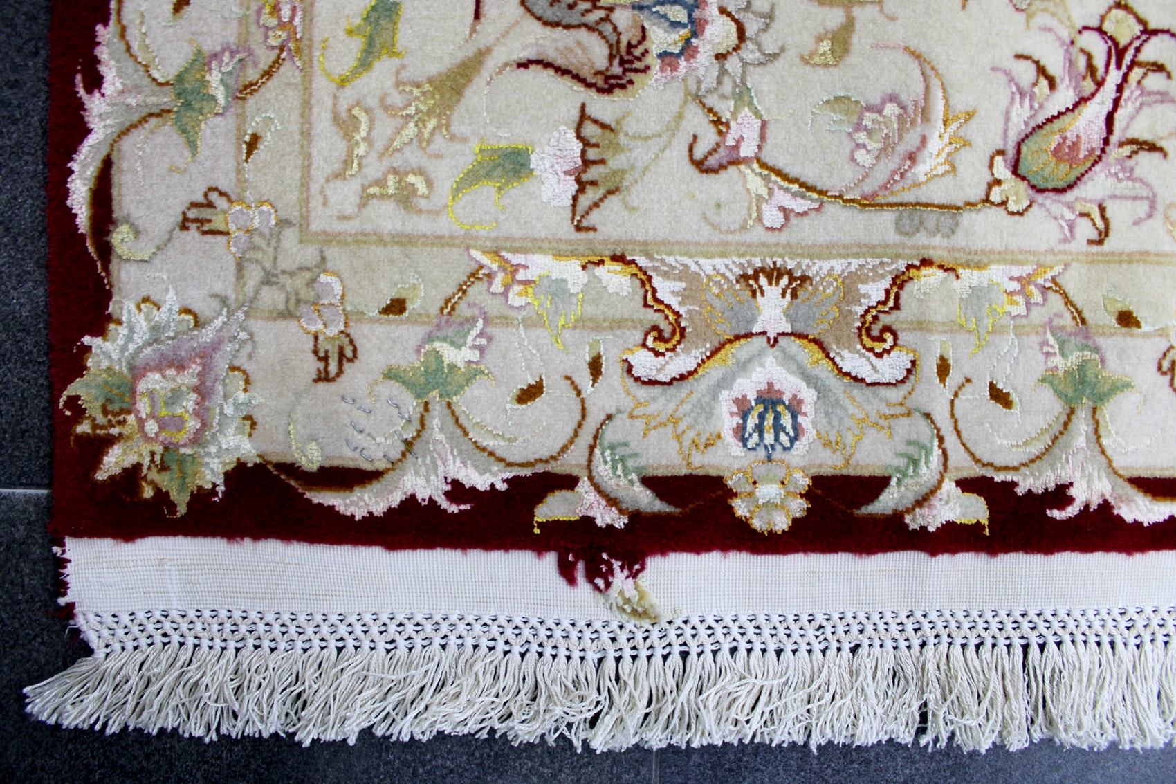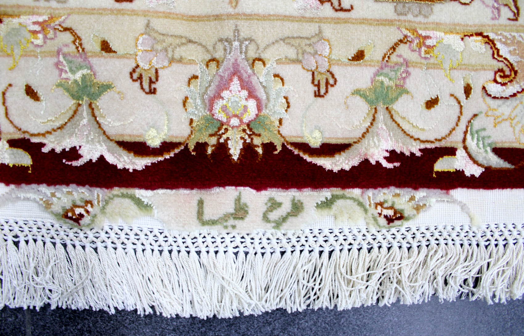 سجادة تبريز جوهر ممضية من الجهتين (طرح عليا) عمرها فوق 5 سنين صوف كُرك ومد حرير وفيها 4 ألوان حرير وفيها 70 قطبة بالـ7سم شغل يدوي ايراني العجمي