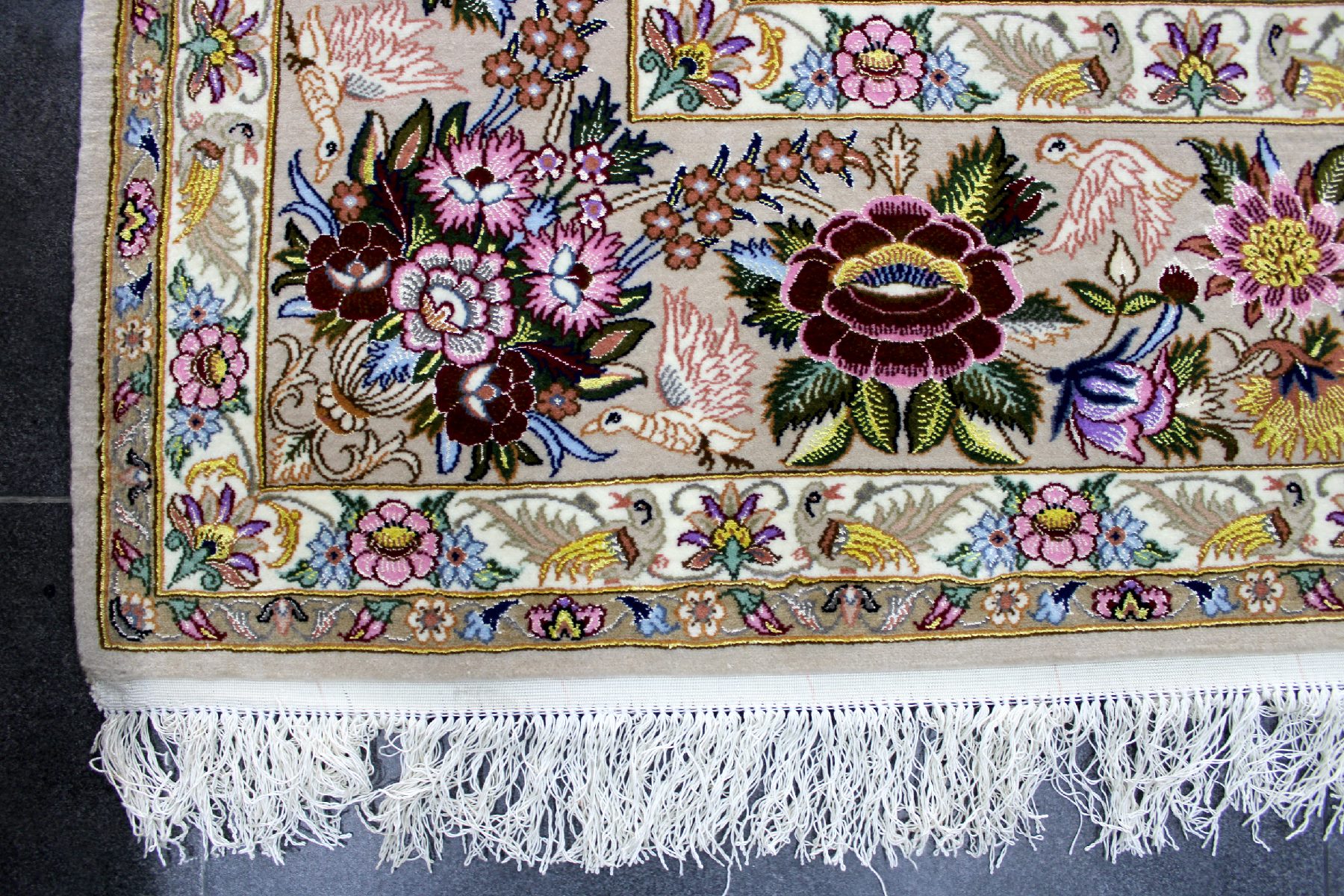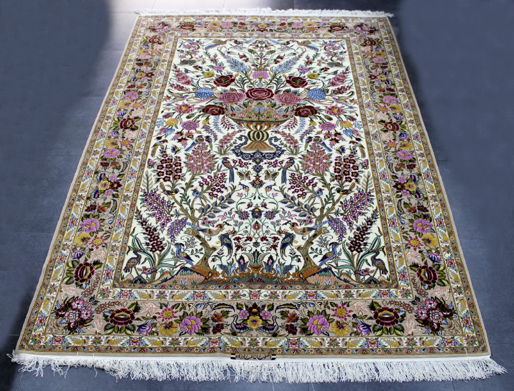 سجادة أصفهان ممضية عماد زادة صوف كُرك ولونين حرير فيها 60 قطبة بالـ7سم شغل يدوي ايراني العجمي