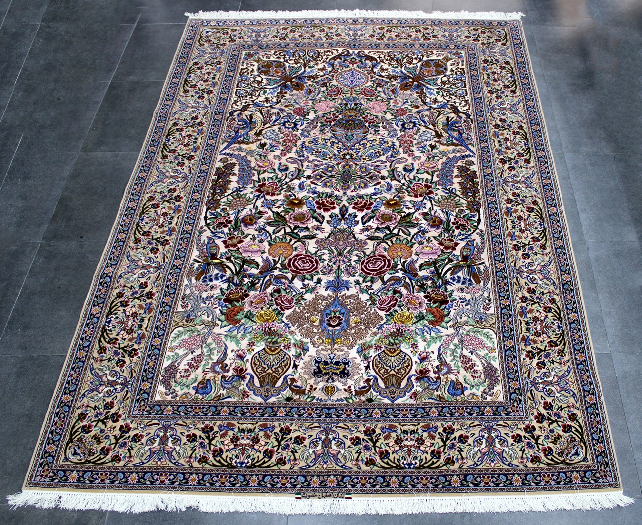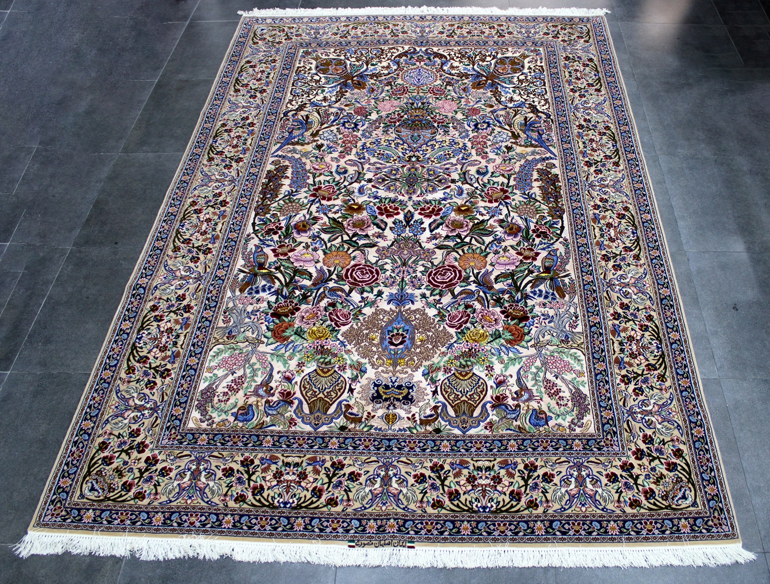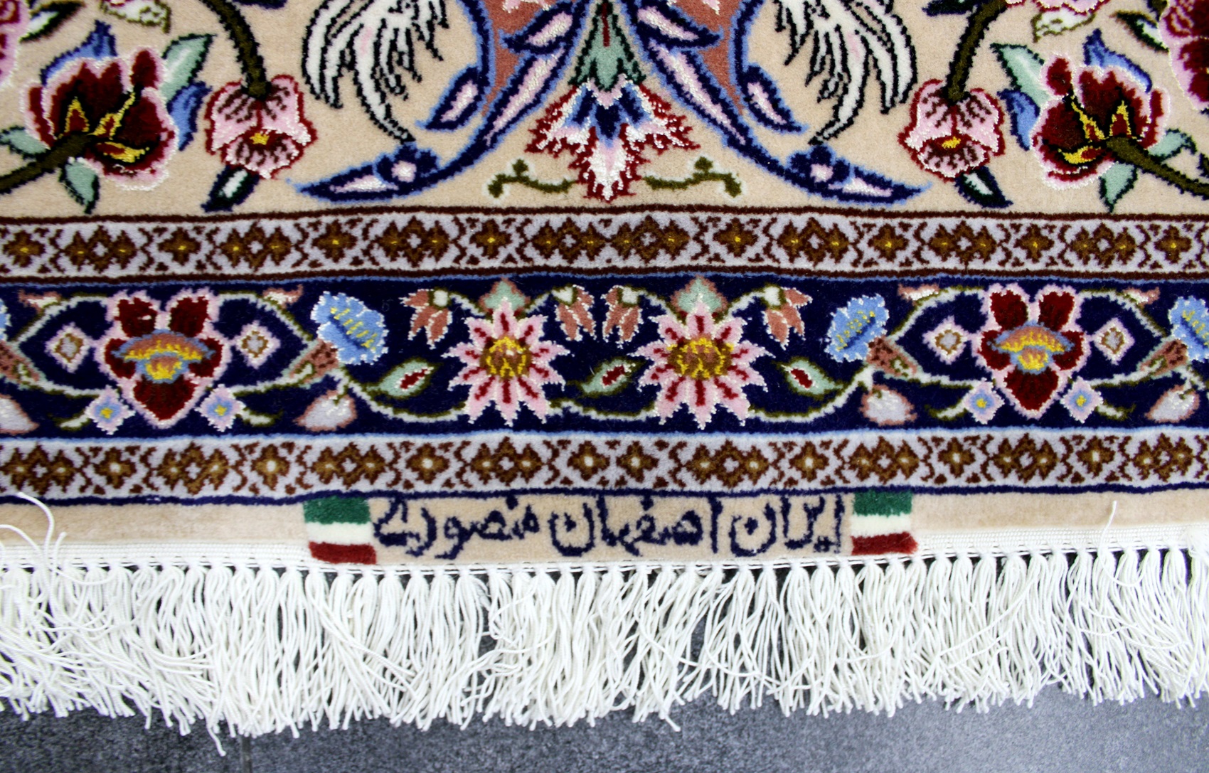سجادة أصفهان ممضية (منصوري) صوف كُرك وكف حرير (80% من السجادة حرير) وفيها 60 قطبة بالـ7سم شغل يدوي ايراني العجمي