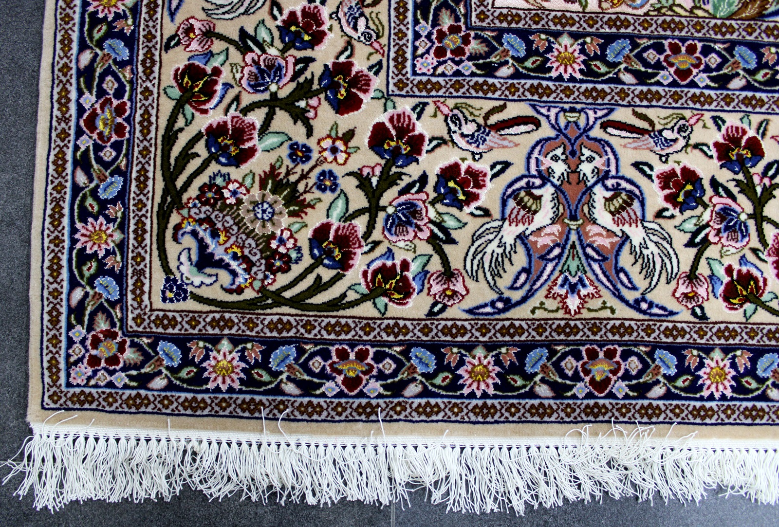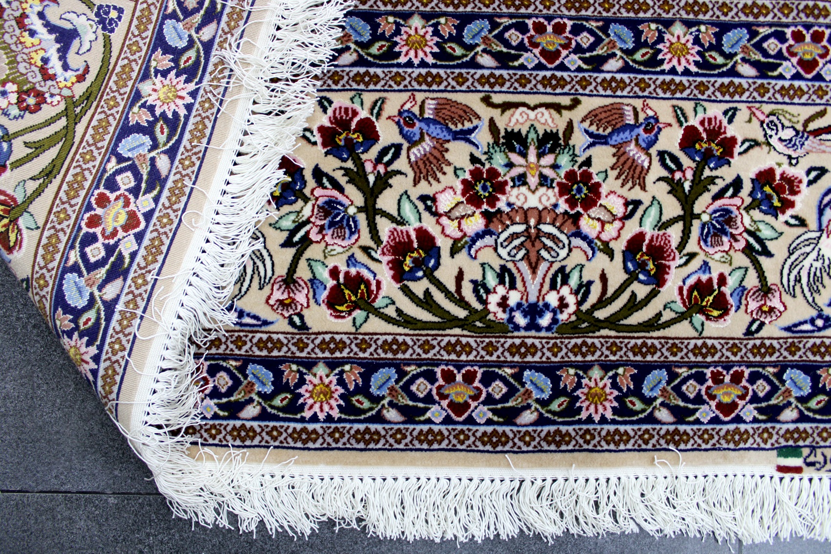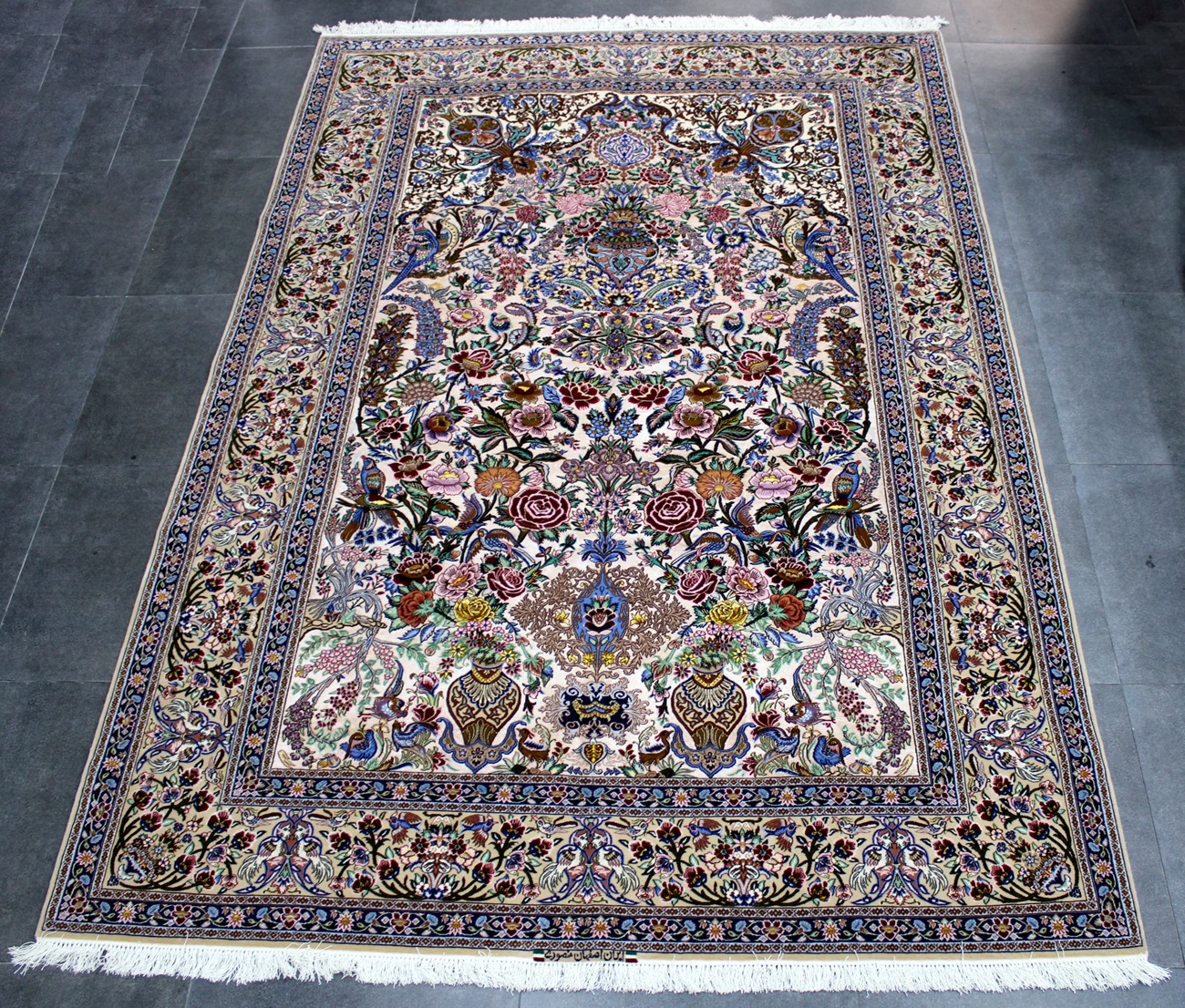 سجادة أصفهان ممضية (منصوري) صوف كُرك وكف حرير (80% من السجادة حرير) وفيها 60 قطبة بالـ7سم شغل يدوي ايراني العجمي