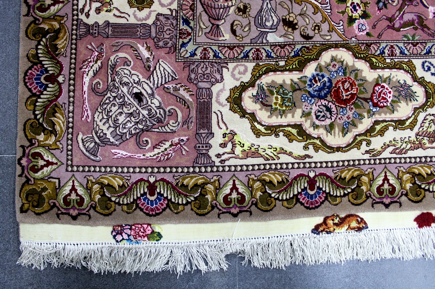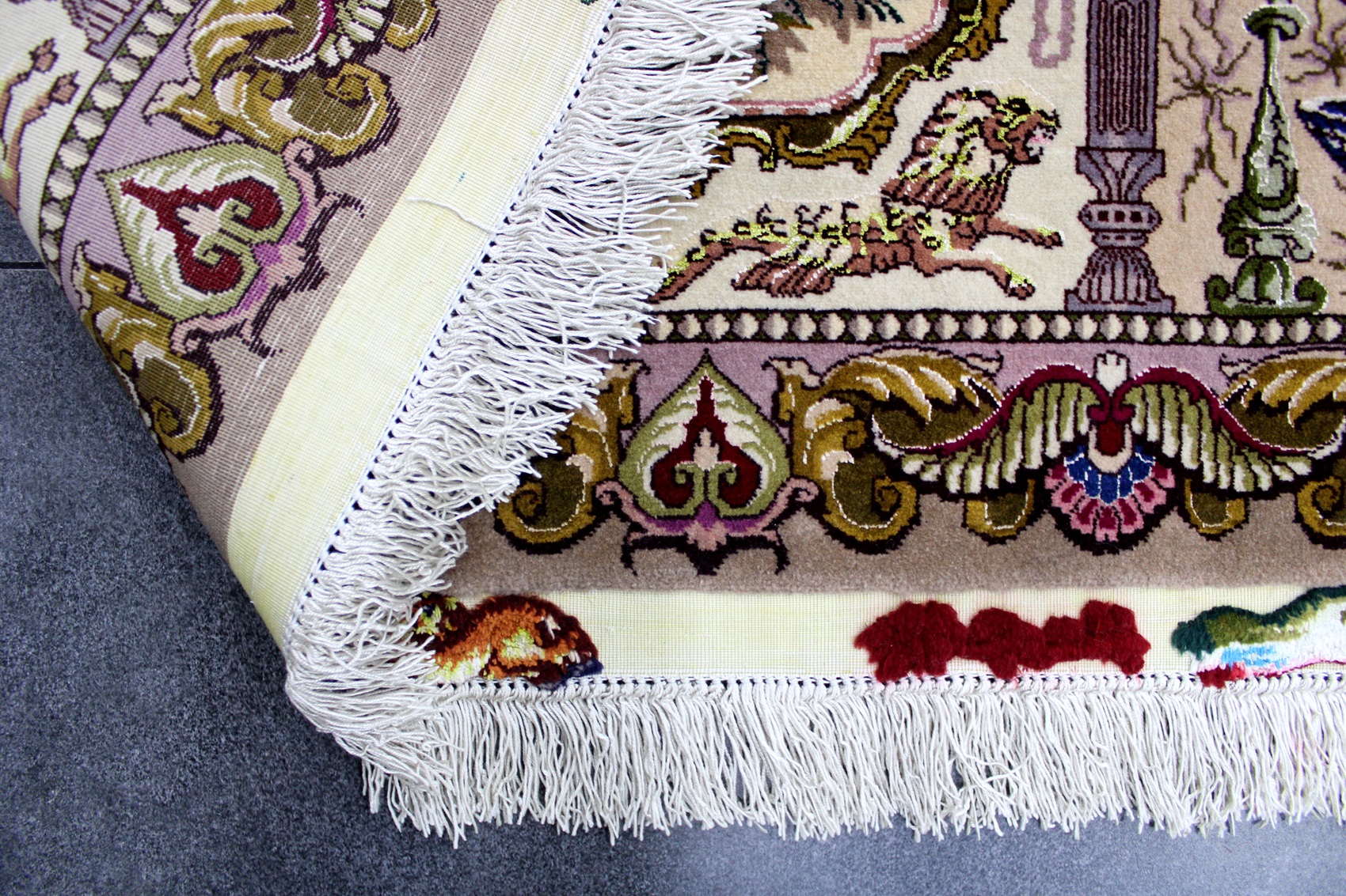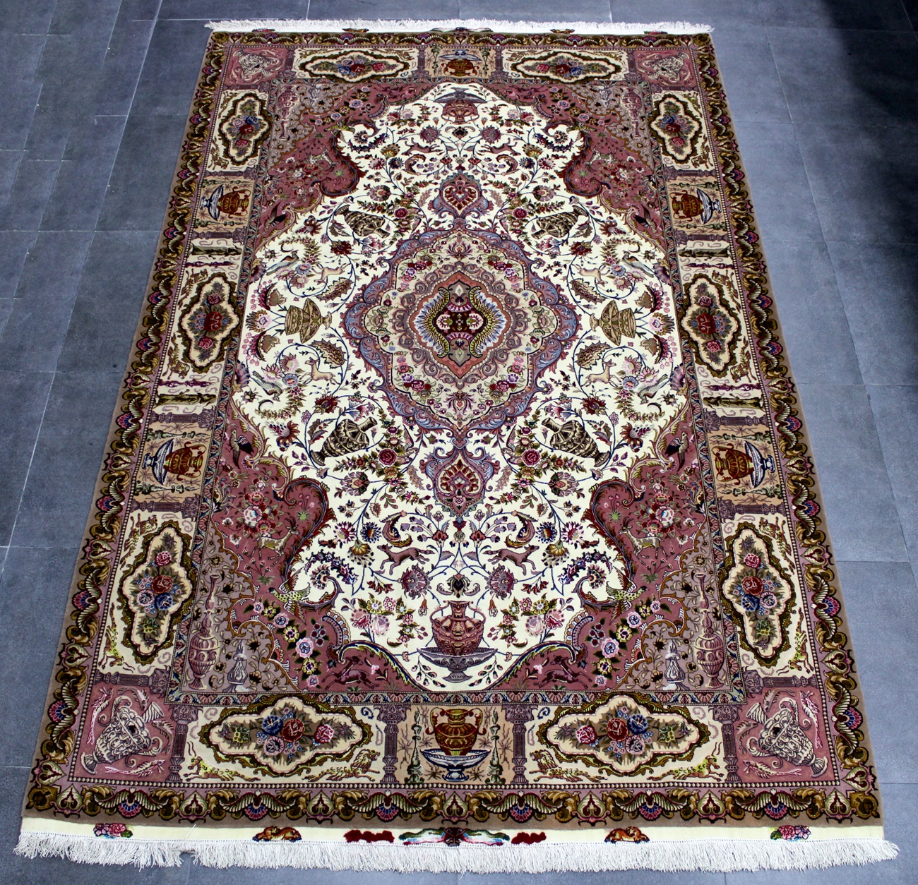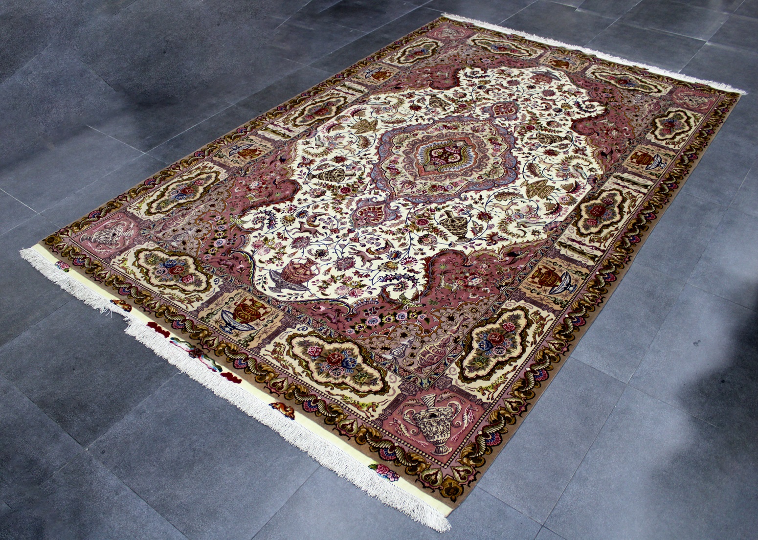 سجادة تبريز جوهر نقشة (كولينامي) عمرها فوق 5 سنين صوف كُرك ومد حرير وفيها 4 ألوان حرير وفيها 60 قطبة بالـ7سم شغل يدوي ايراني العجمي