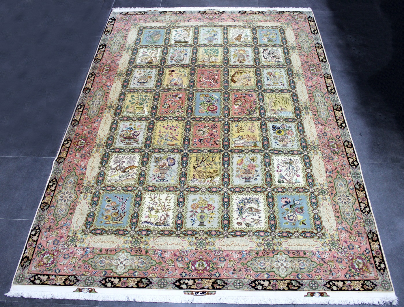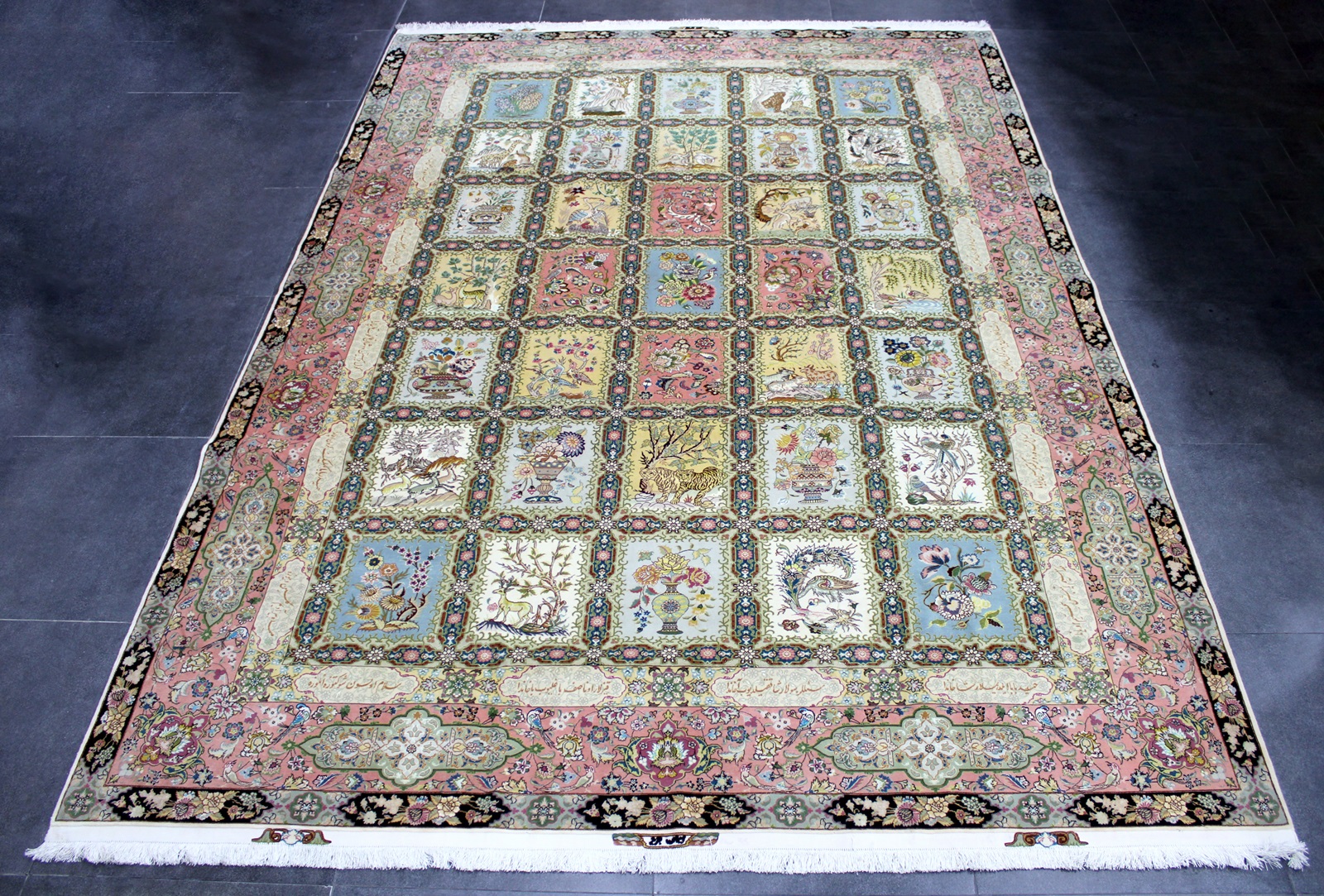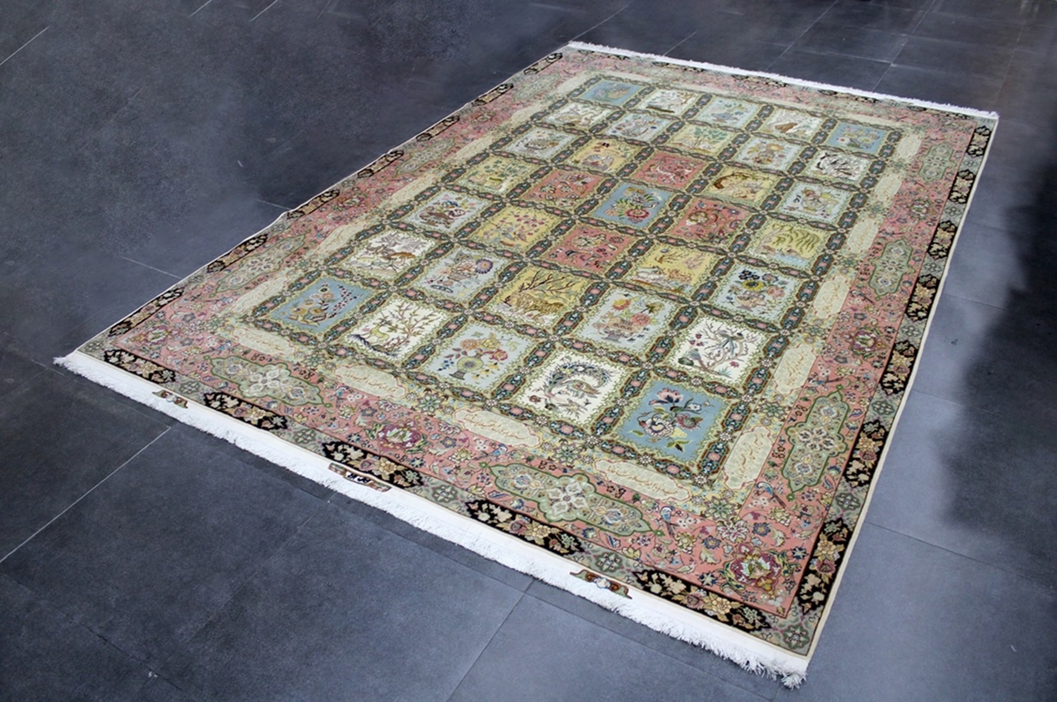 سجادة تبريز جوهر ممضية من الجهتين (إيران تبريز) نقشة الثُريا وفيها 35 تابلو عمرها فوق 5 سنين صوف كُرك ومد حرير وفيها 4 ألوان حرير وفيها 60 قطبة بالـ7سم شغل يدوي ايراني العجمي