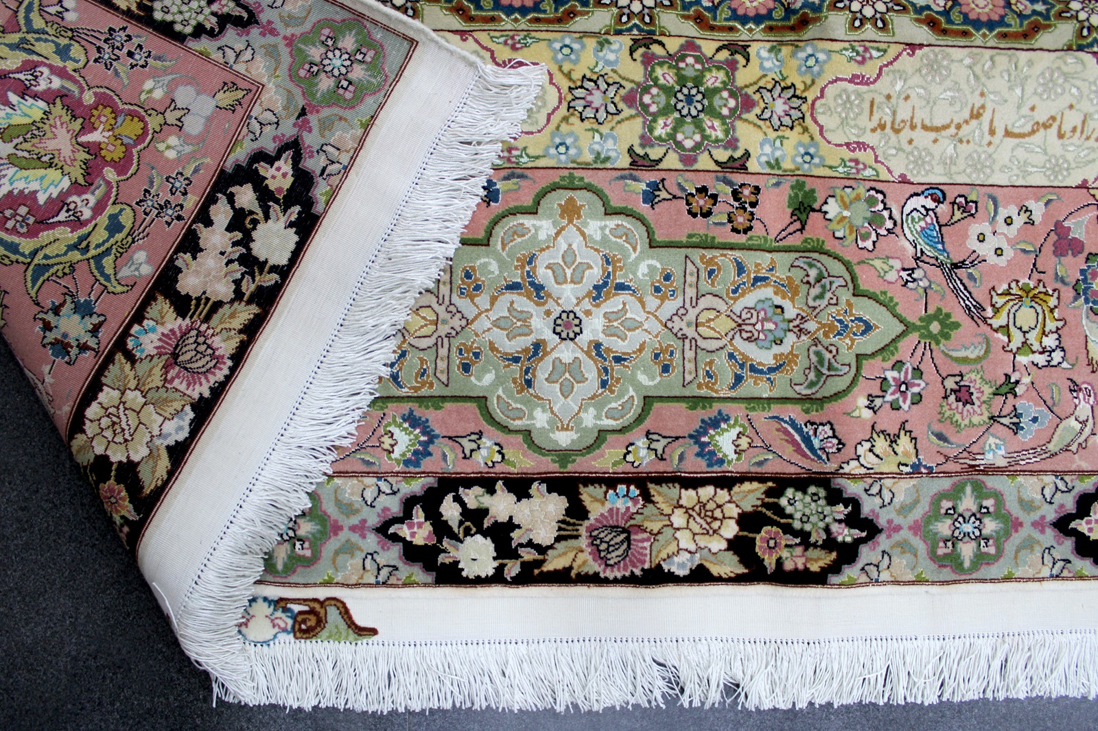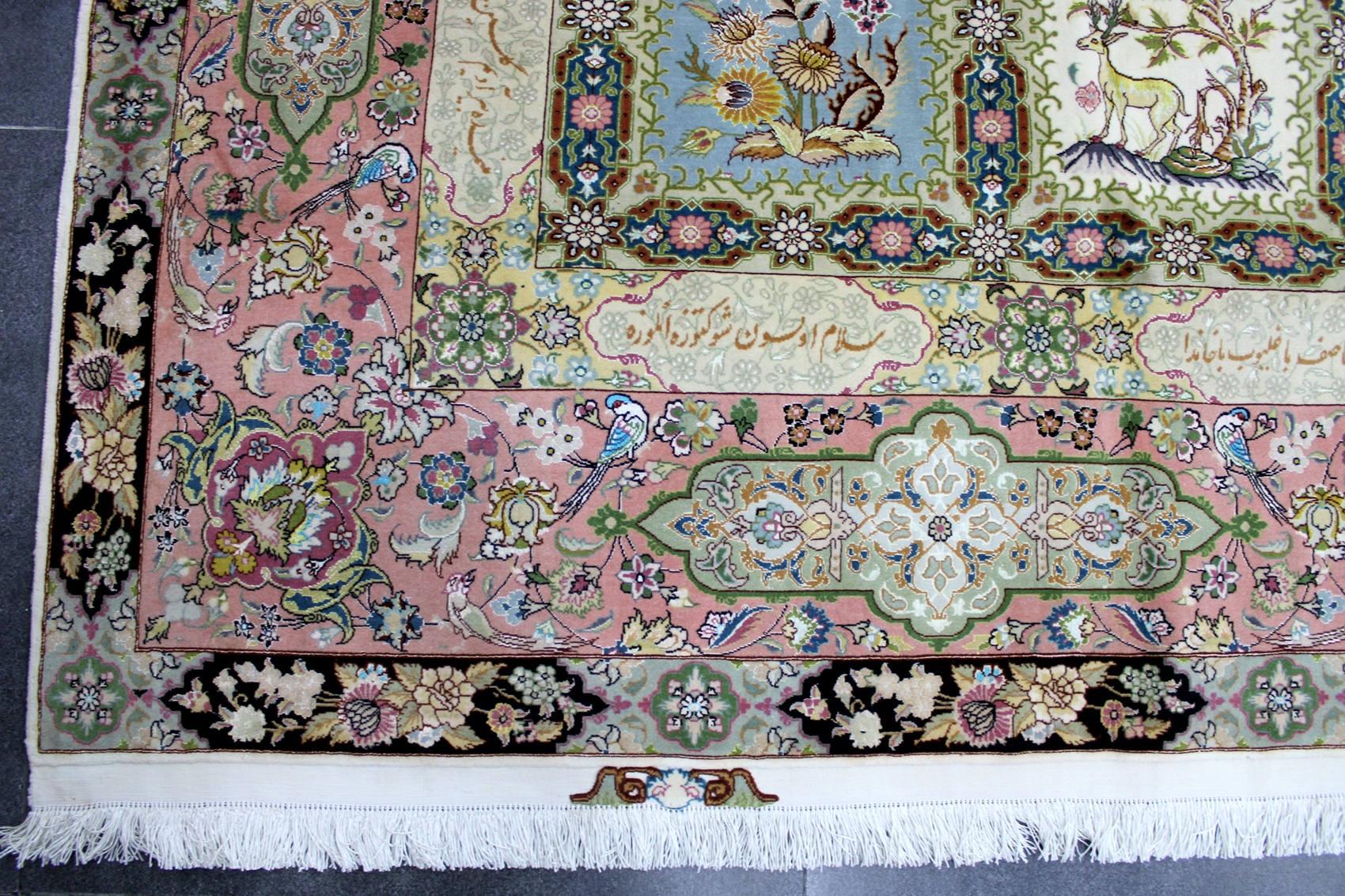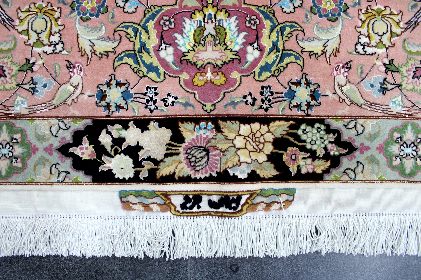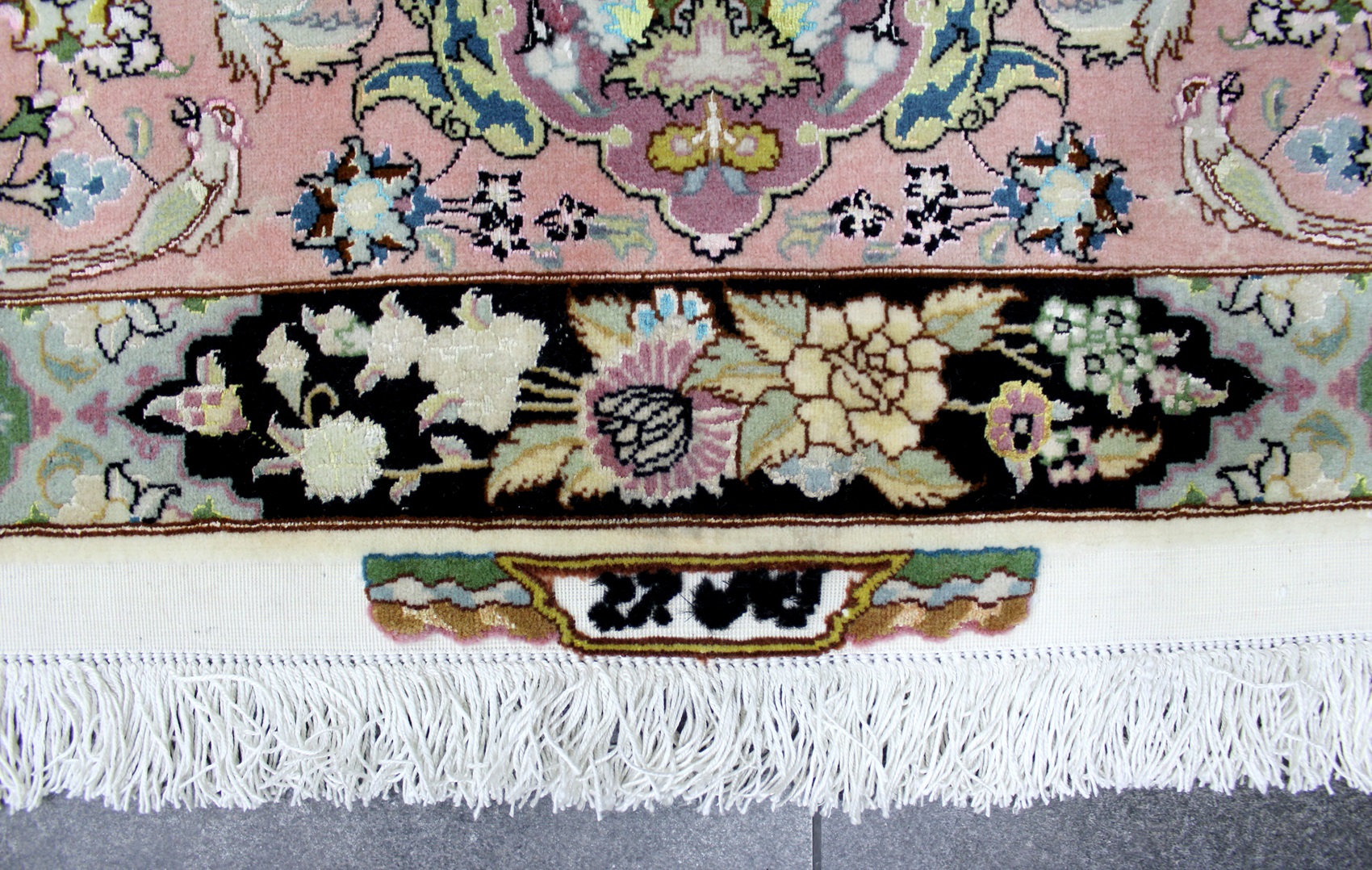 سجادة تبريز جوهر ممضية من الجهتين (إيران تبريز) نقشة الثُريا وفيها 35 تابلو عمرها فوق 5 سنين صوف كُرك ومد حرير وفيها 4 ألوان حرير وفيها 60 قطبة بالـ7سم شغل يدوي ايراني العجمي