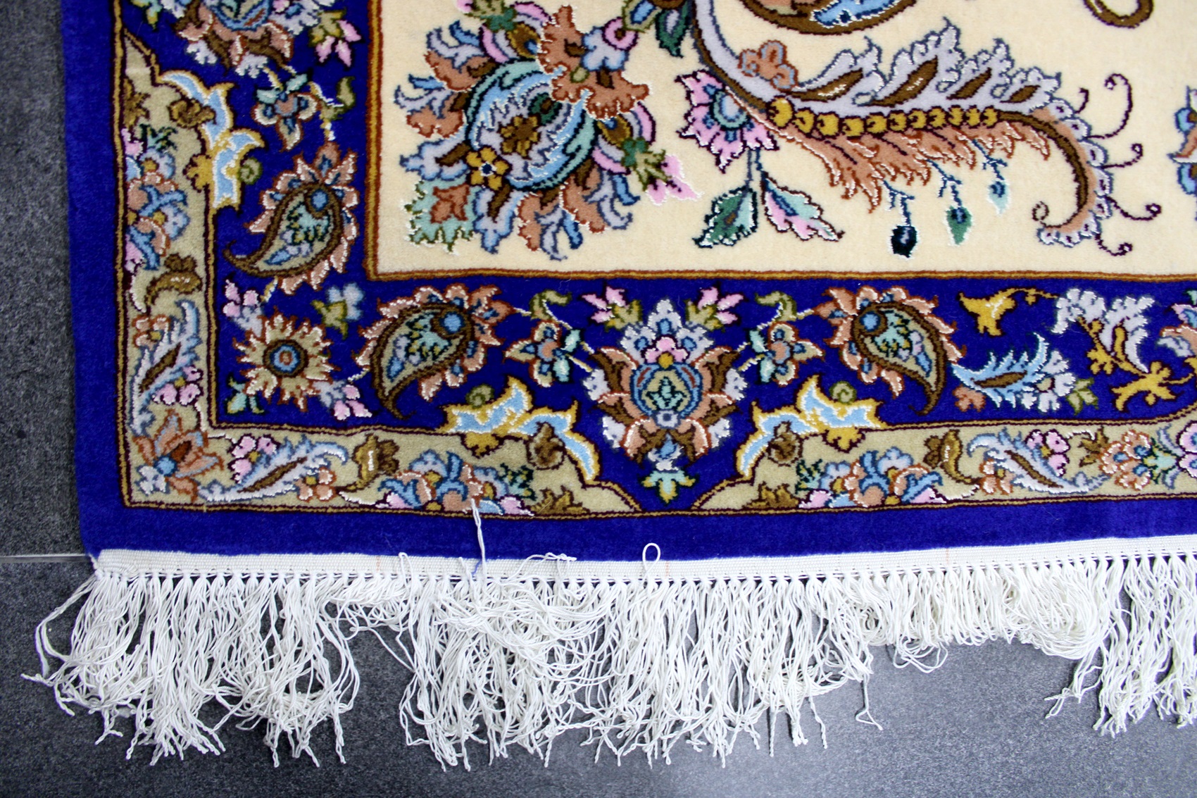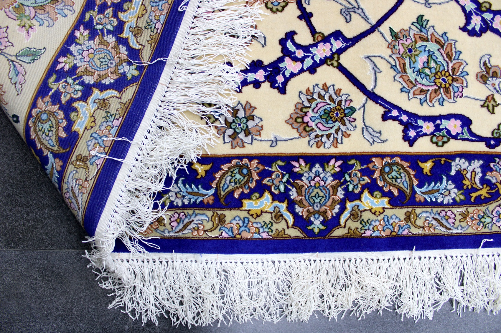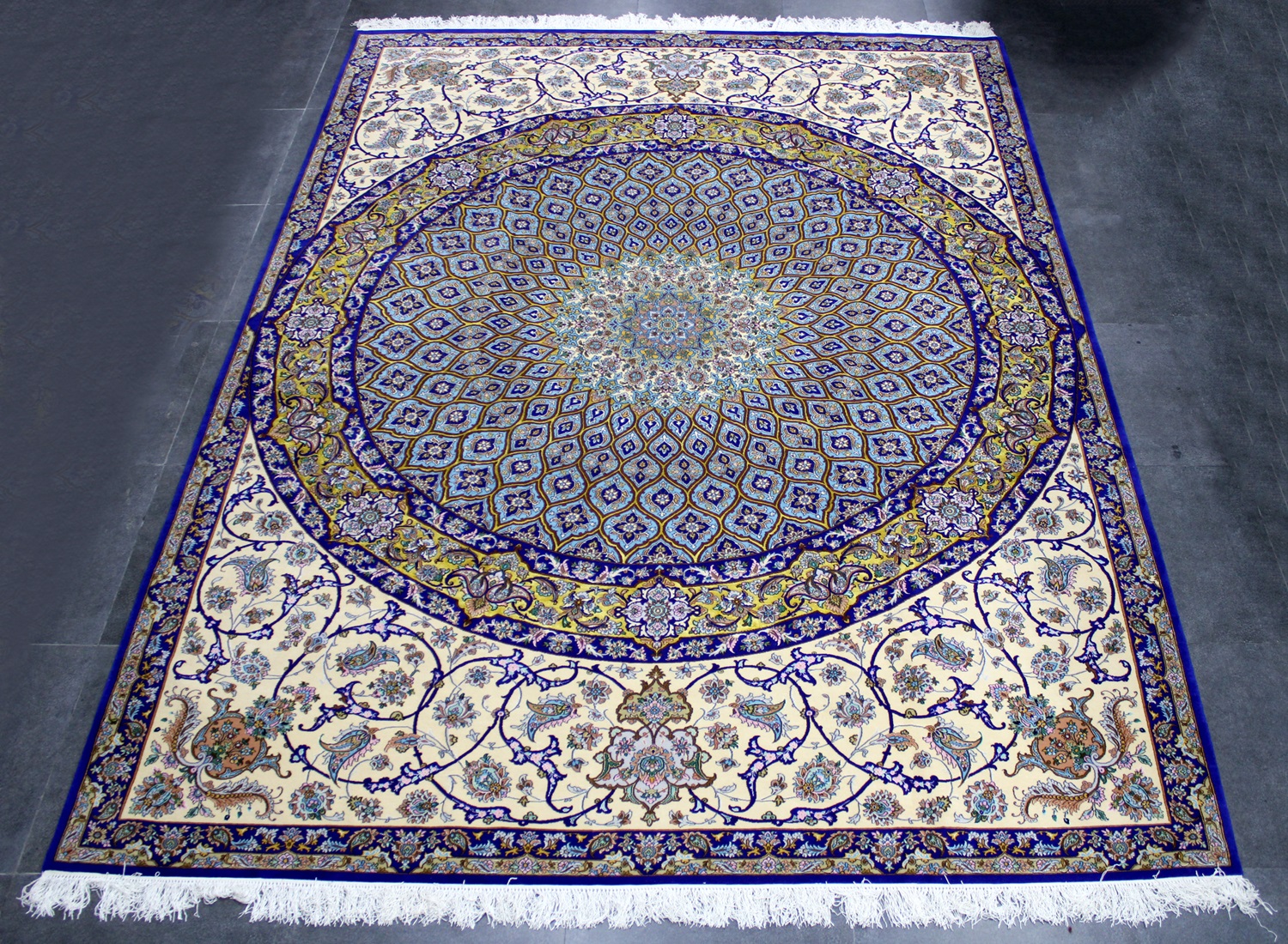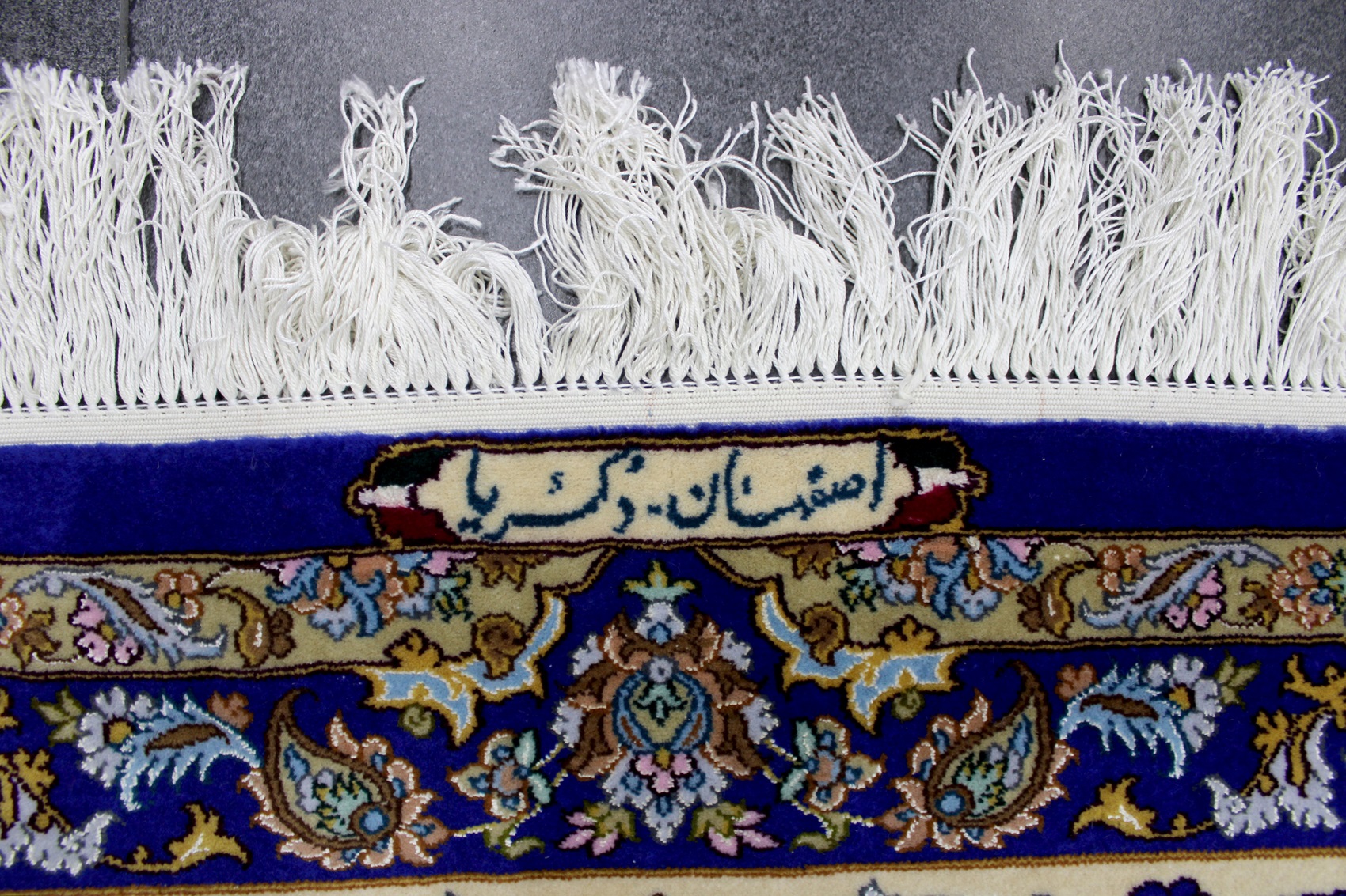 سجادة أصفهان ممضية (زكريا) نقشة (كنبد) صوف كُرك ولونين حرير فيها 60 قطبة بالـ7سم شغل يدوي ايراني العجمي
